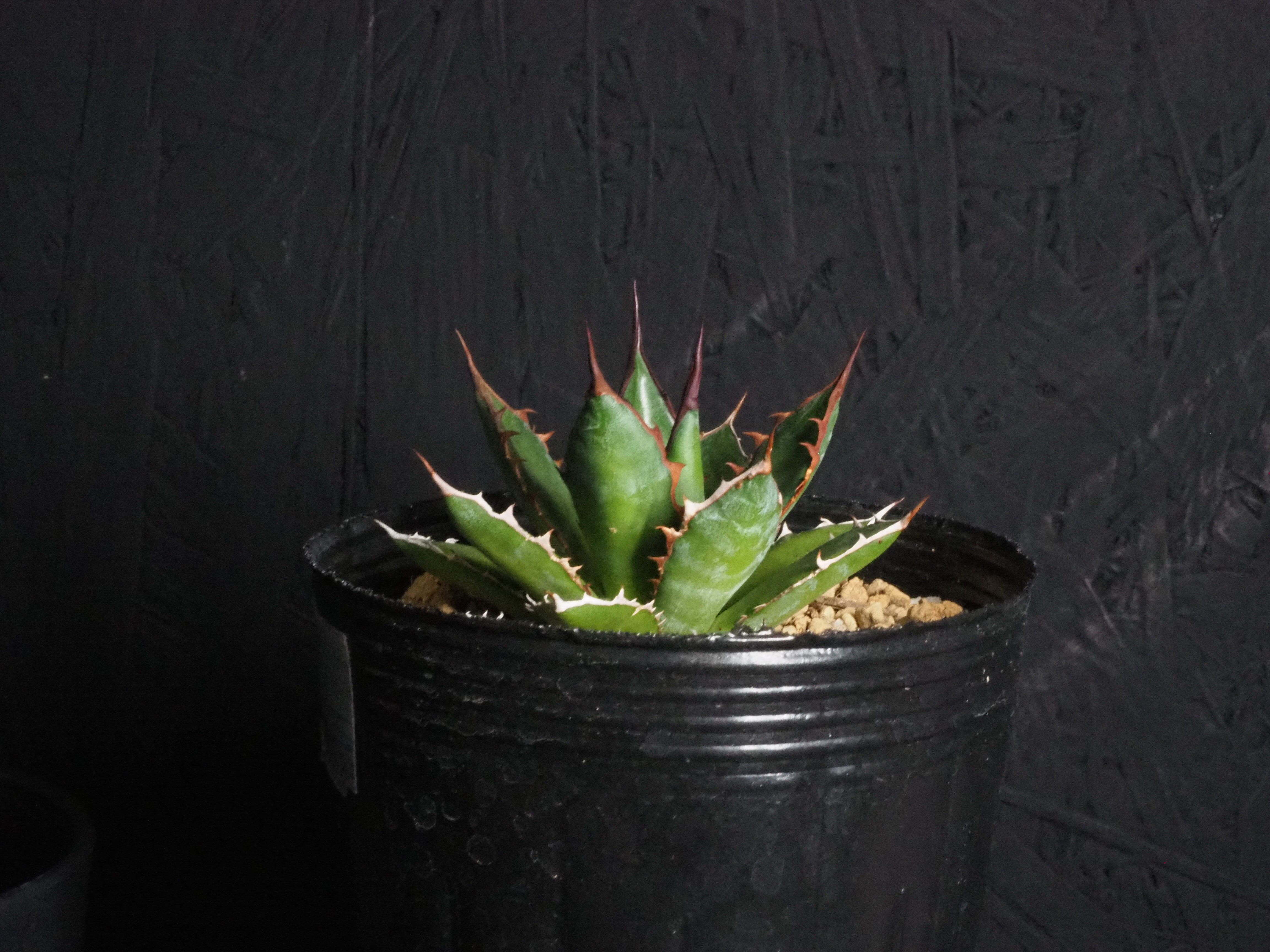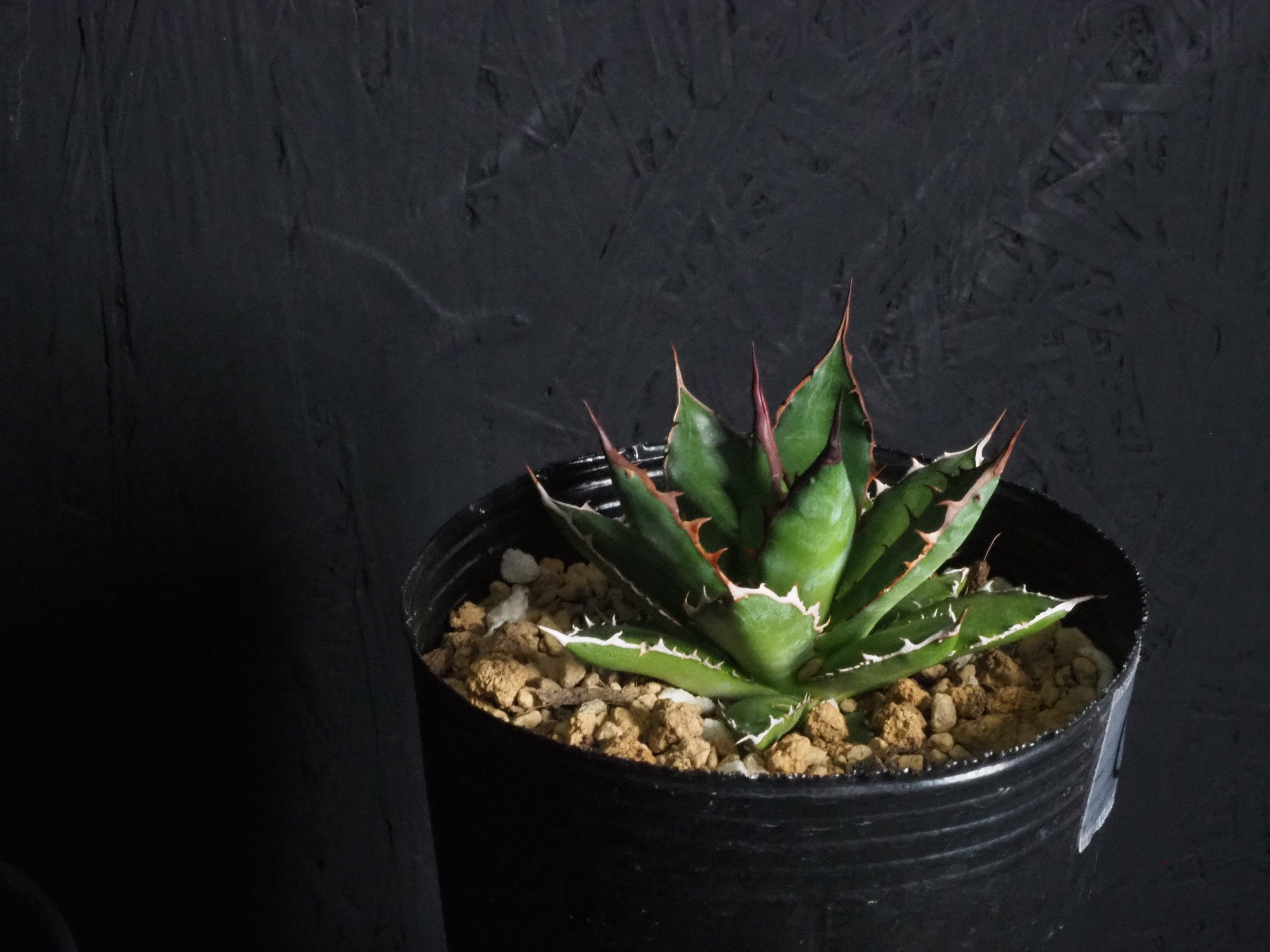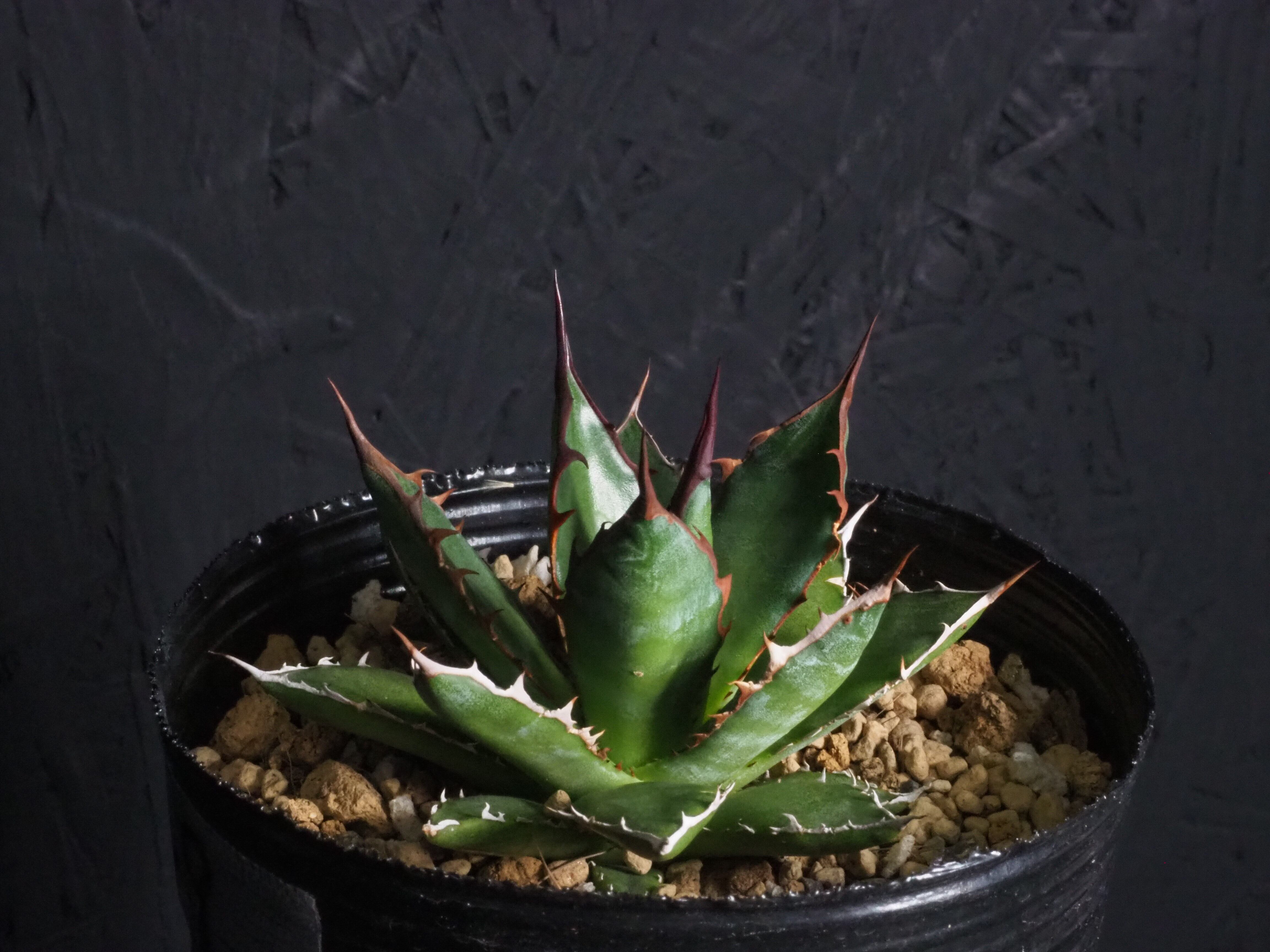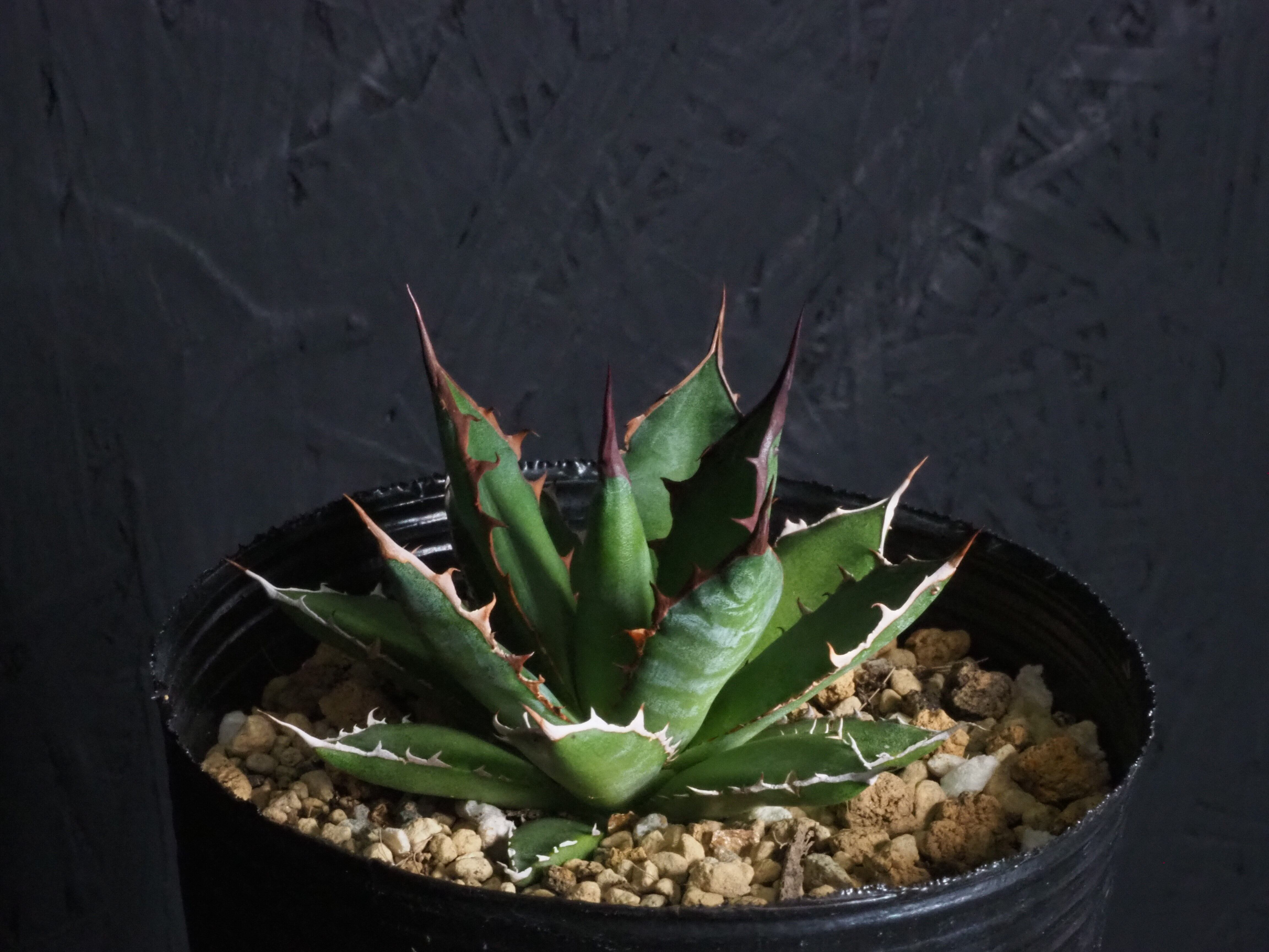 アガベの中型種ホリダ、シャープな葉と強烈な棘が特徴のアガベのトップランカーです。小型~中型であまり大きくならないのが特徴。地植えでは70~80㎝になりますが、締めて管理すれば直径30㎝以内に保つことも可能なアガベです。生長と共に厳つい葉が勢いよく天に向かって伸びる様は本当にカッコイイです。幼体型の内は強い日光は葉焼けを起こしやすいので、環境変化や季節の変わり目は要注意です。少し遮光して管理してあげると調子よくご機嫌ですよ。成株では耐寒性は零下4度くらいまで。この子のようにまだ子株の内は凍結はNGです。