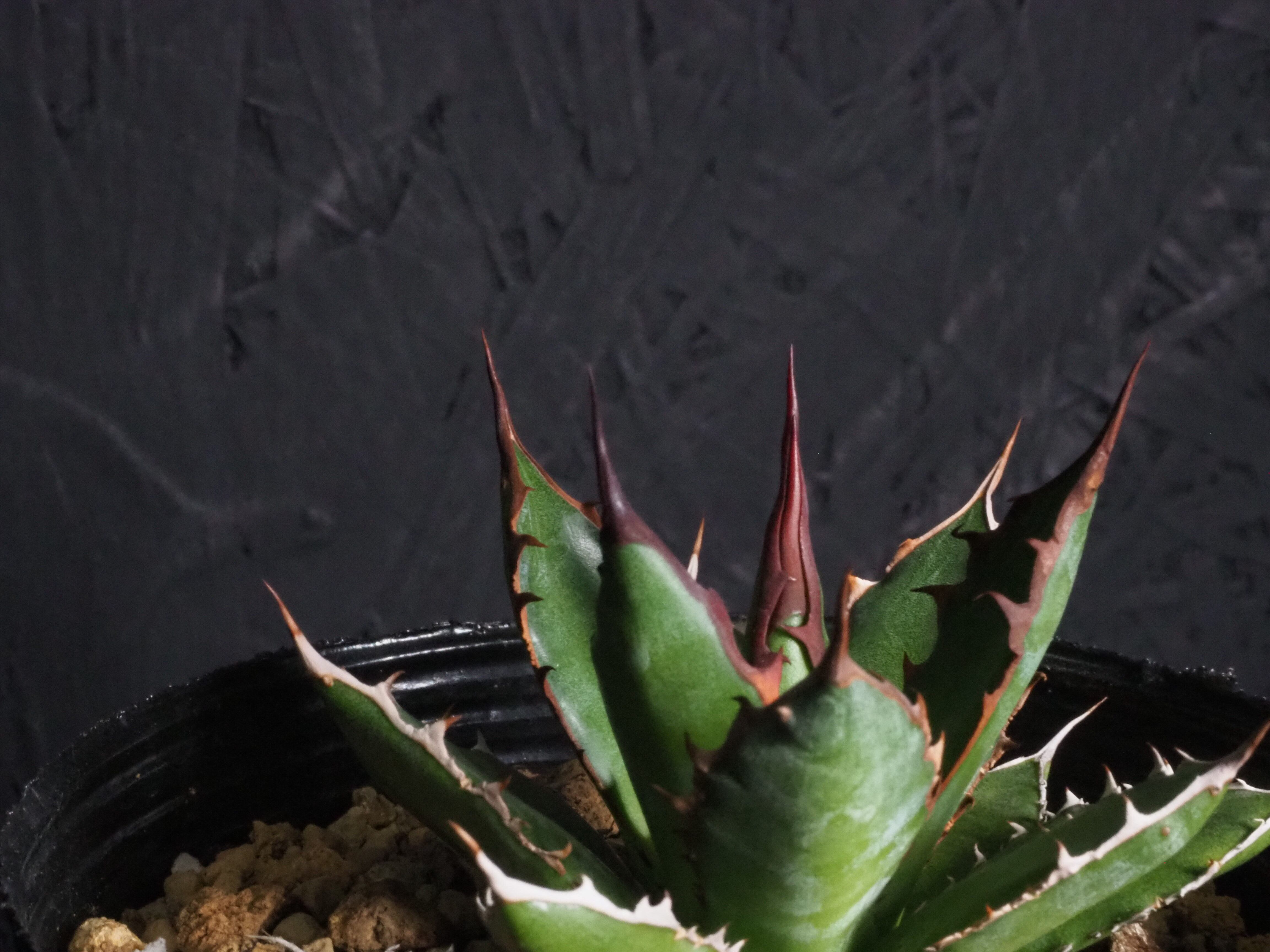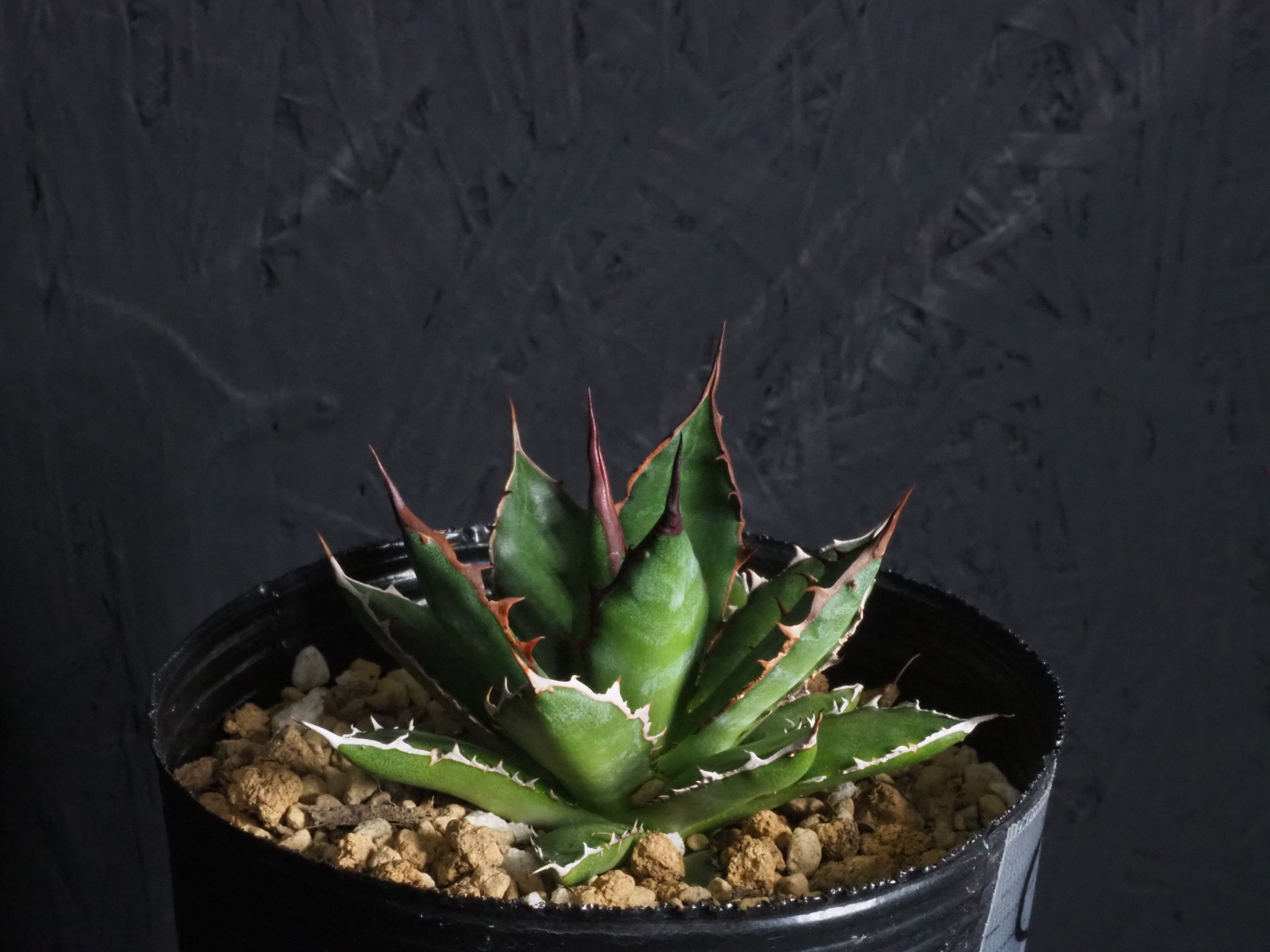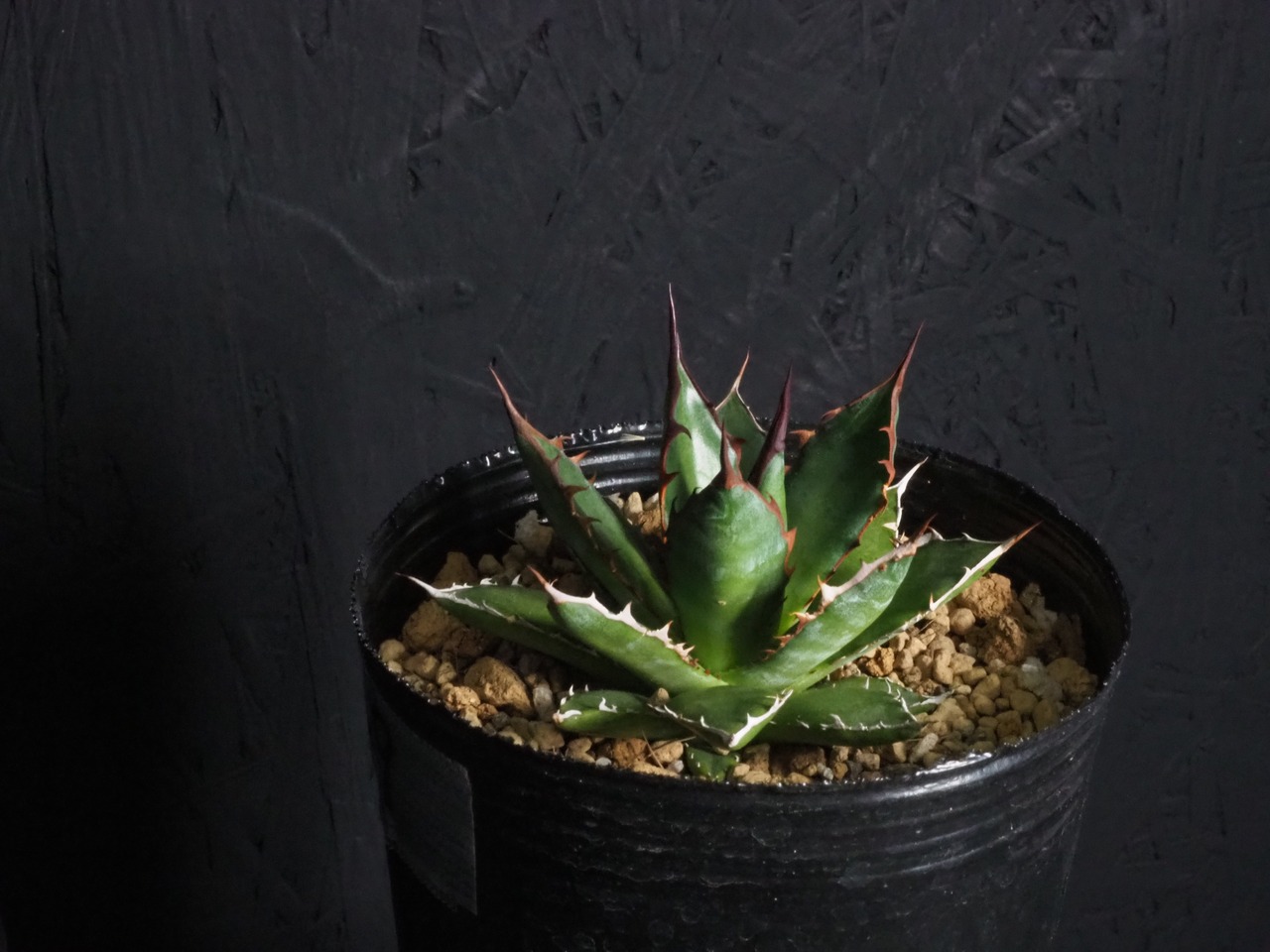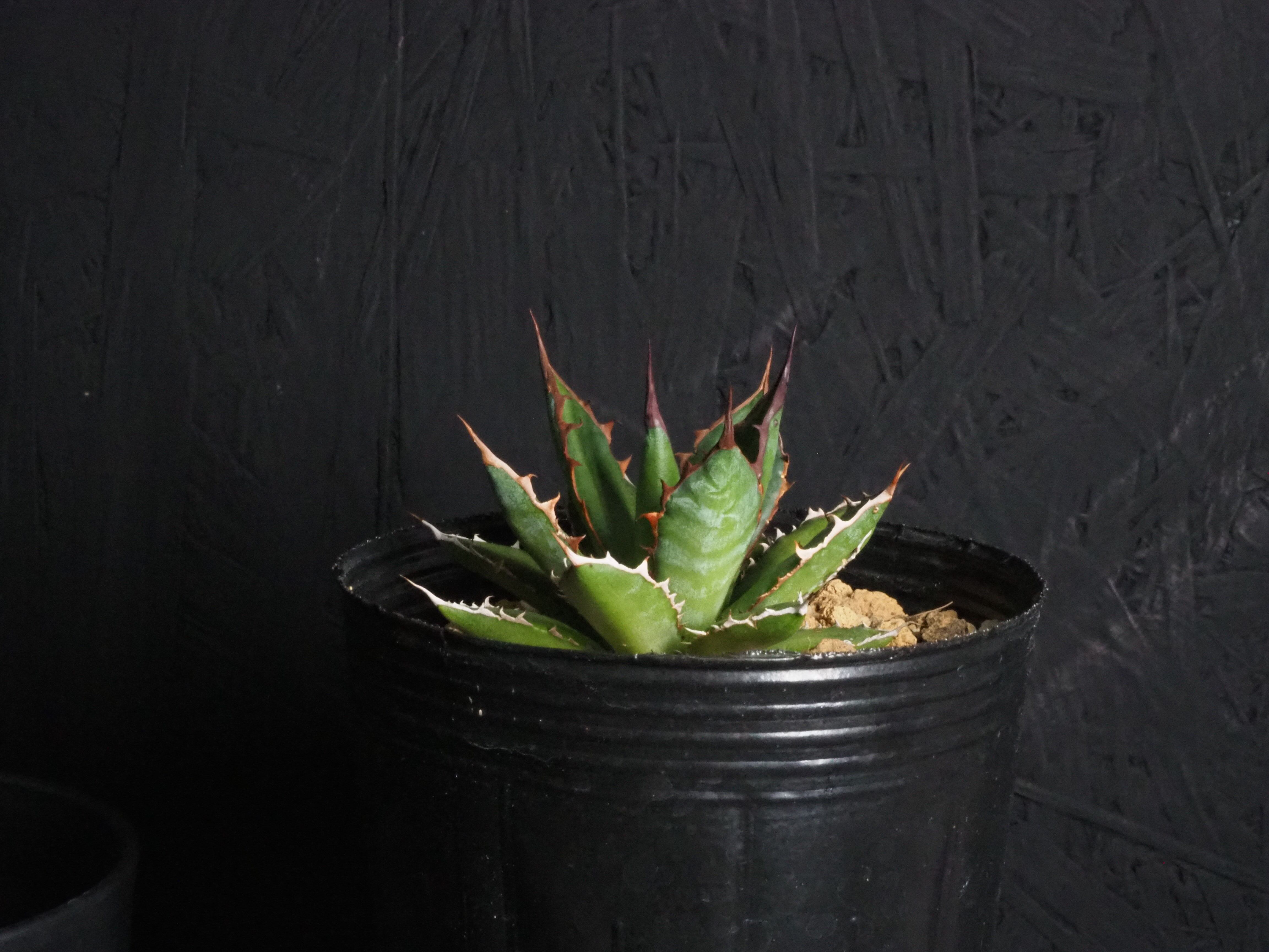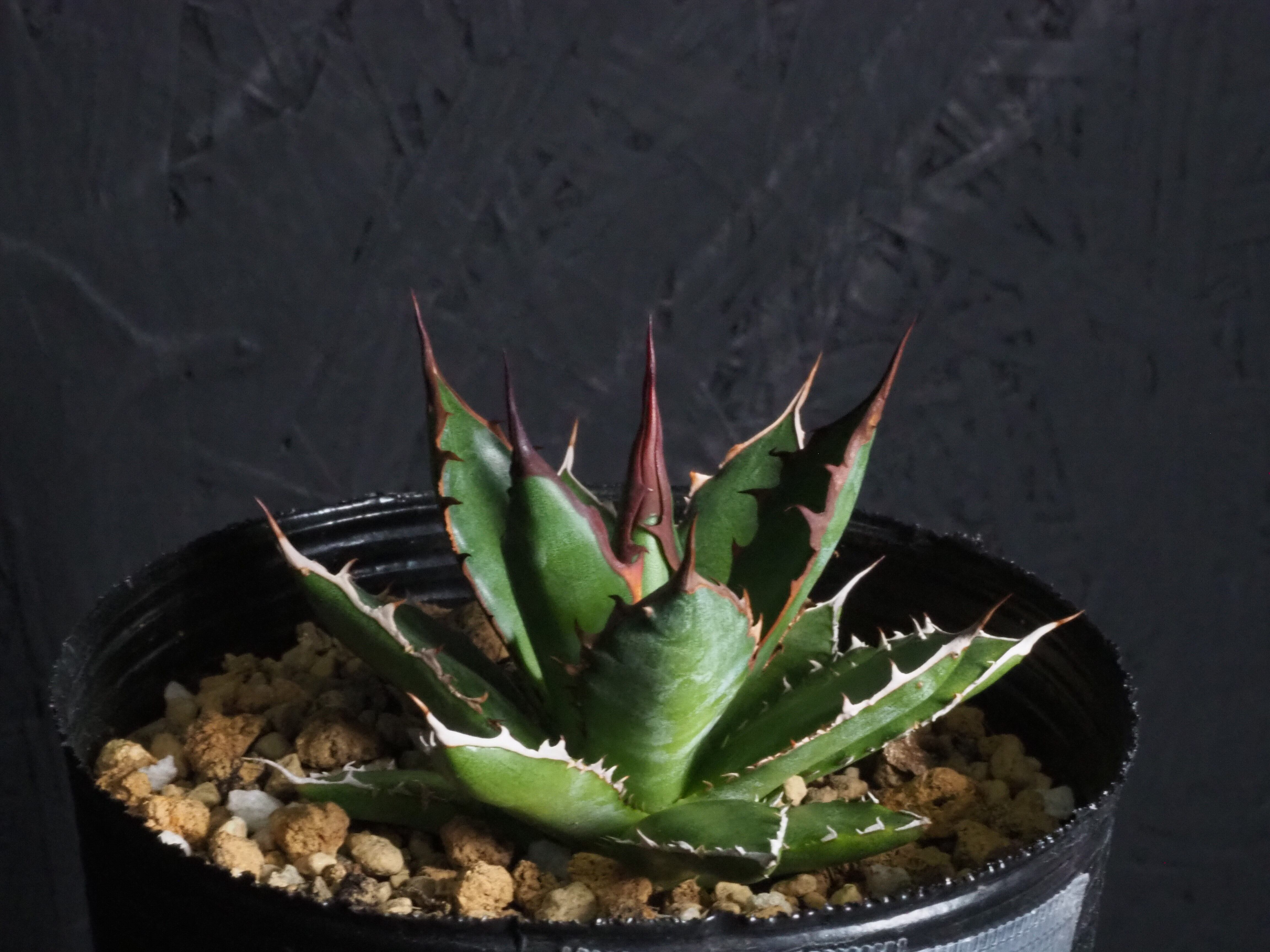 アガベの中型種ホリダ、シャープな葉と強烈な棘が特徴のアガベのトップランカーです。小型~中型であまり大きくならないのが特徴。地植えでは70~80㎝になりますが、締めて管理すれば直径30㎝以内に保つことも可能なアガベです。生長と共に厳つい葉が勢いよく天に向かって伸びる様は本当にカッコイイです。幼体型の内は強い日光は葉焼けを起こしやすいので、環境変化や季節の変わり目は要注意です。少し遮光して管理してあげると調子よくご機嫌ですよ。成株では耐寒性は零下4度くらいまで。この子のようにまだ子株の内は凍結はNGです。