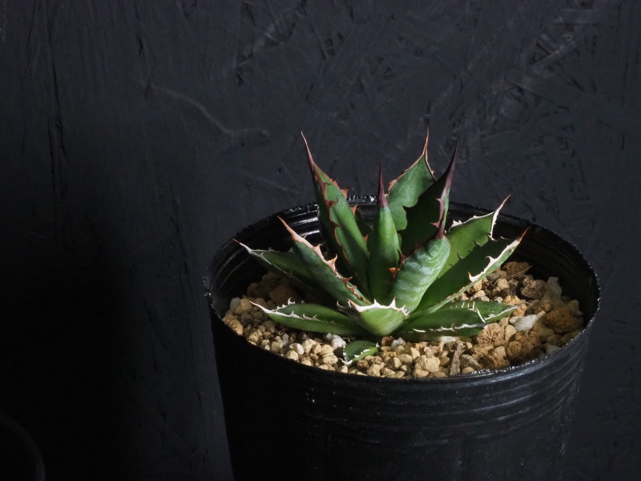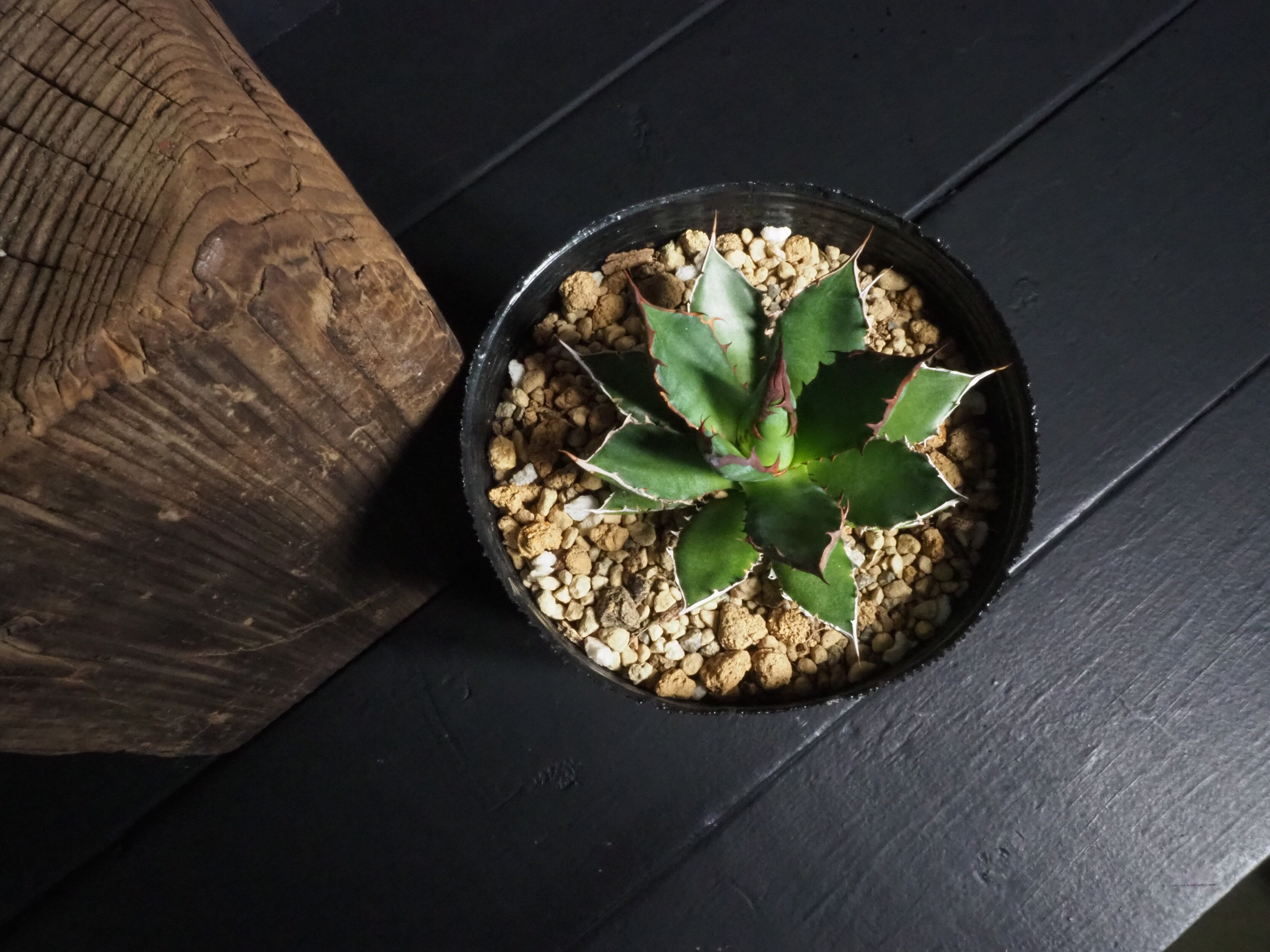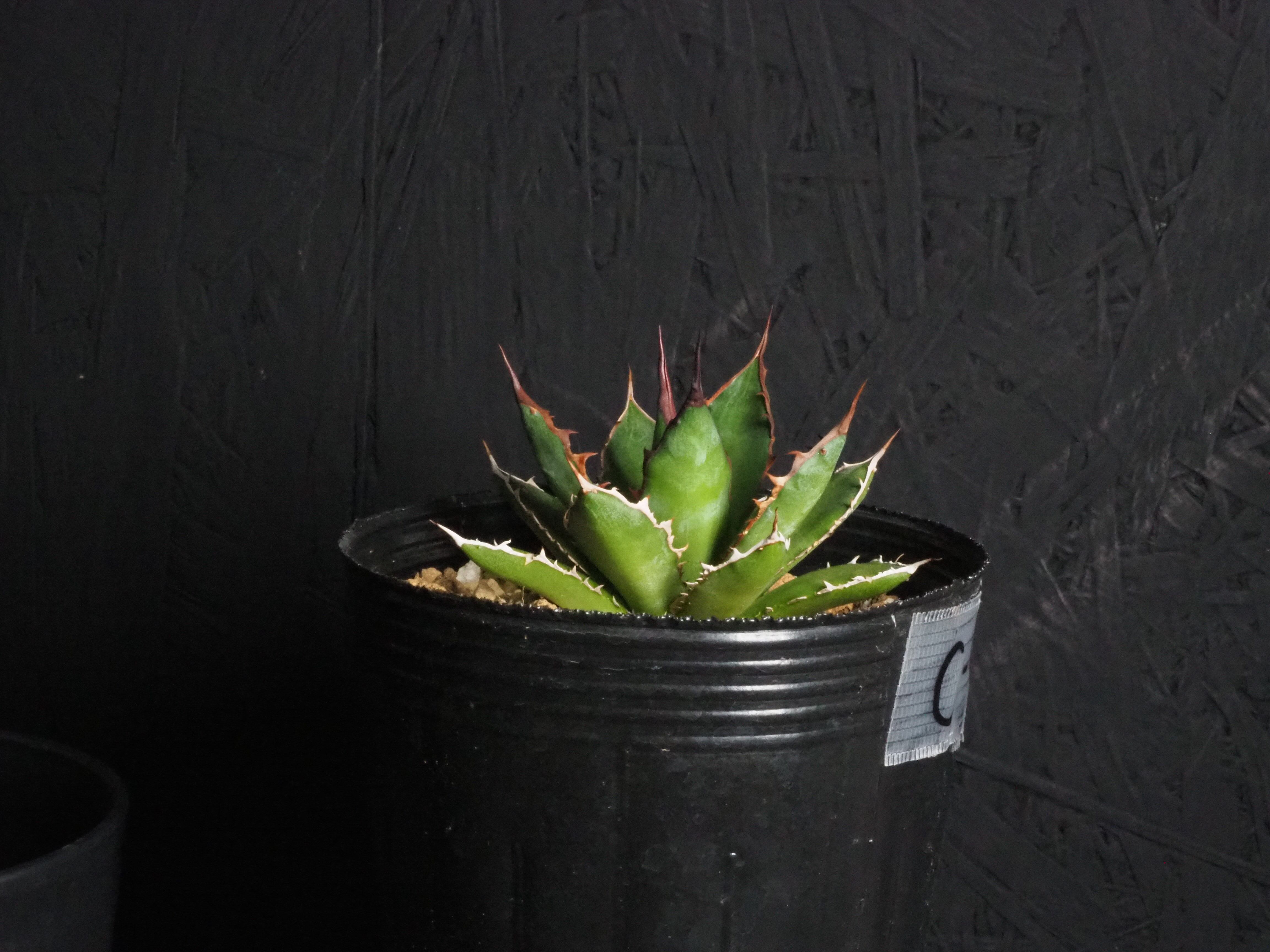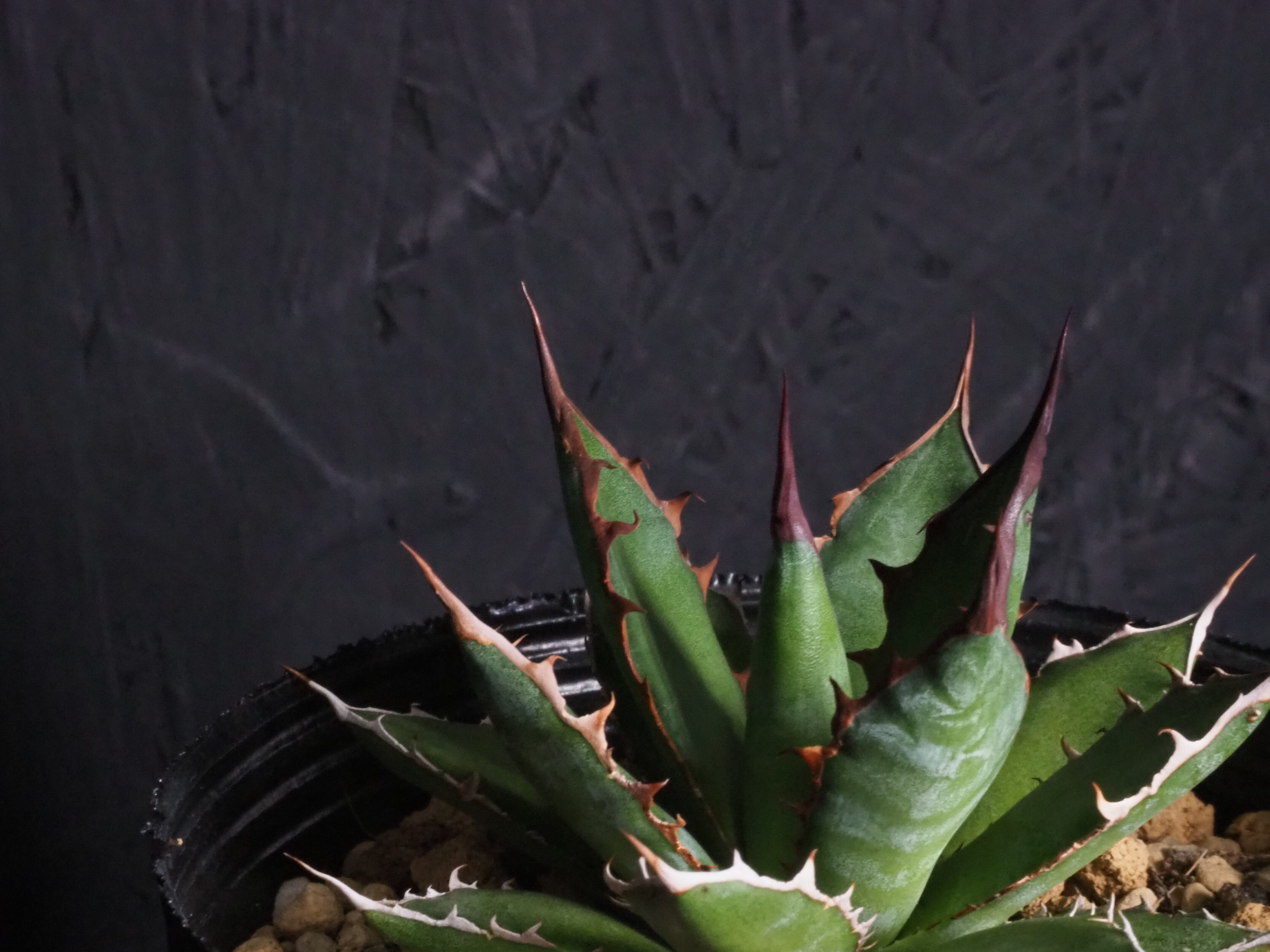 アガベの中型種ホリダ、シャープな葉と強烈な棘が特徴のアガベのトップランカーです。小型~中型であまり大きくならないのが特徴。地植えでは70~80㎝になりますが、締めて管理すれば直径30㎝以内に保つことも可能なアガベです。生長と共に厳つい葉が勢いよく天に向かって伸びる様は本当にカッコイイです。幼体型の内は強い日光は葉焼けを起こしやすいので、環境変化や季節の変わり目は要注意です。少し遮光して管理してあげると調子よくご機嫌ですよ。成株では耐寒性は零下4度くらいまで。この子のようにまだ子株の内は凍結はNGです。