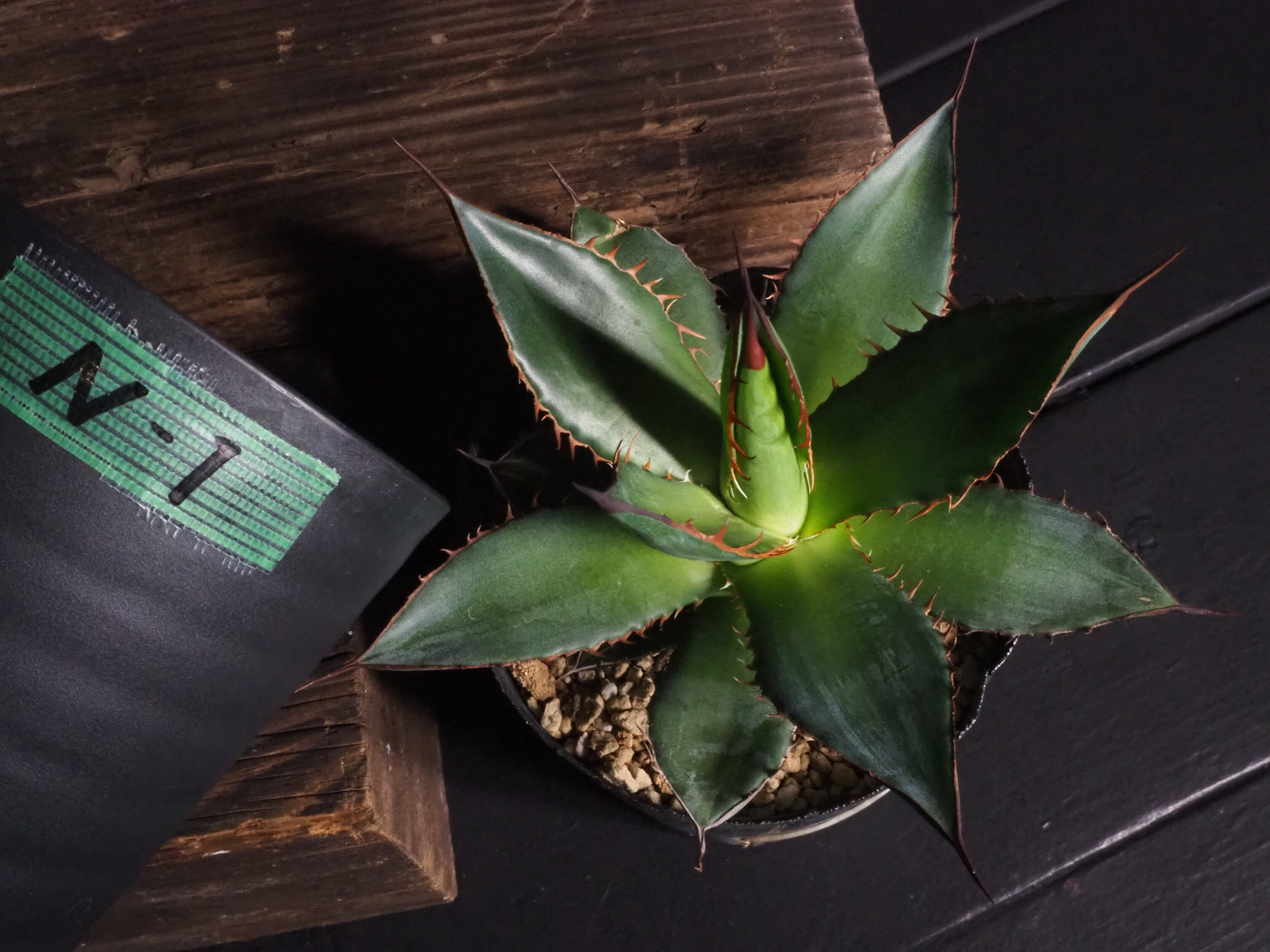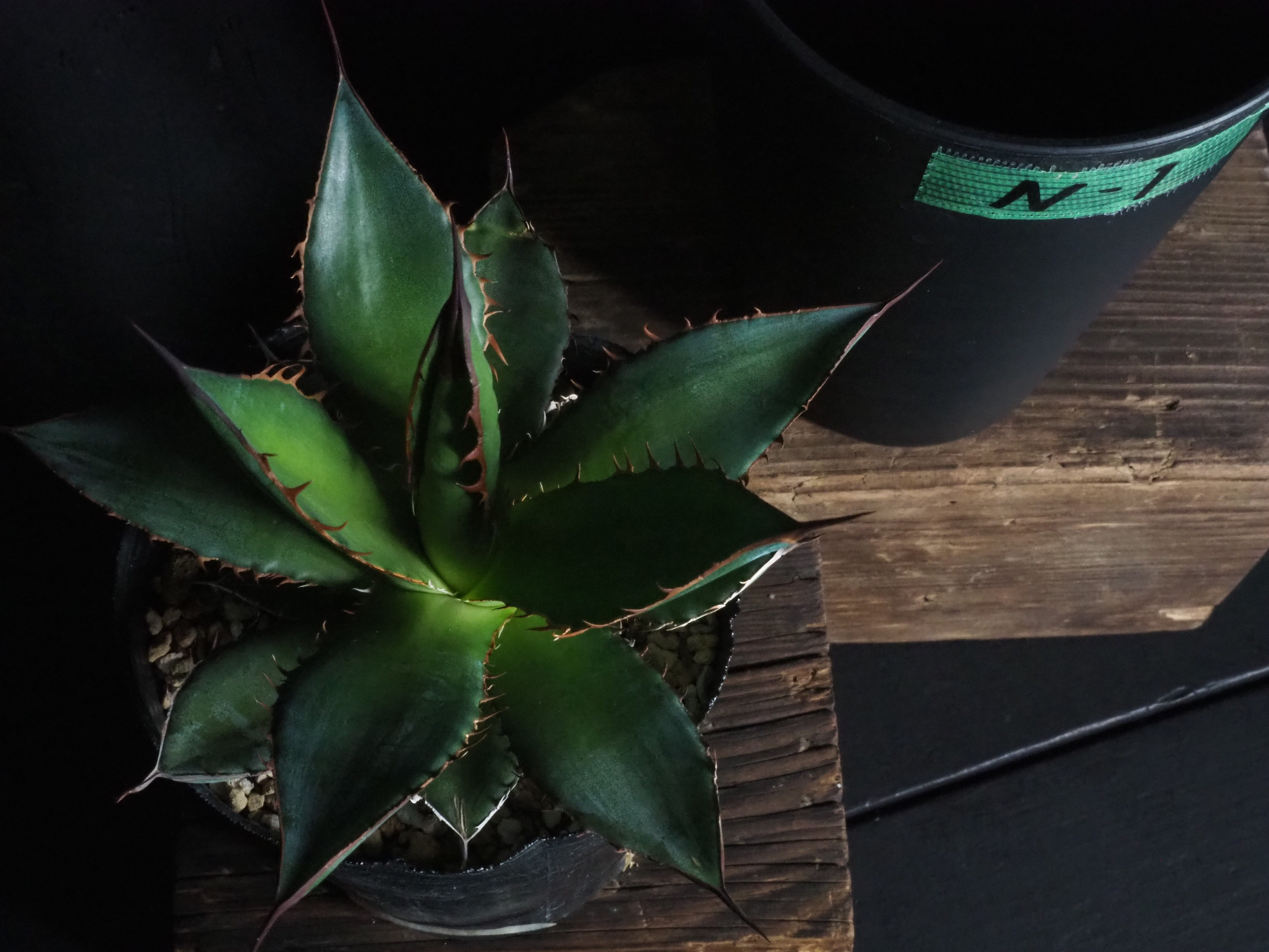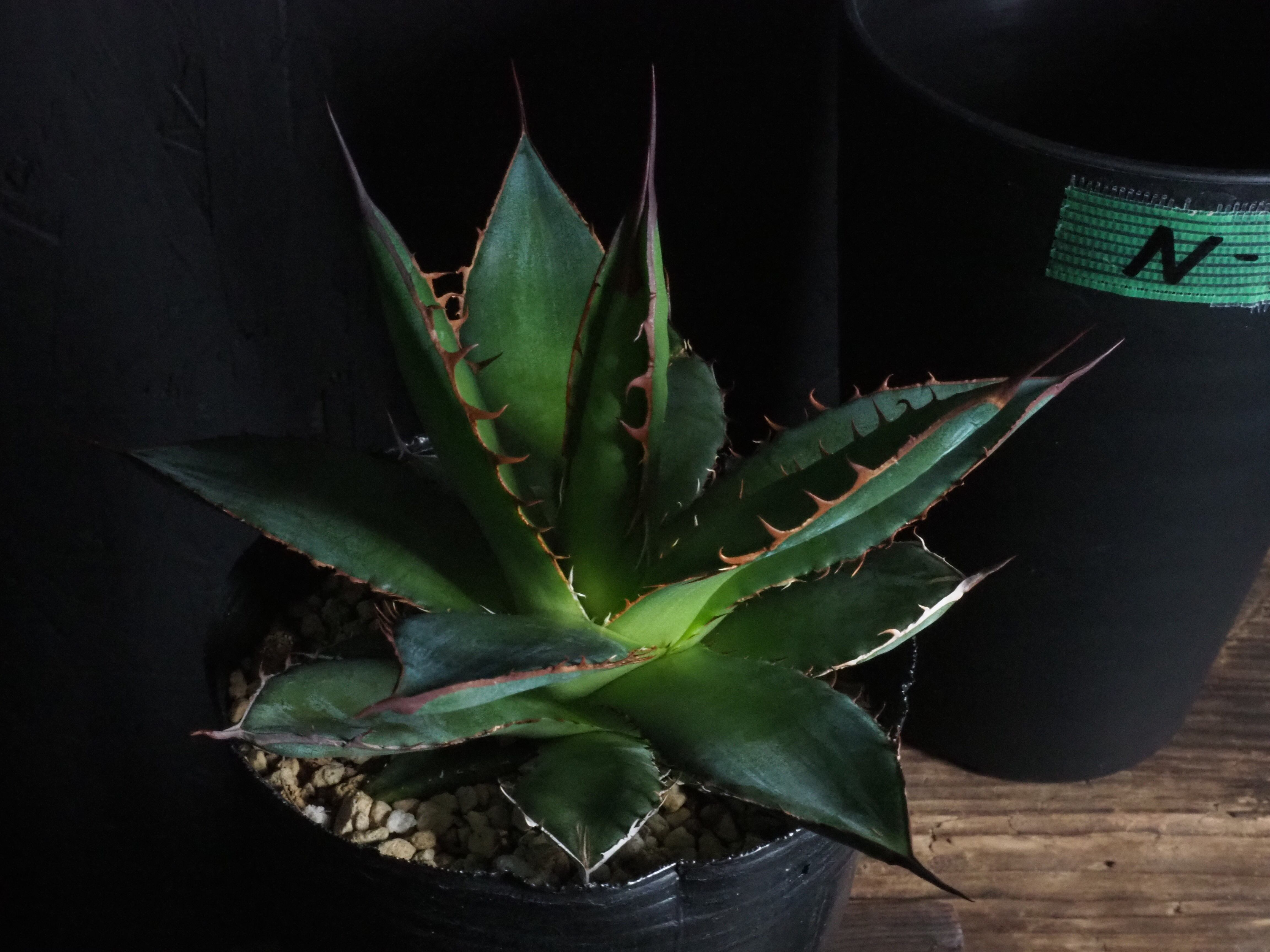 アガベの中型種ホリダ、シャープな葉と強烈な棘が特徴のアガベのトップランカーです。小型~中型であまり大きくならないのが特徴。地植えでは70~80㎝になりますが、締めて管理すれば直径30㎝以内に保つことも可能なアガベです。生長と共に厳つい葉が勢いよく天に向かって伸びる様は本当にカッコイイです。幼体型の内は強い日光は葉焼けを起こしやすいので、環境変化や季節の変わり目は要注意です。少し遮光して管理してあげると調子よくご機嫌ですよ。成株では耐寒性は零下4度くらいまで。この子のようにまだ子株の内は凍結はNGです。