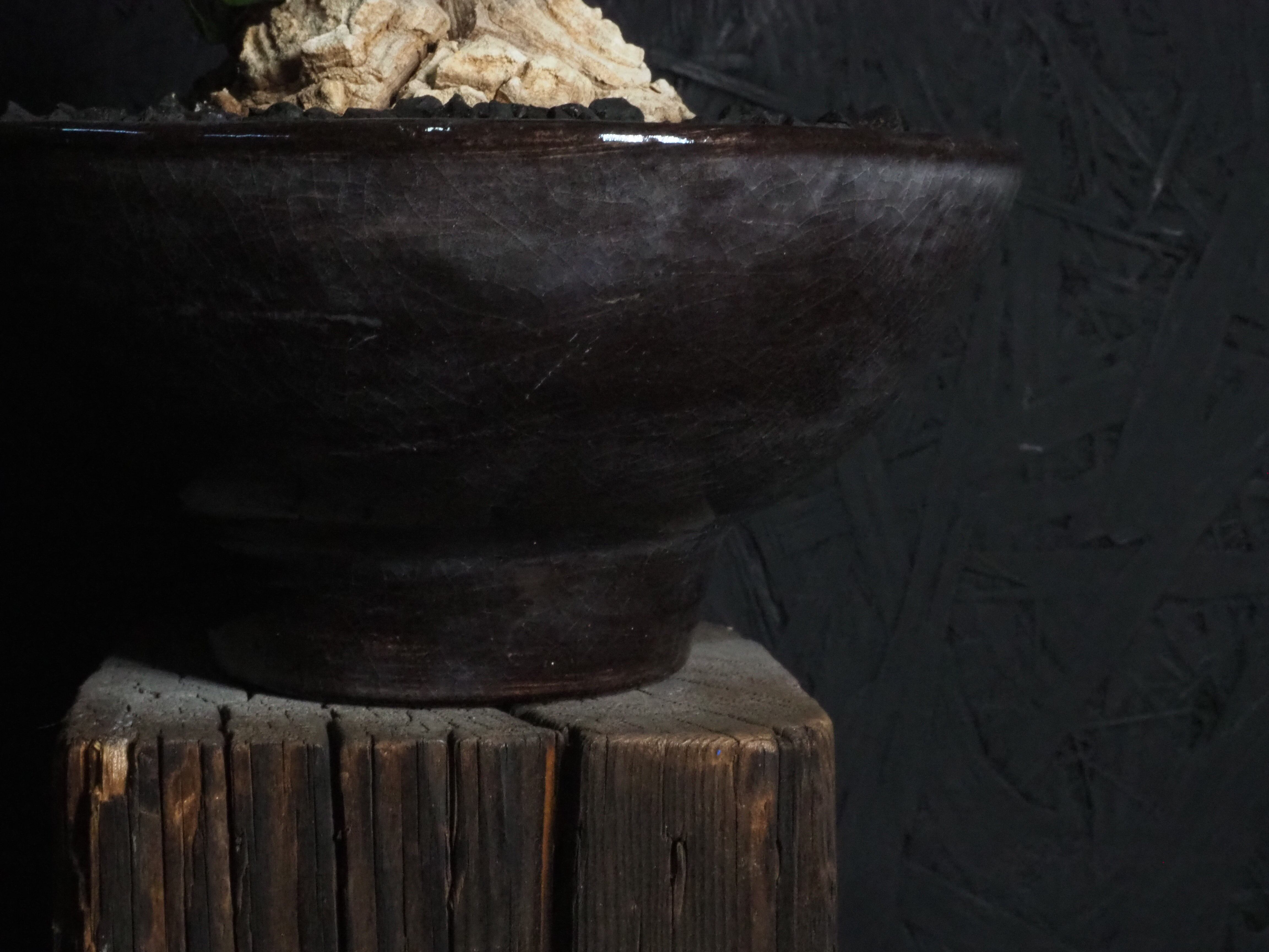 『黒椀』~釉の割れと曇りが相まって、闇夜のような雰囲気を醸し出す。マットブラックの化粧砂利で仕上げたアフリカ亀甲です。もちろん底穴開け加工済み。