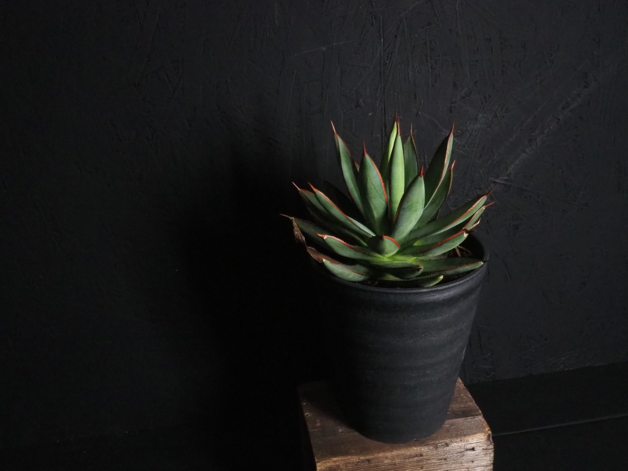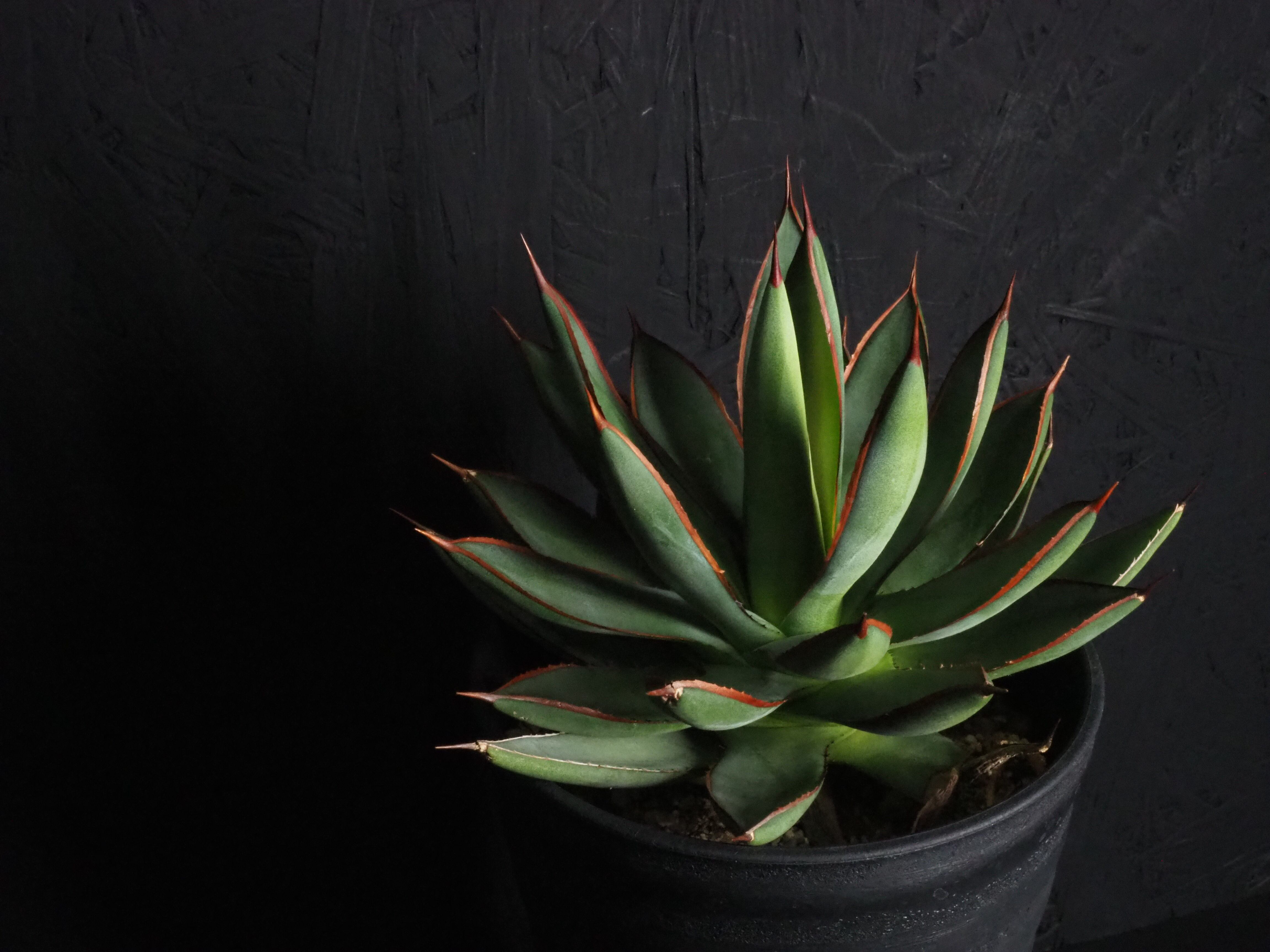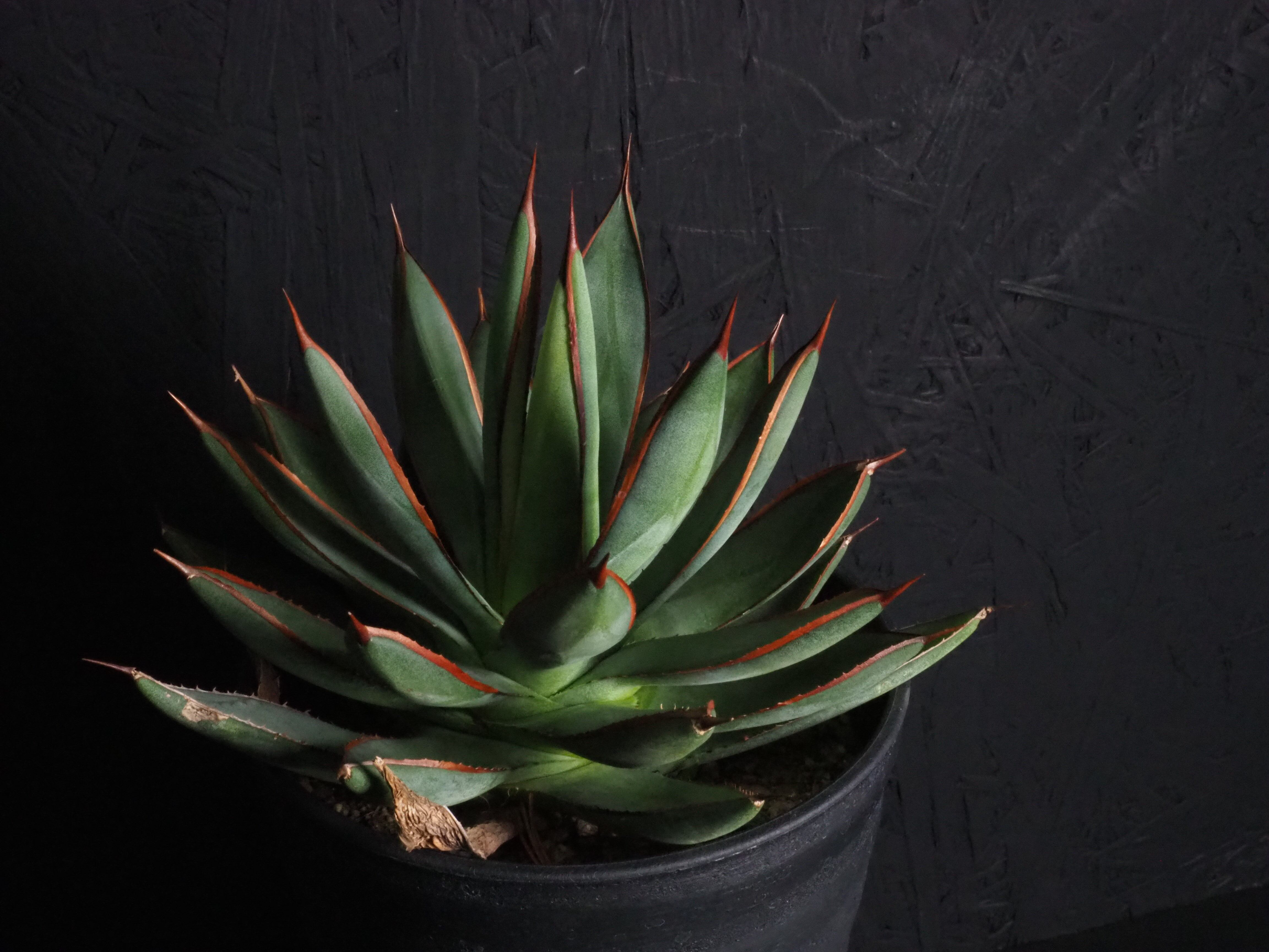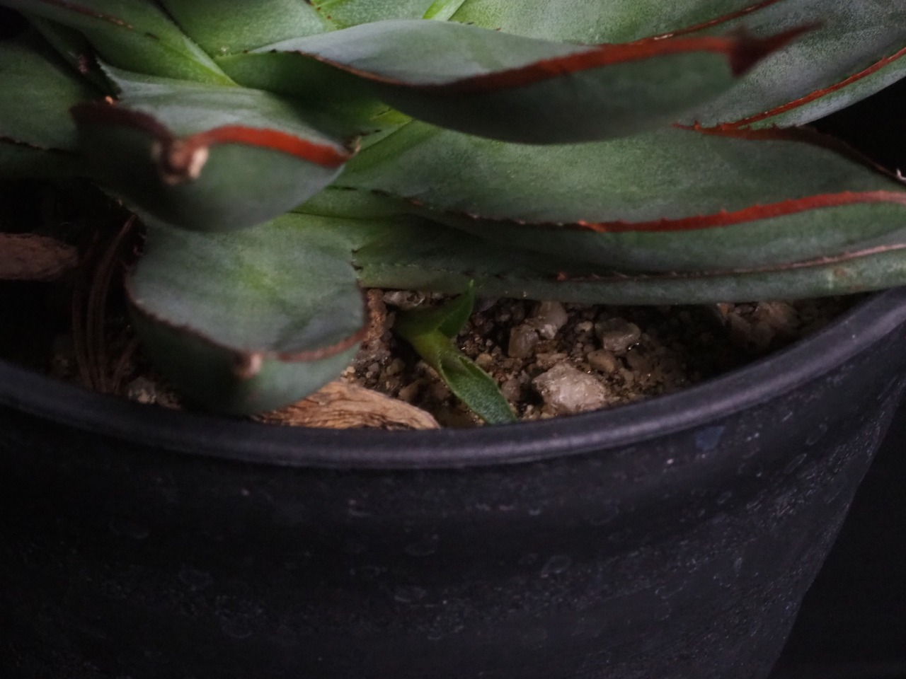 アガベ「バーントバーガンディー」は肉厚で少し青味掛かった細葉に赤茶色のエッジライン&トゲが特徴です。この個体は葉の開きも間延びなく、かなり詰まっており絶賛生長中の個体です。隠れキャラ的に子株が出てきていますよ(画像6枚目)。