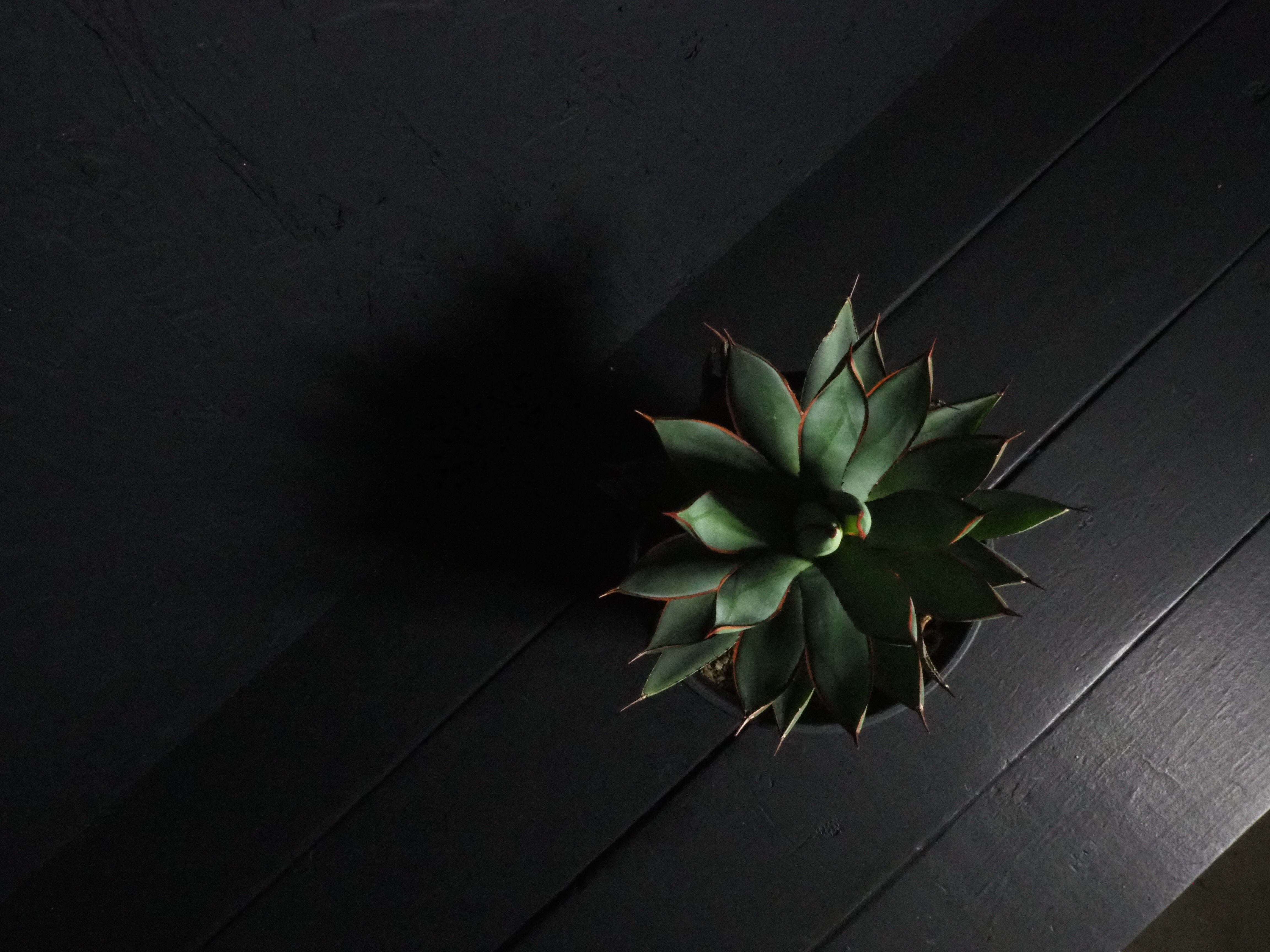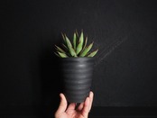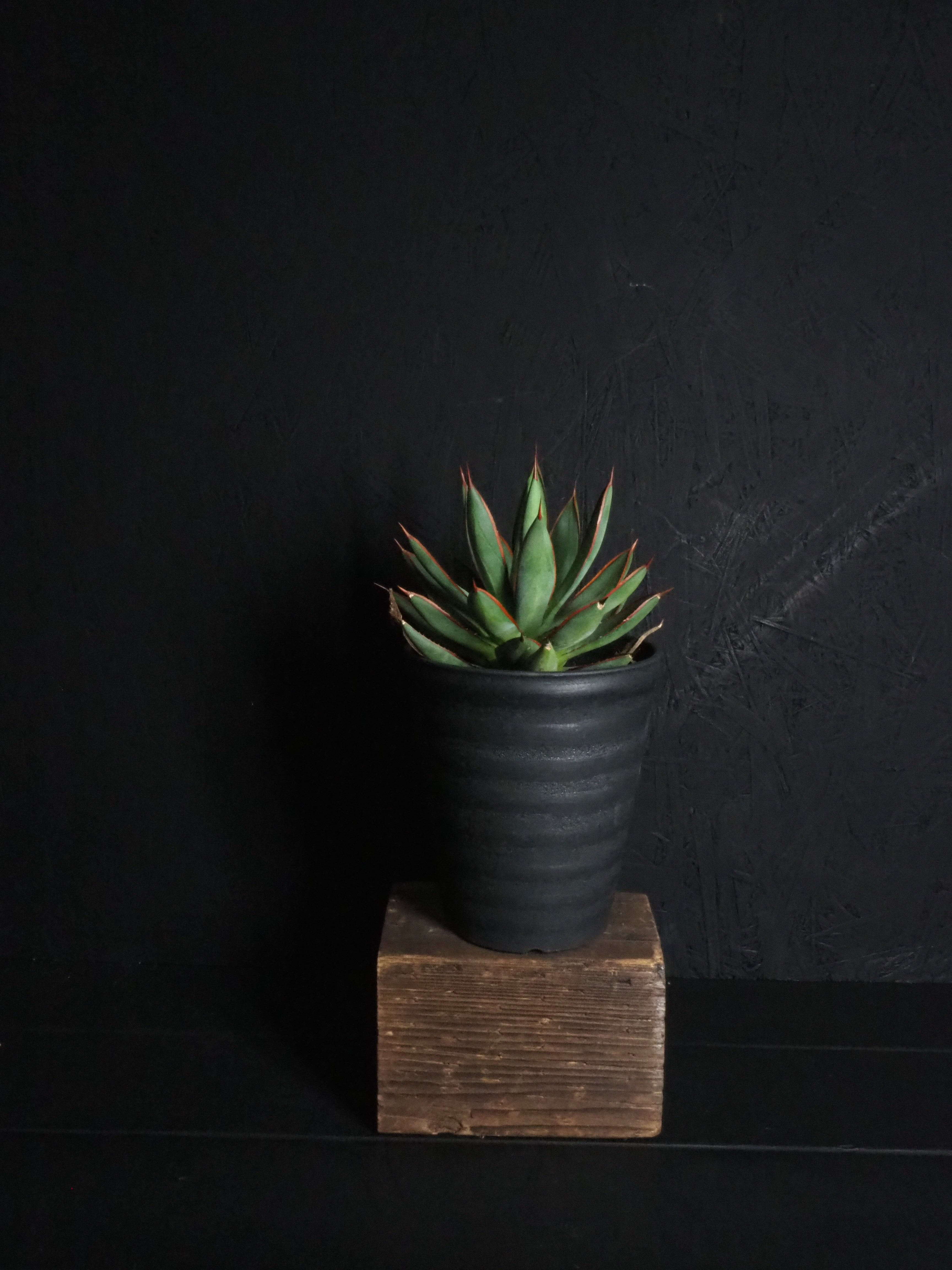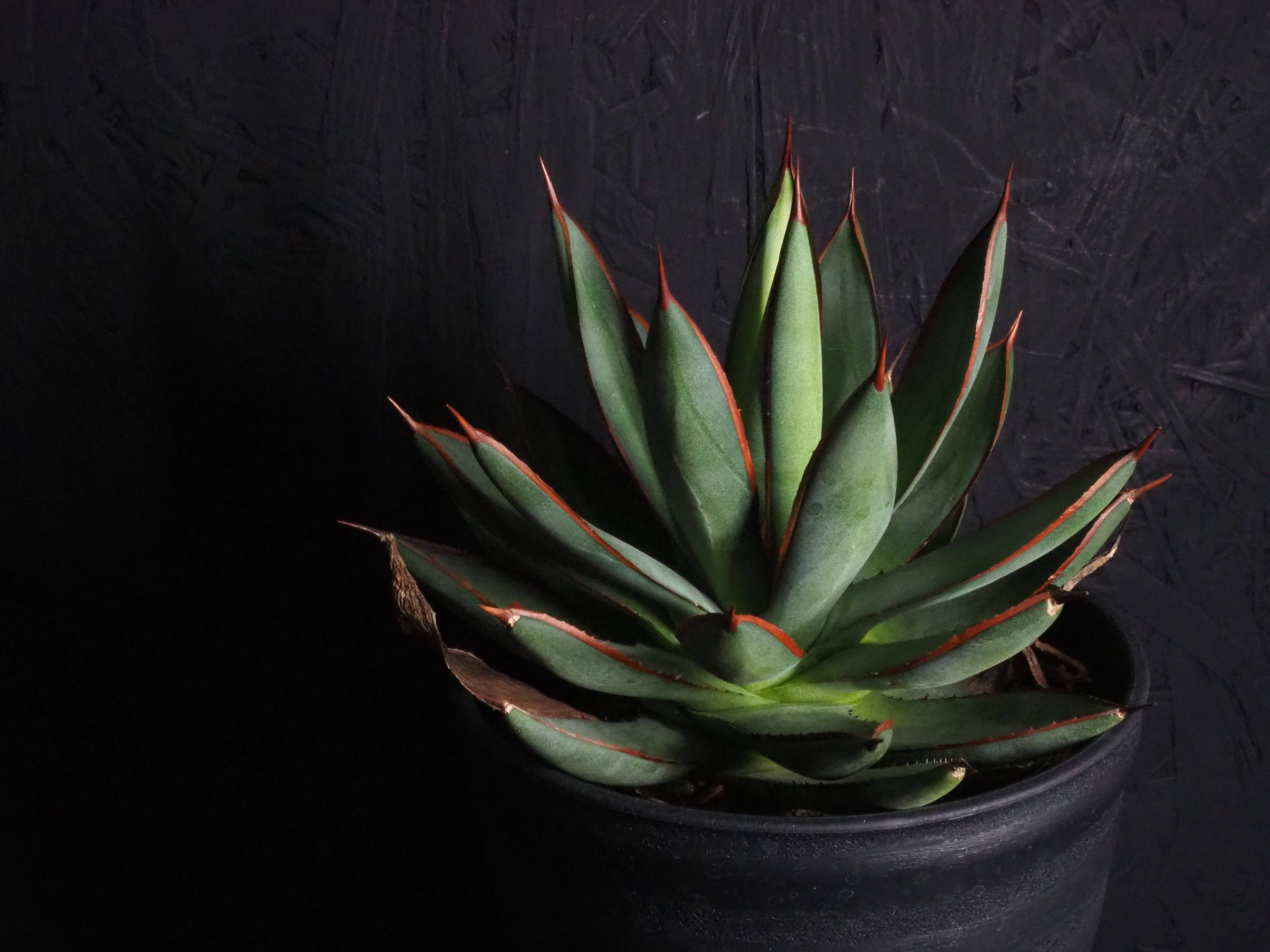 アガベ「バーントバーガンディー」は肉厚で少し青味掛かった細葉に赤茶色のエッジライン&トゲが特徴です。この個体は葉の開きも間延びなく、かなり詰まっており絶賛生長中の個体です。隠れキャラ的に子株が出てきていますよ(画像6枚目)。