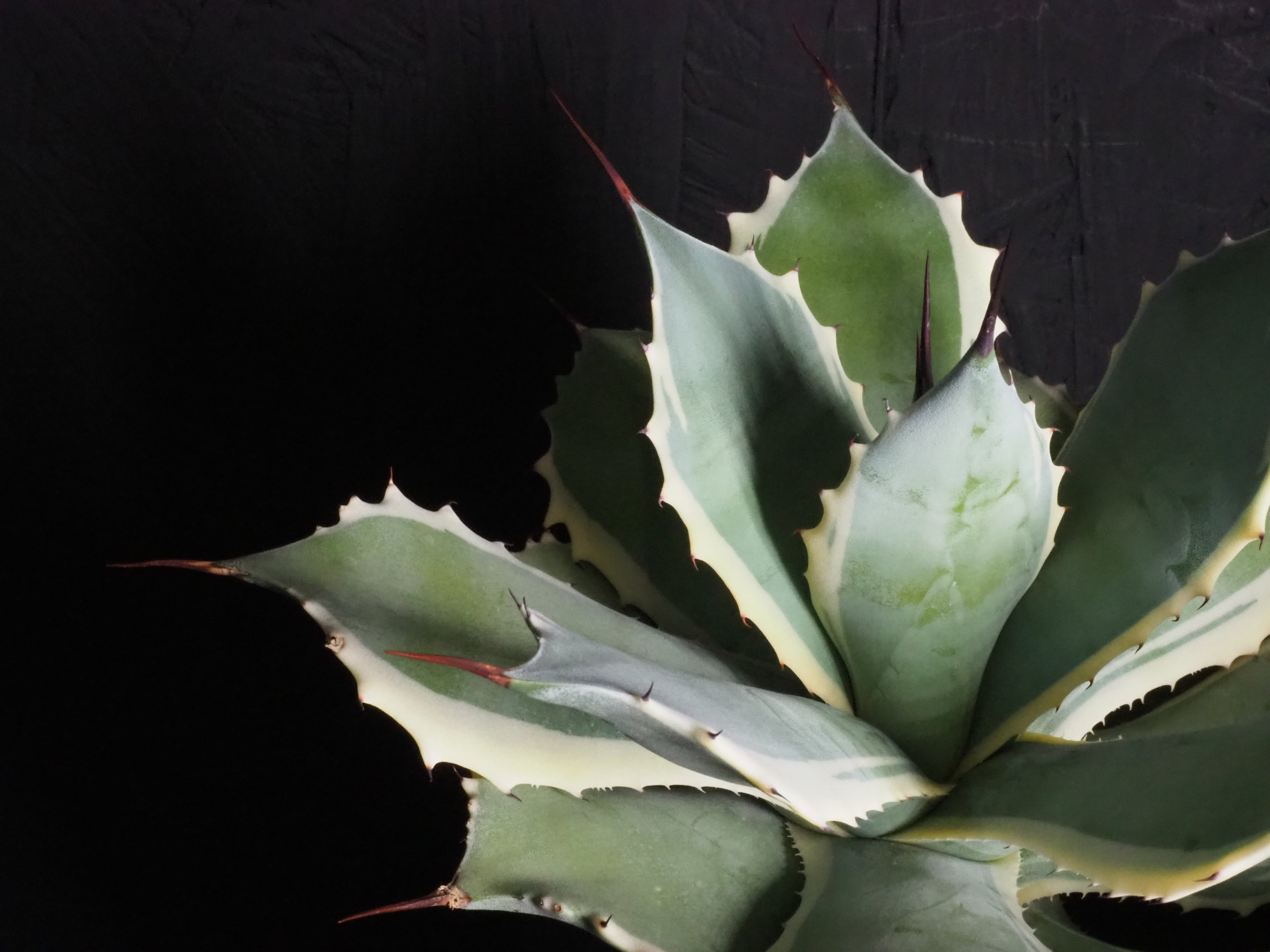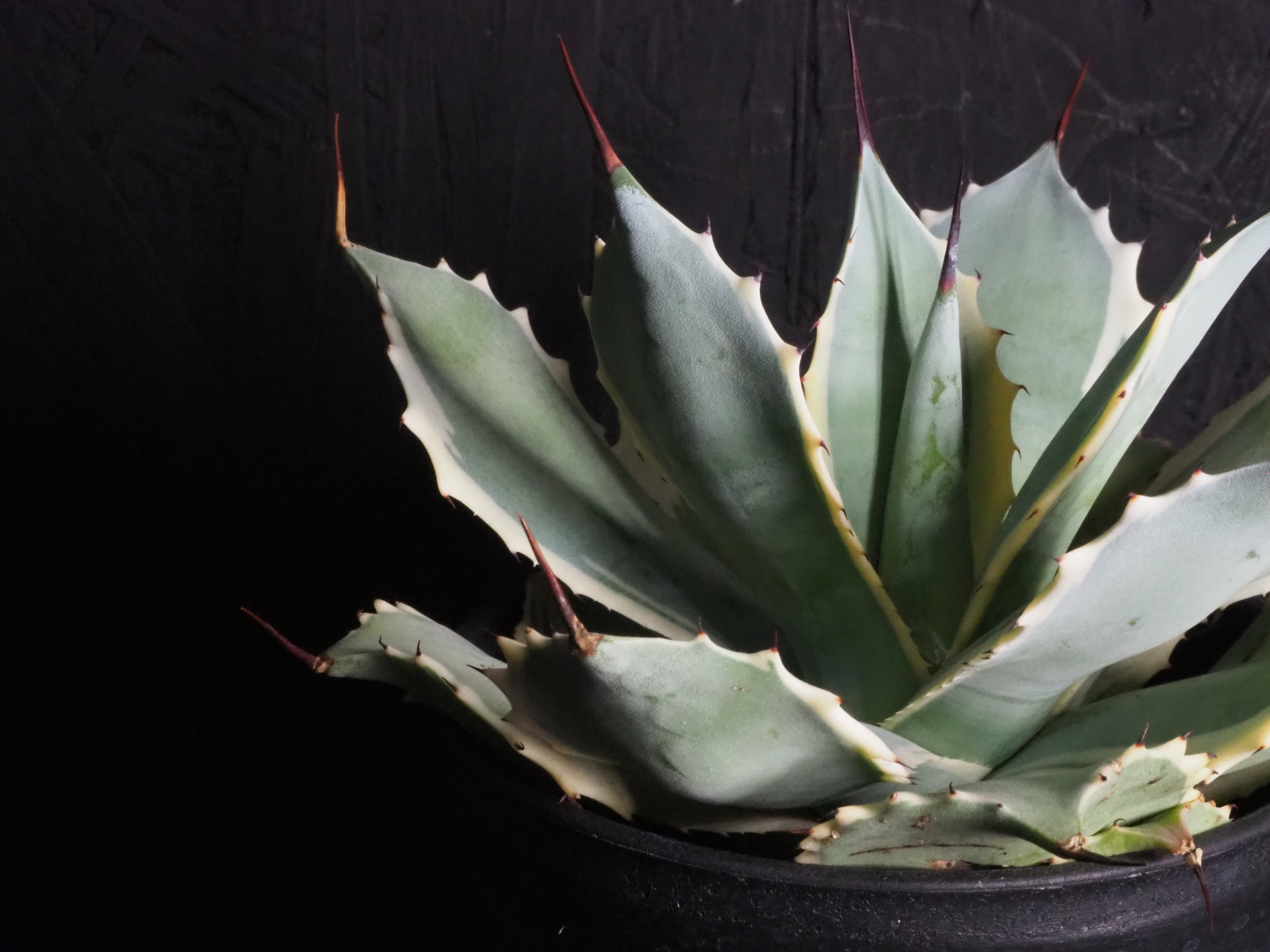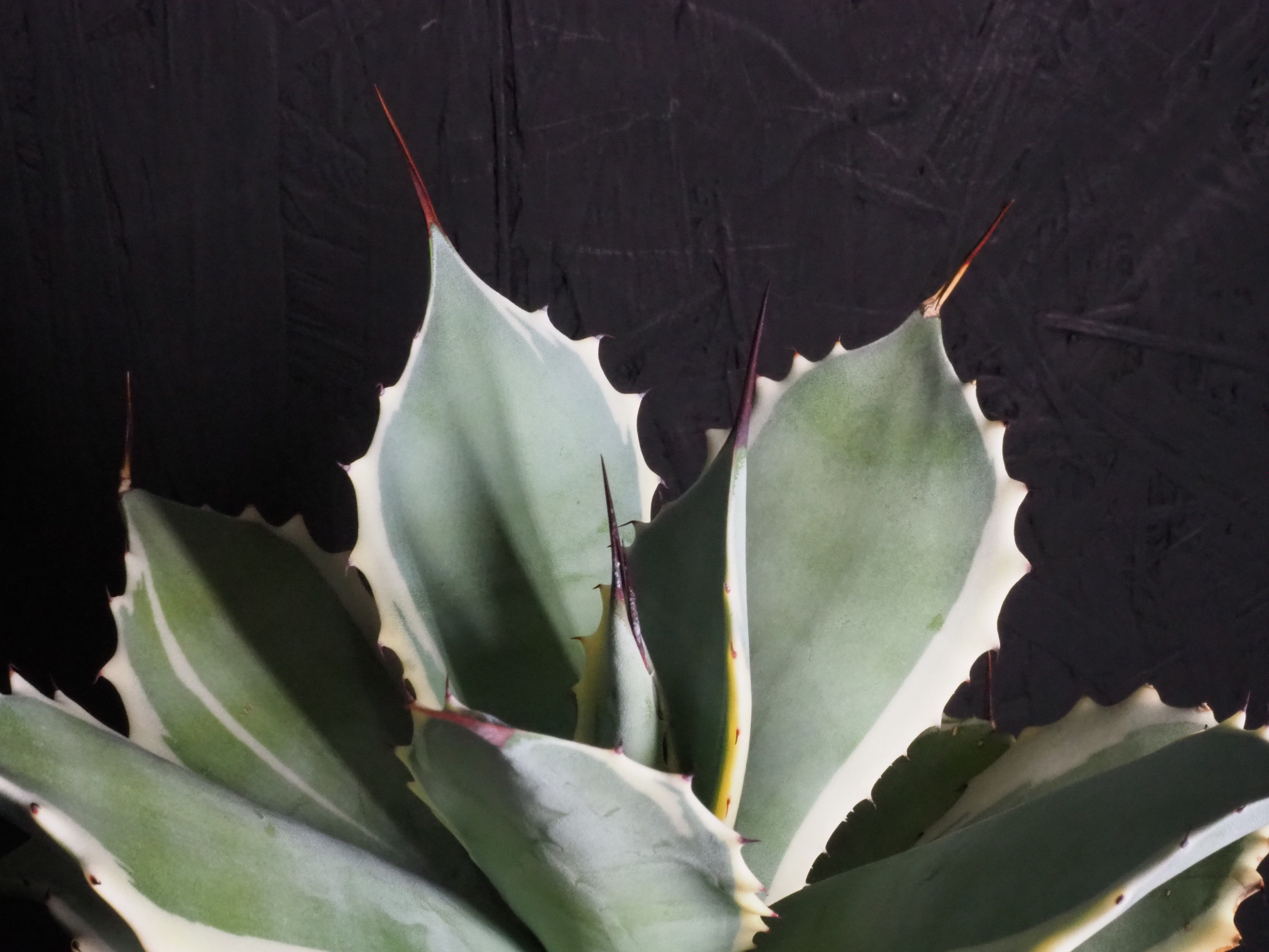 白い粉っぽい青緑色の葉がクリーム色の覆輪で一見やさしい感じに見えますが、赤黒いトゲトゲは強烈で流血注意です!!