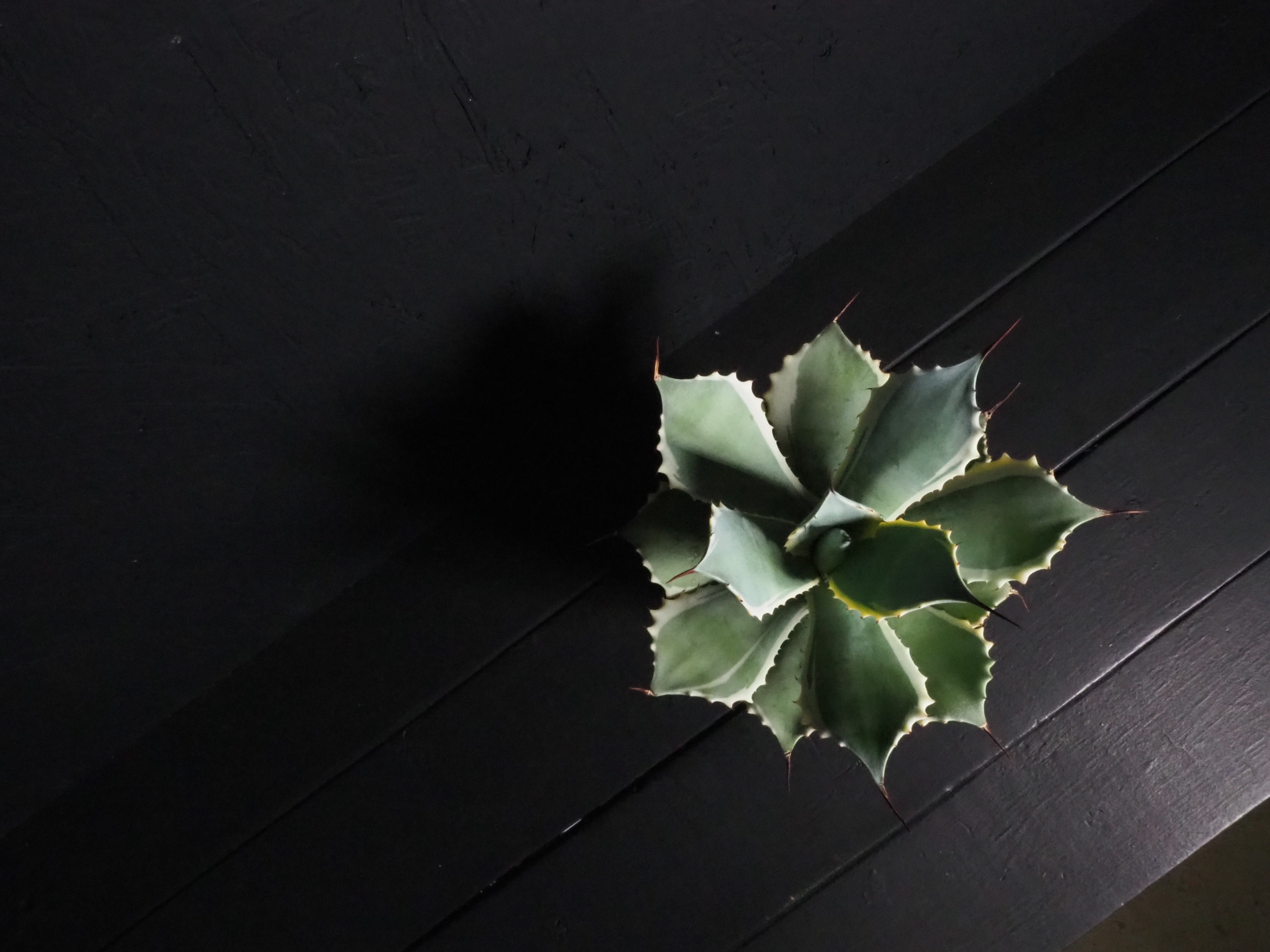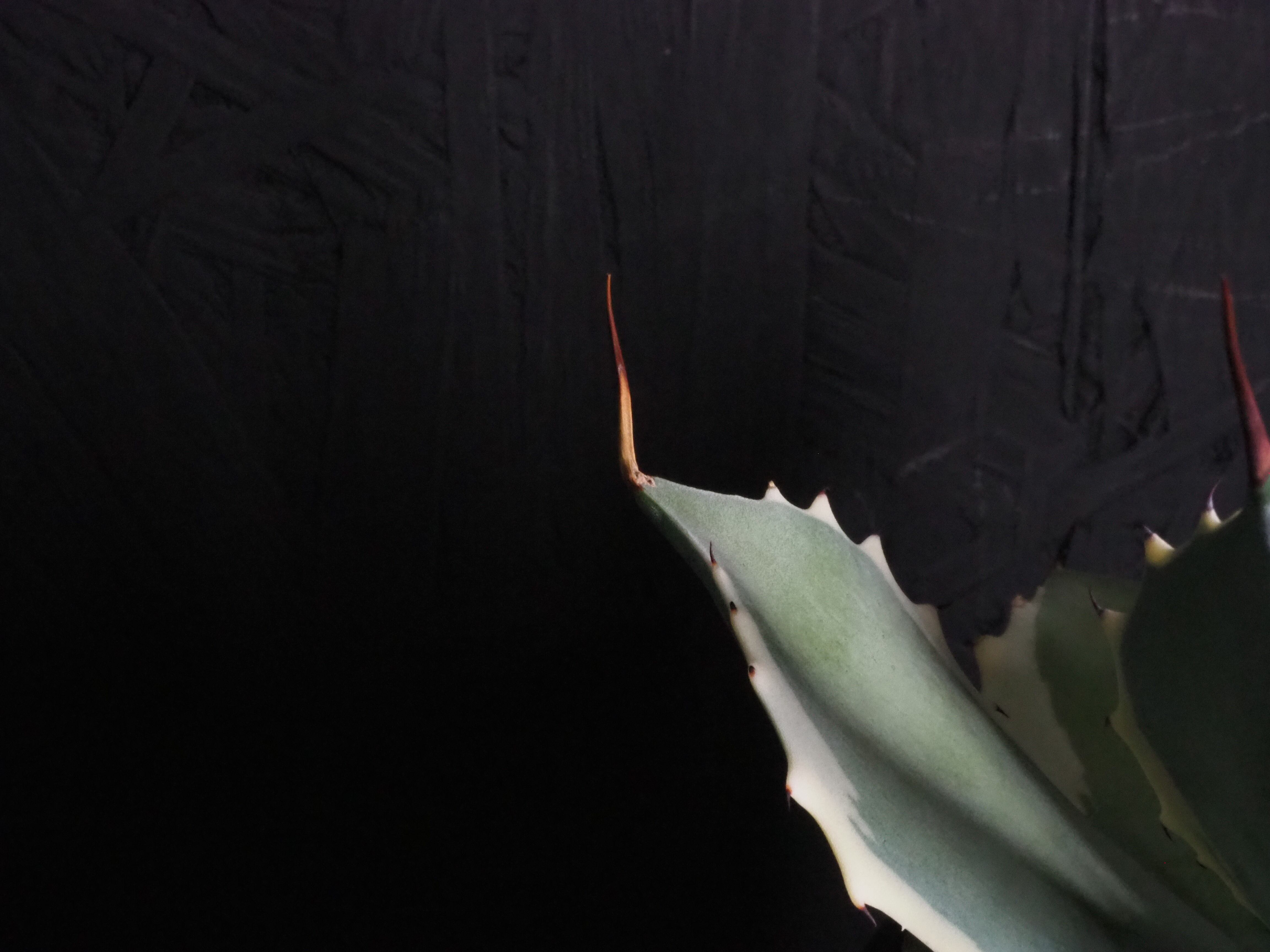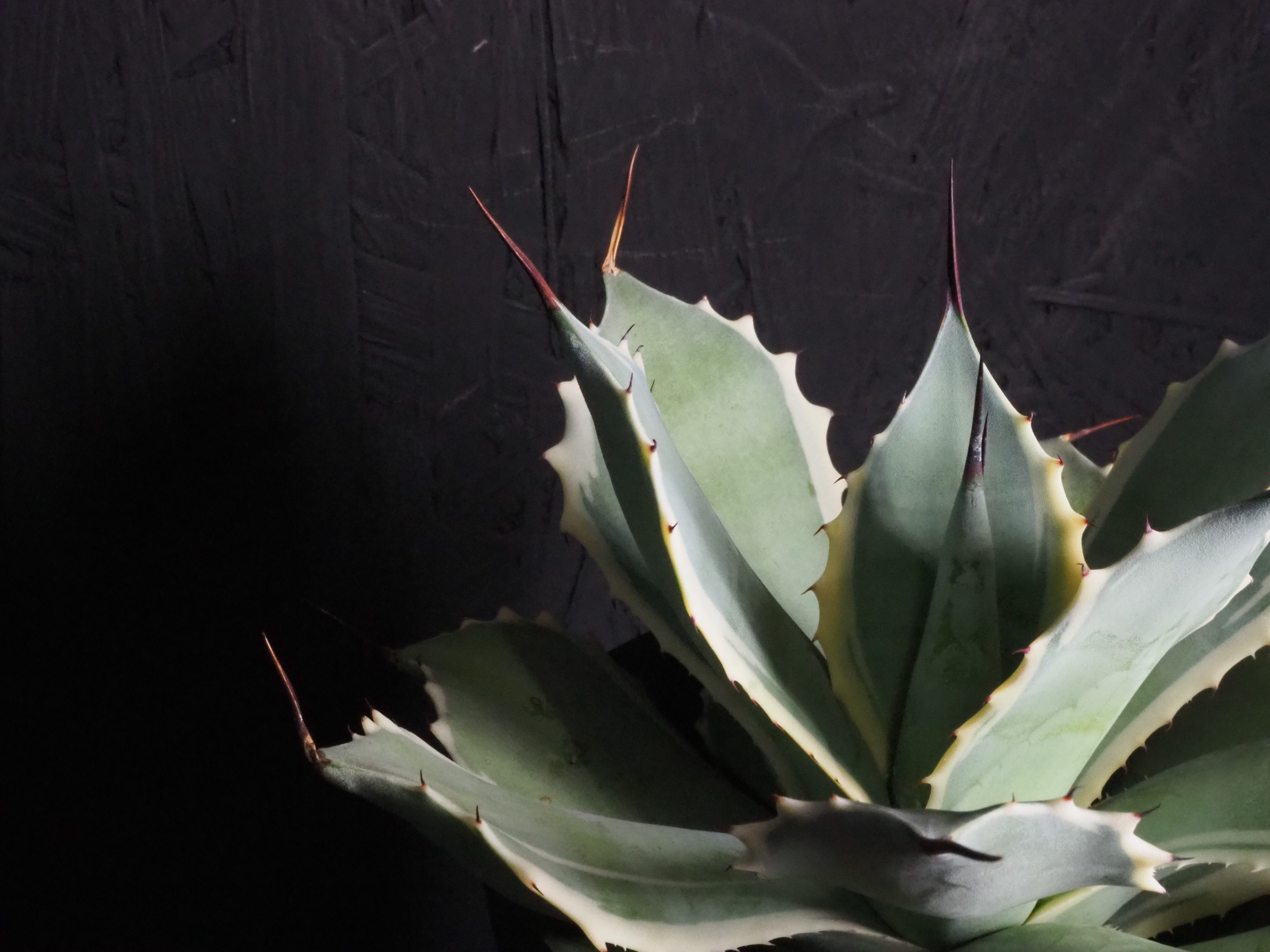 白い粉っぽい青緑色の葉がクリーム色の覆輪で一見やさしい感じに見えますが、赤黒いトゲトゲは強烈で流血注意です!!