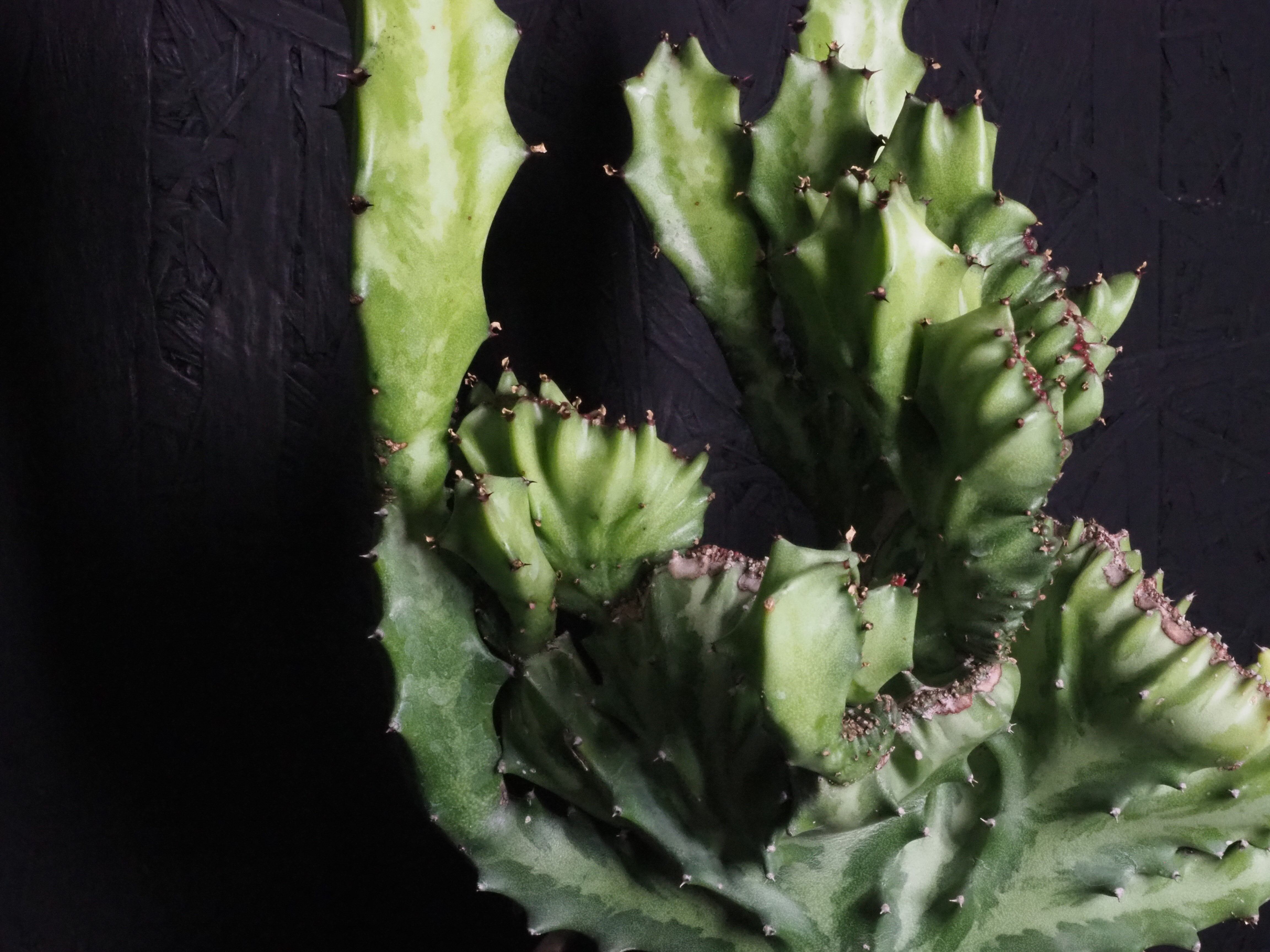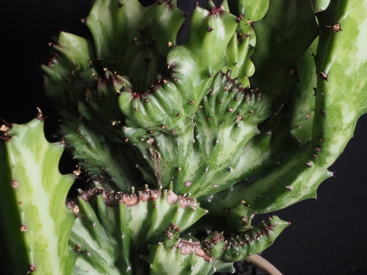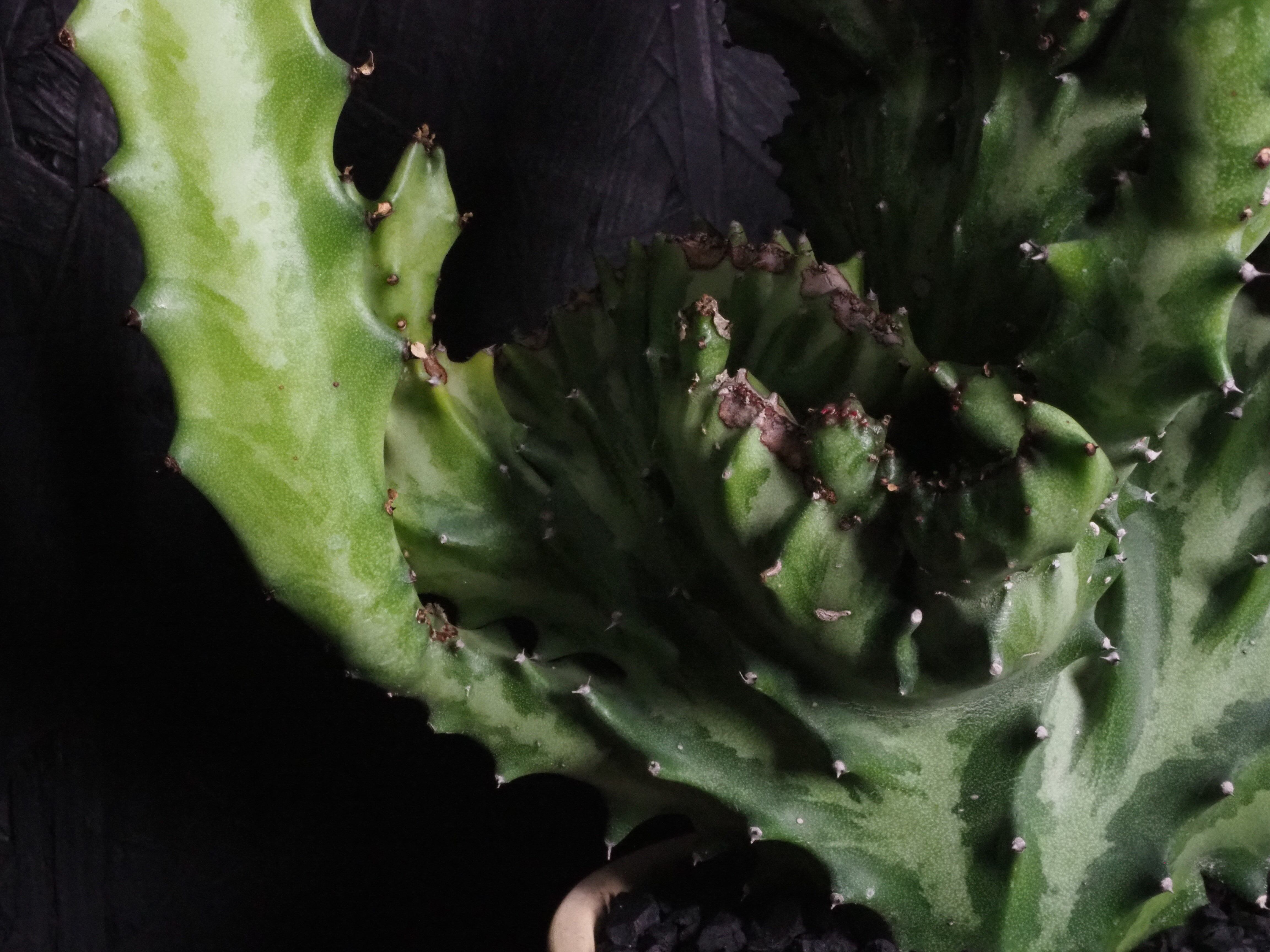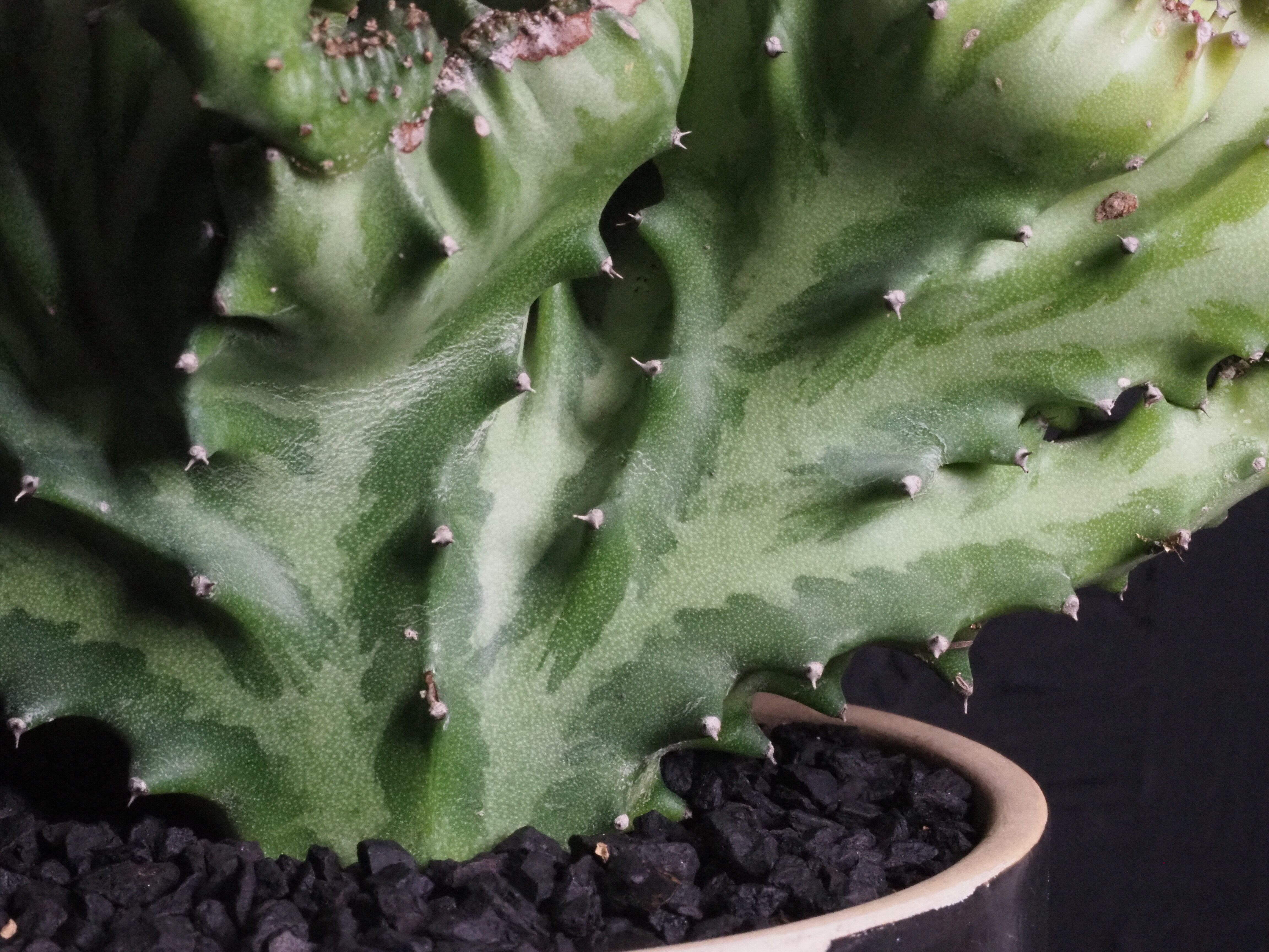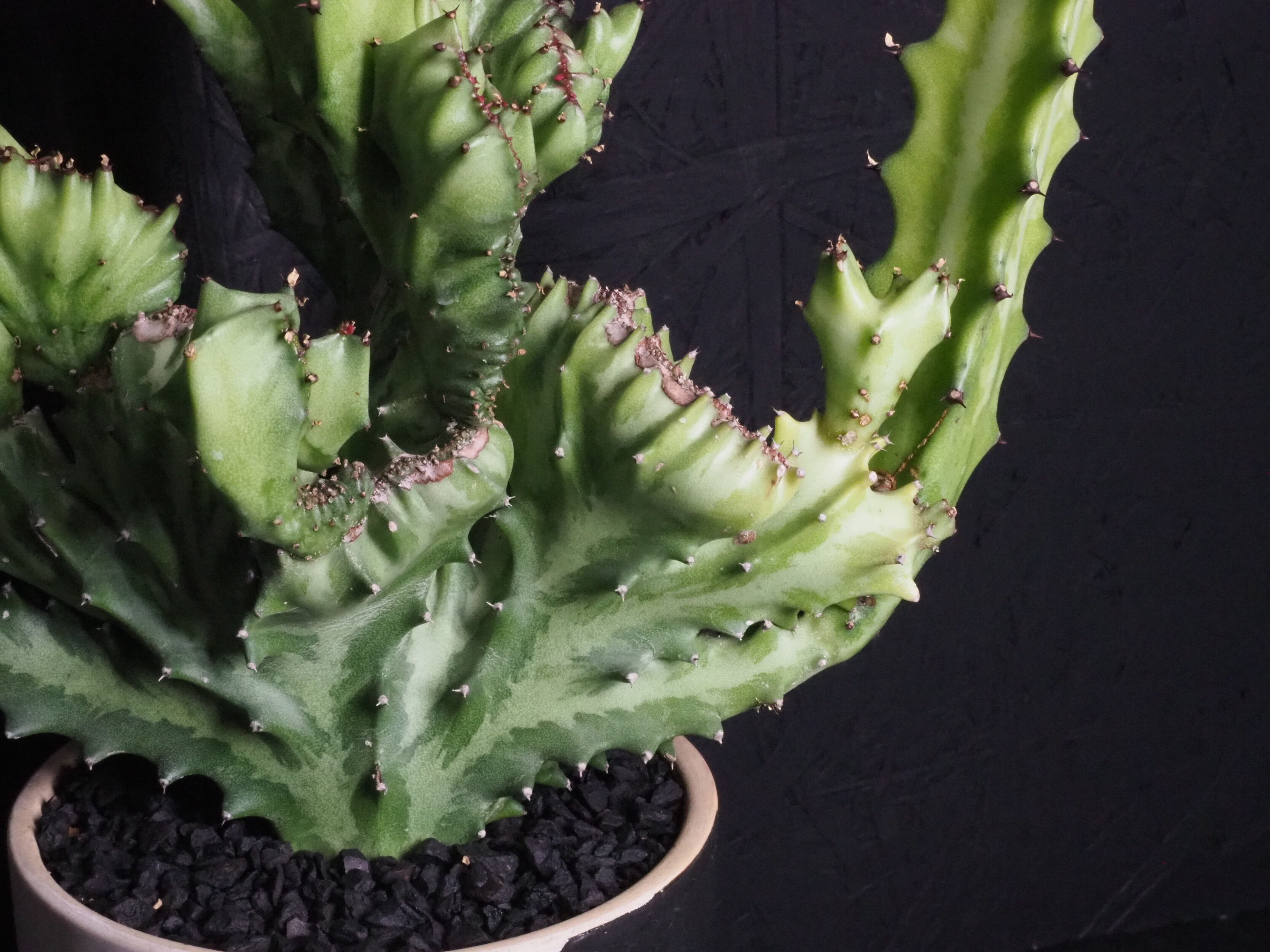 ユーフォルビア・ラクテアといえば、接ぎ木の「マハラジャ」や、「ホワイトゴースト」がポピュラーになりましたが、こちらののラクテアはノーマルラクテアの捻れた綴化個体で薄く斑が入ったものになります。