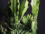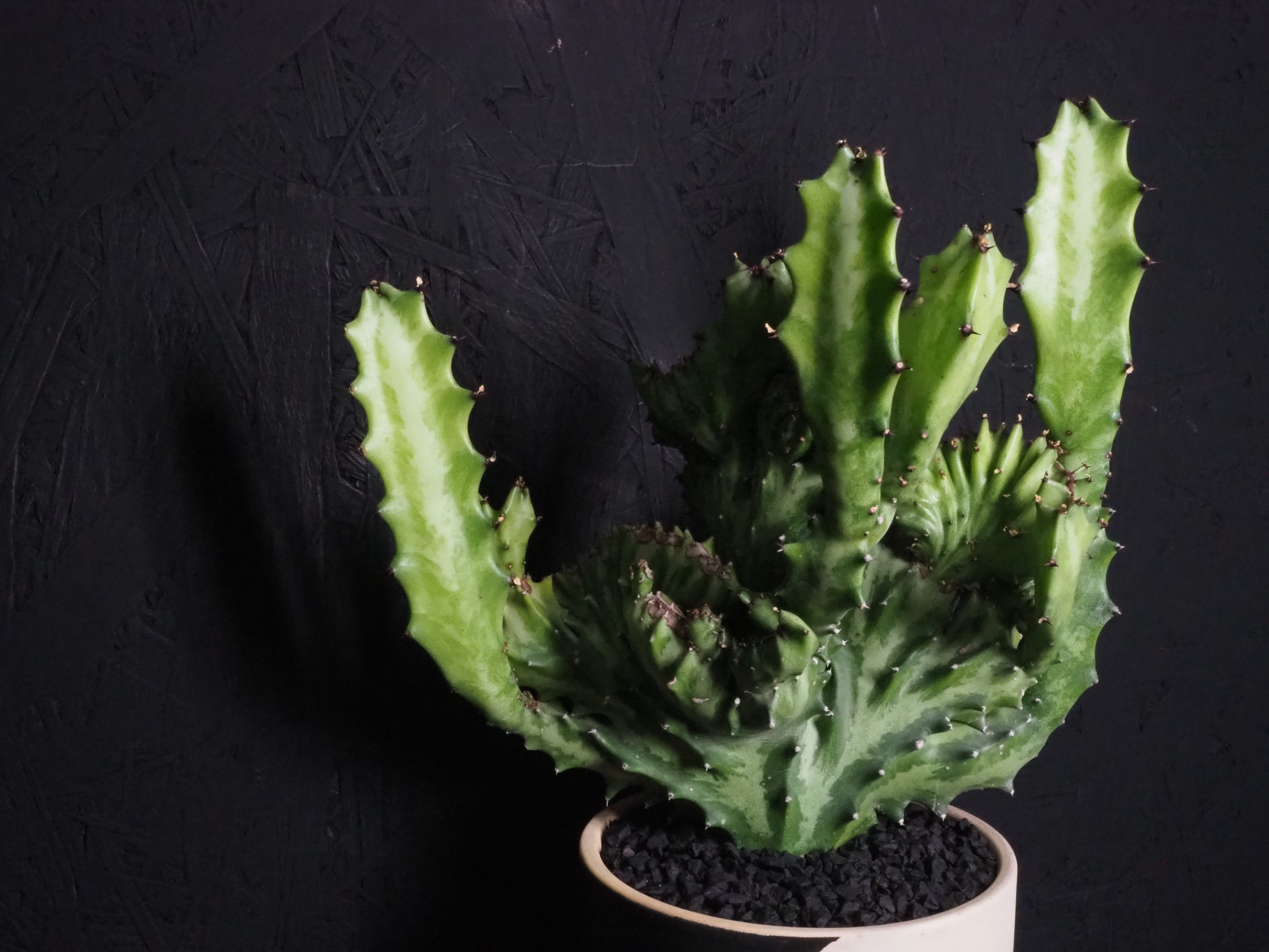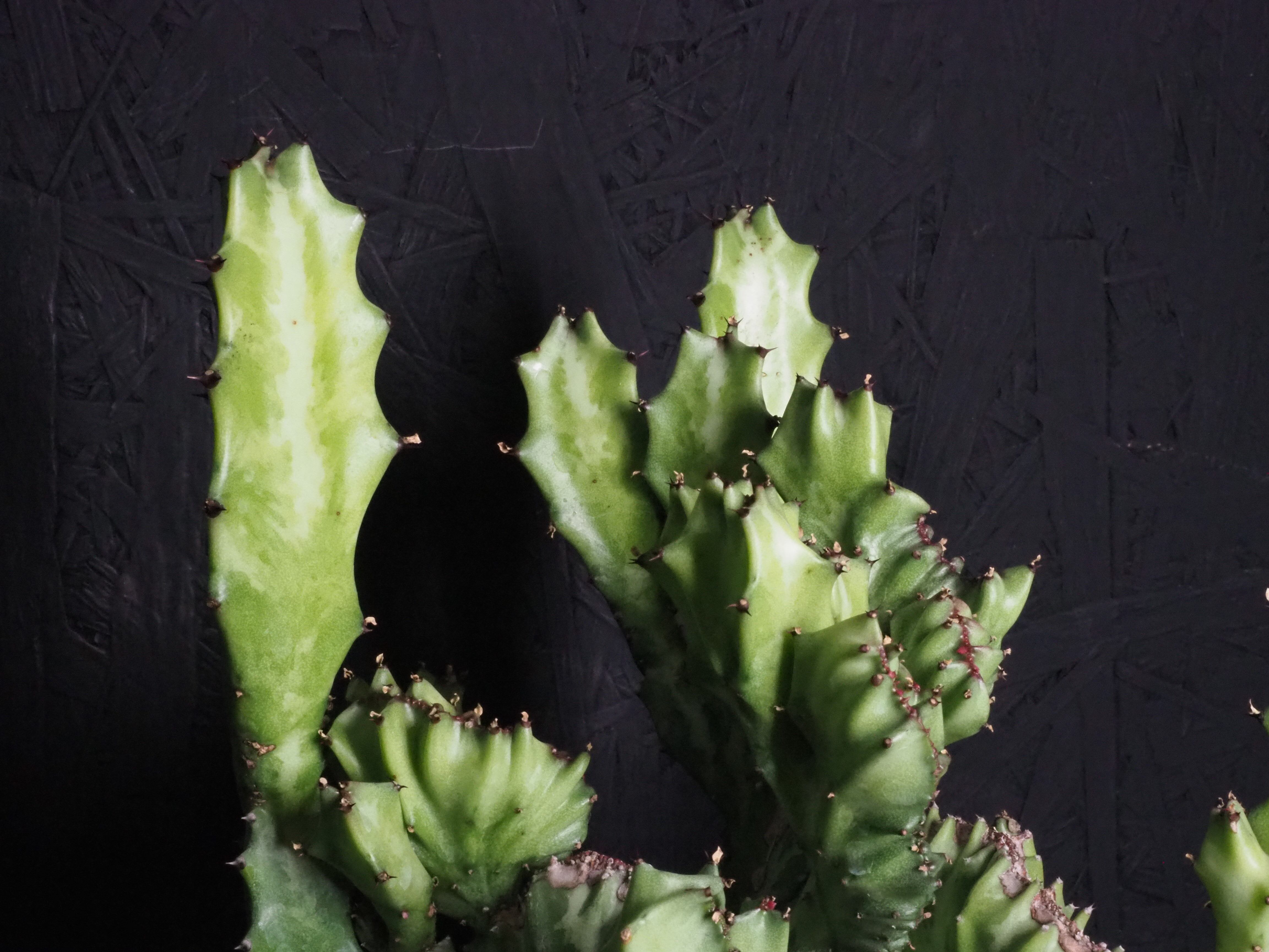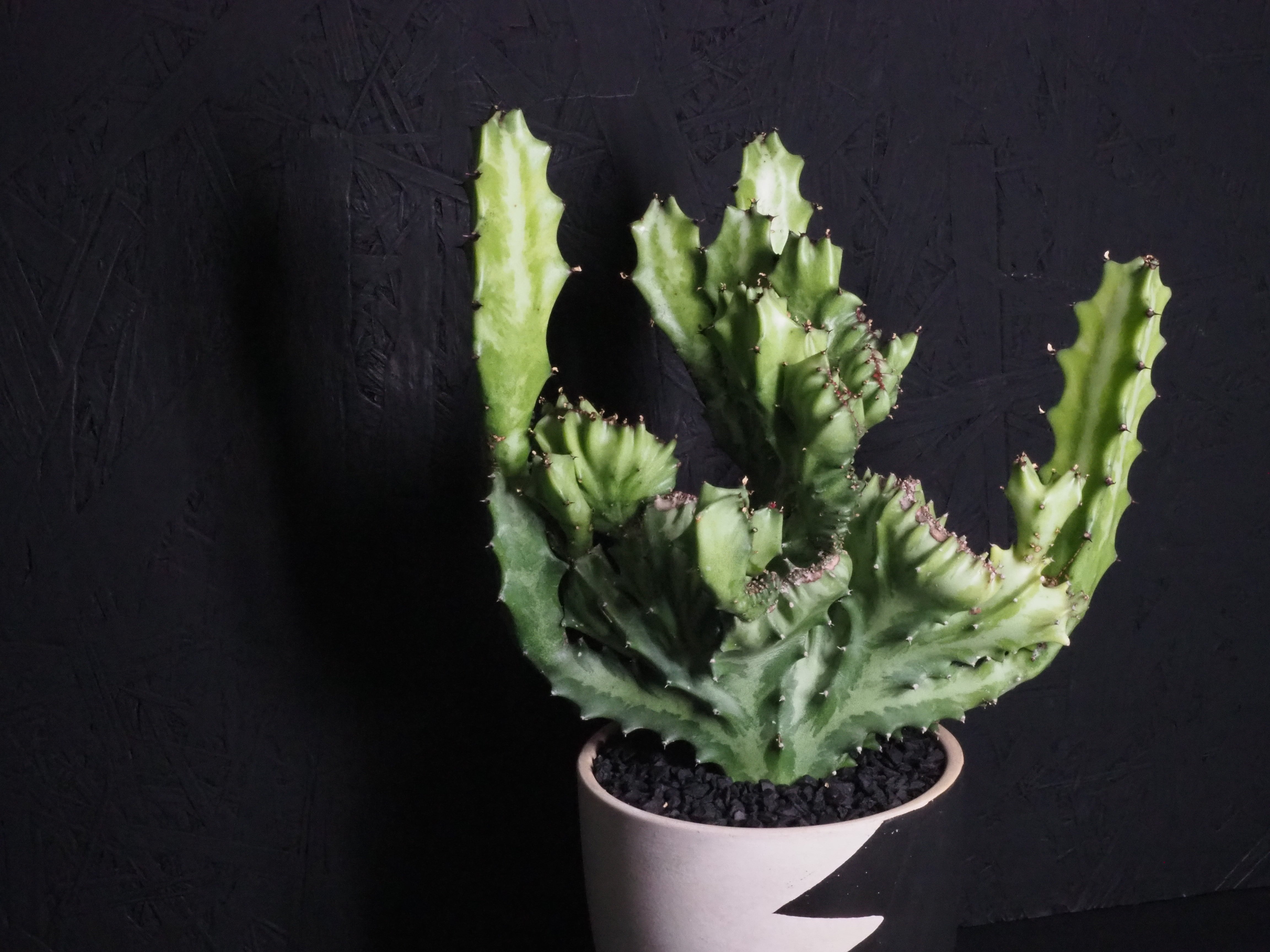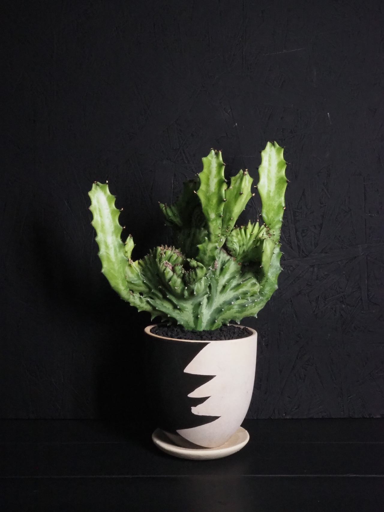 ユーフォルビア・ラクテアといえば、接ぎ木の「マハラジャ」や、「ホワイトゴースト」がポピュラーになりましたが、こちらののラクテアはノーマルラクテアの捻れた綴化個体で薄く斑が入ったものになります。