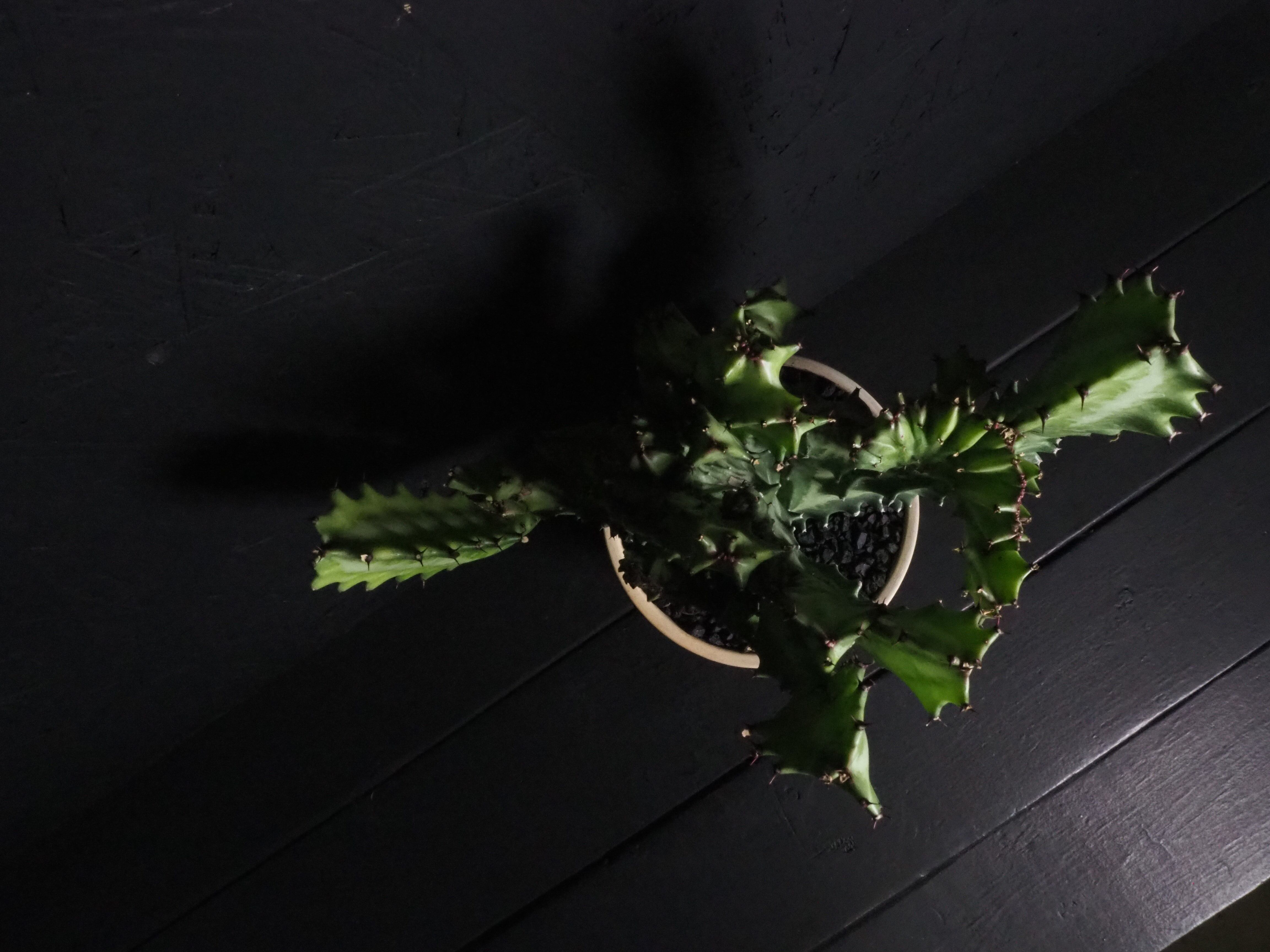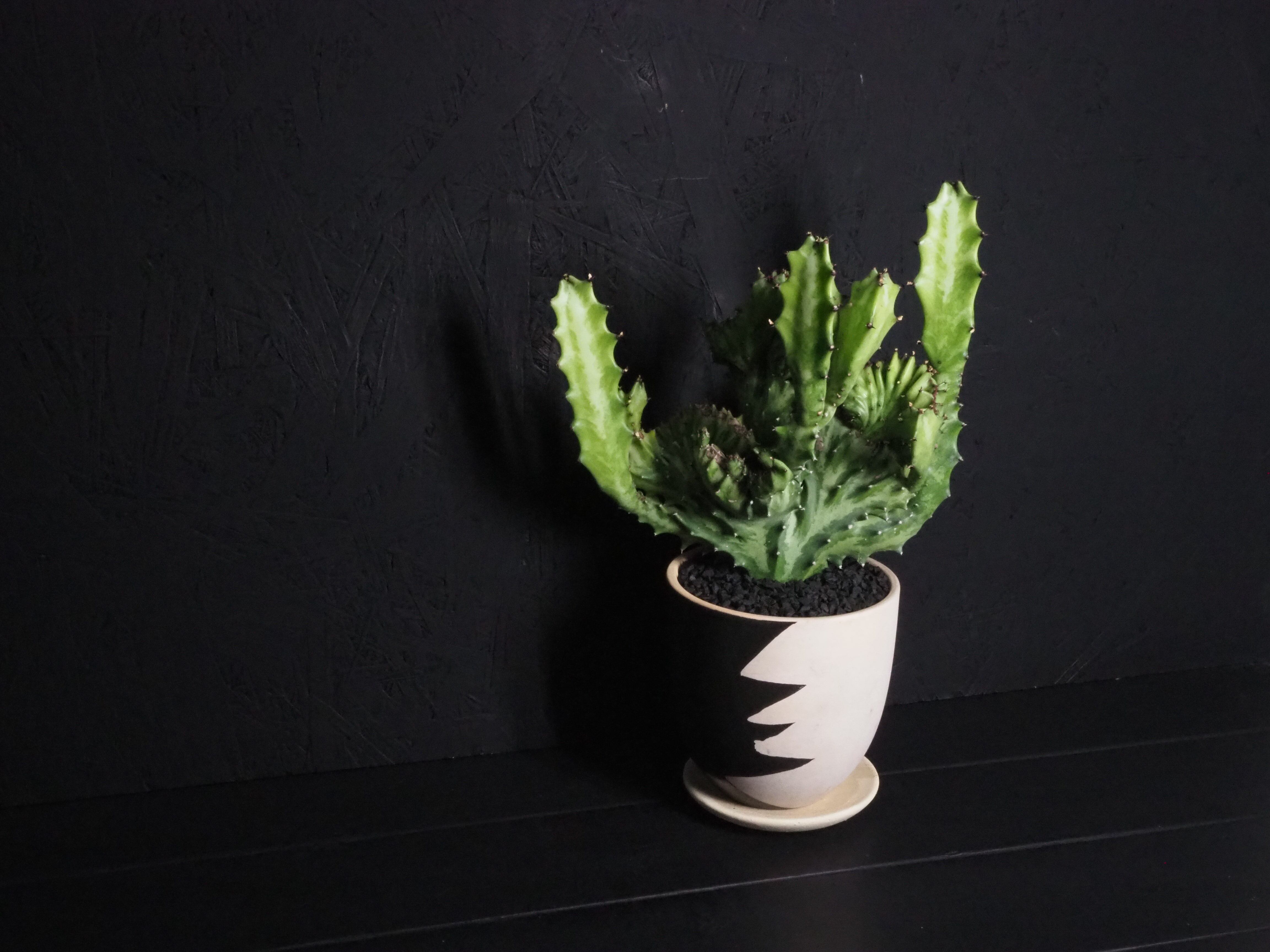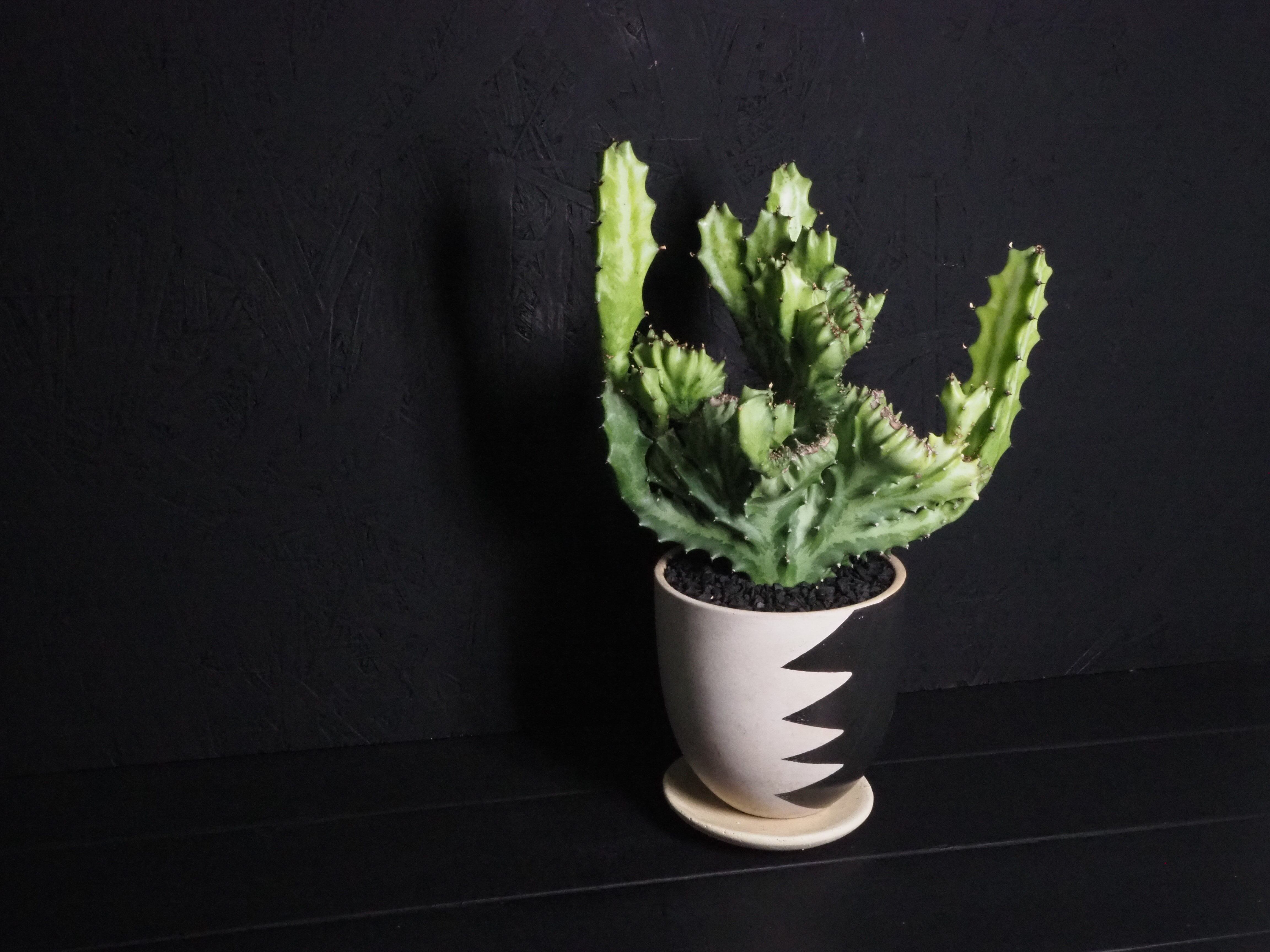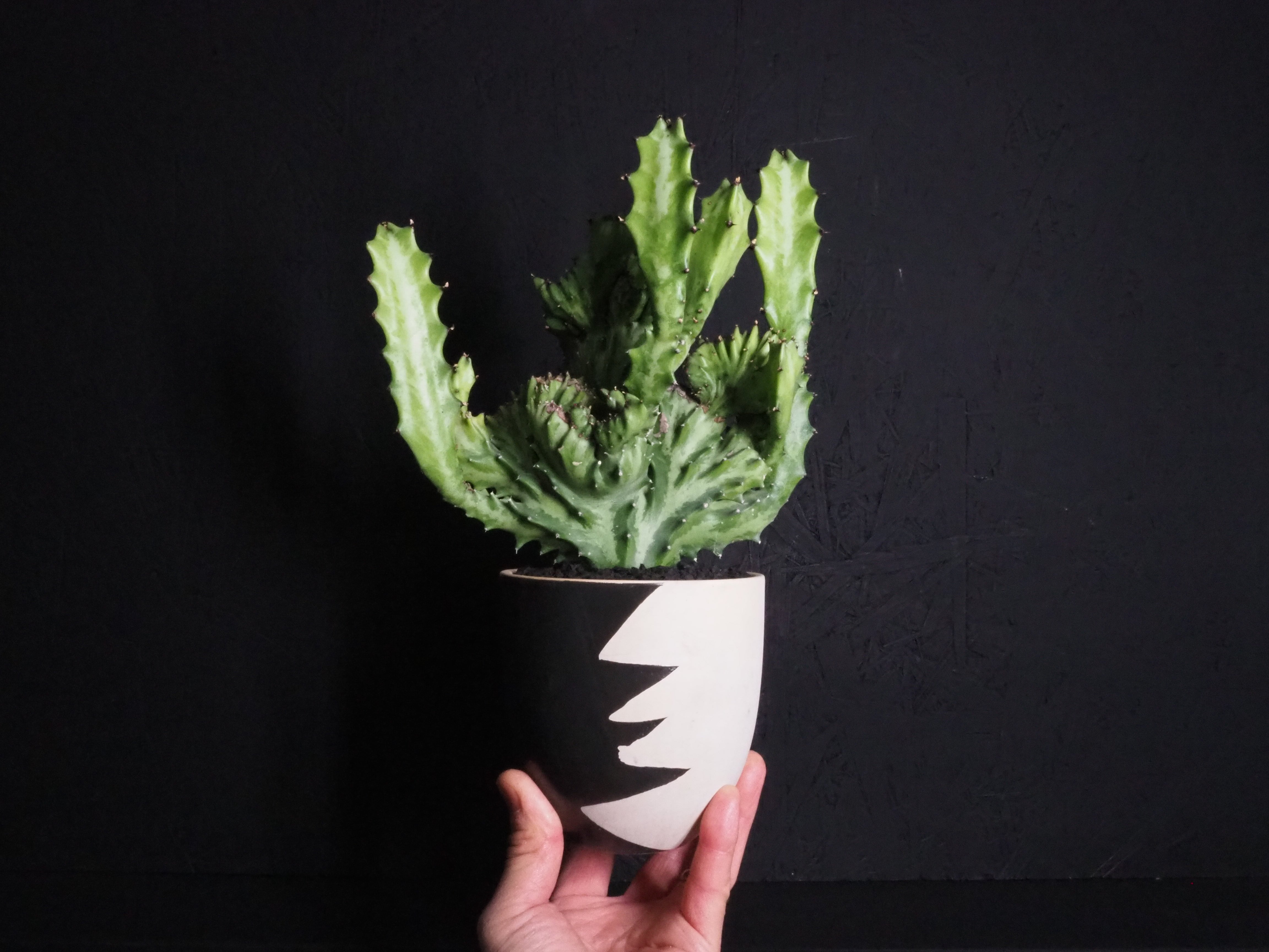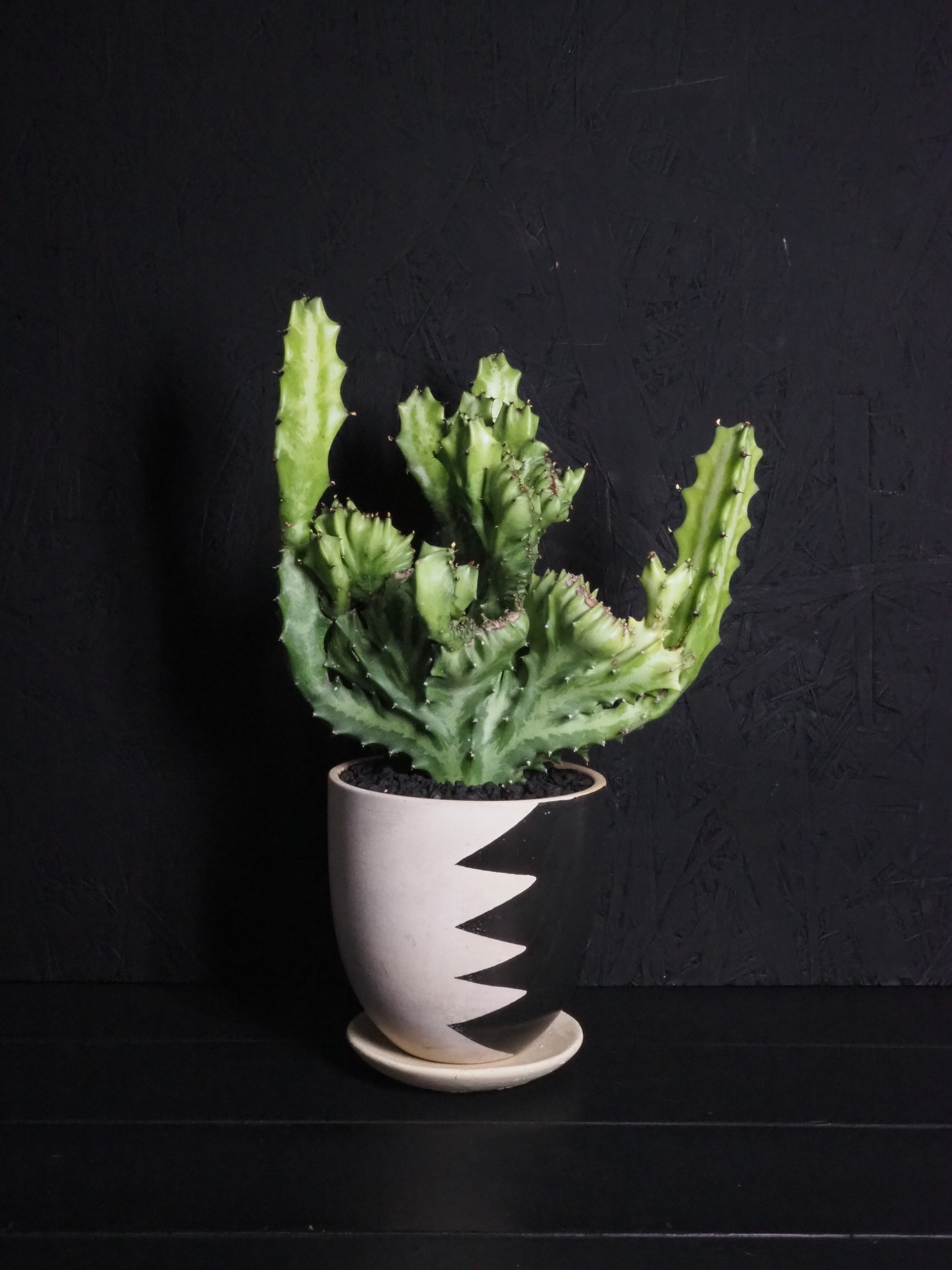 ユーフォルビア・ラクテアといえば、接ぎ木の「マハラジャ」や、「ホワイトゴースト」がポピュラーになりましたが、こちらののラクテアはノーマルラクテアの捻れた綴化個体で薄く斑が入ったものになります。