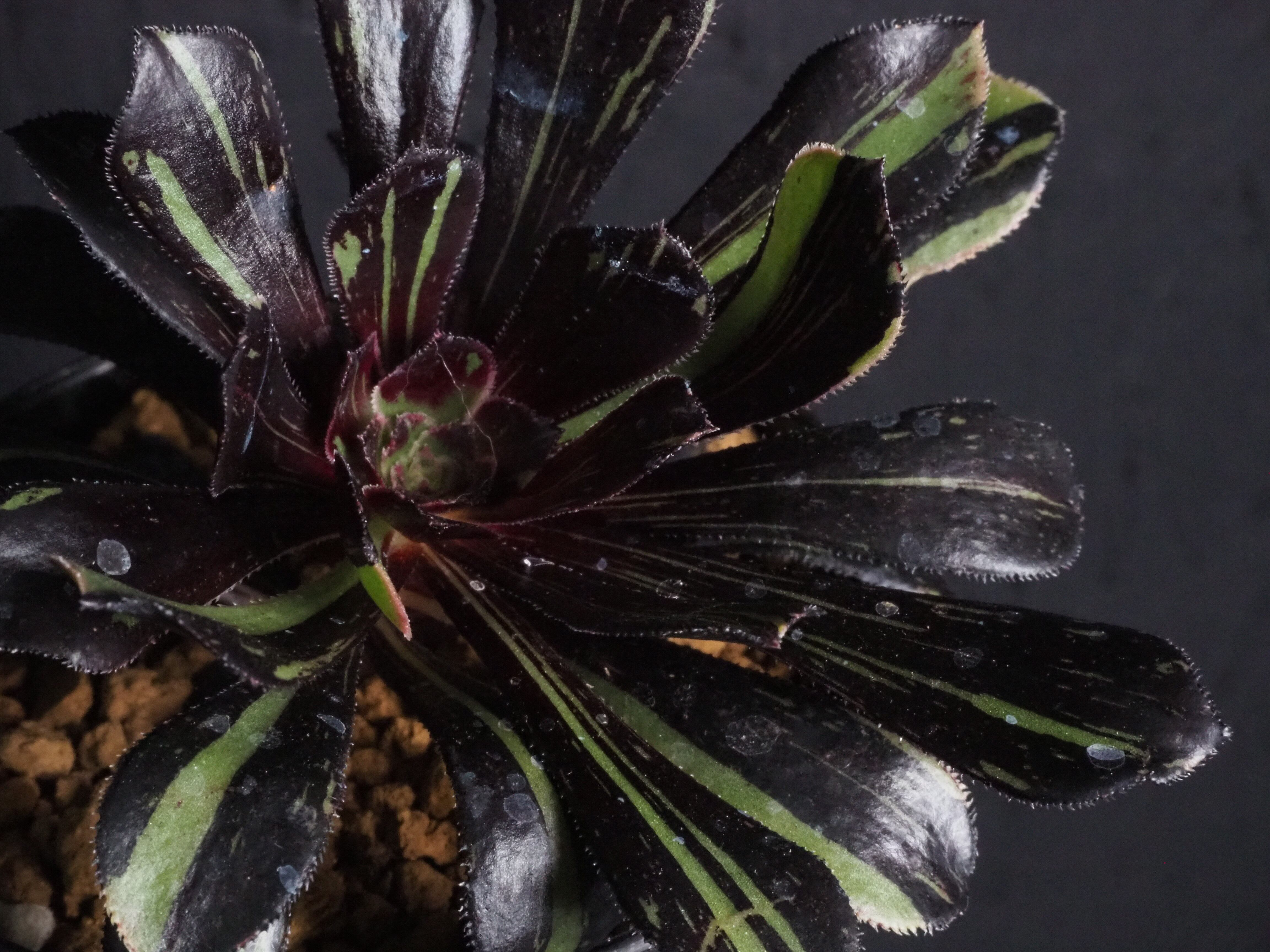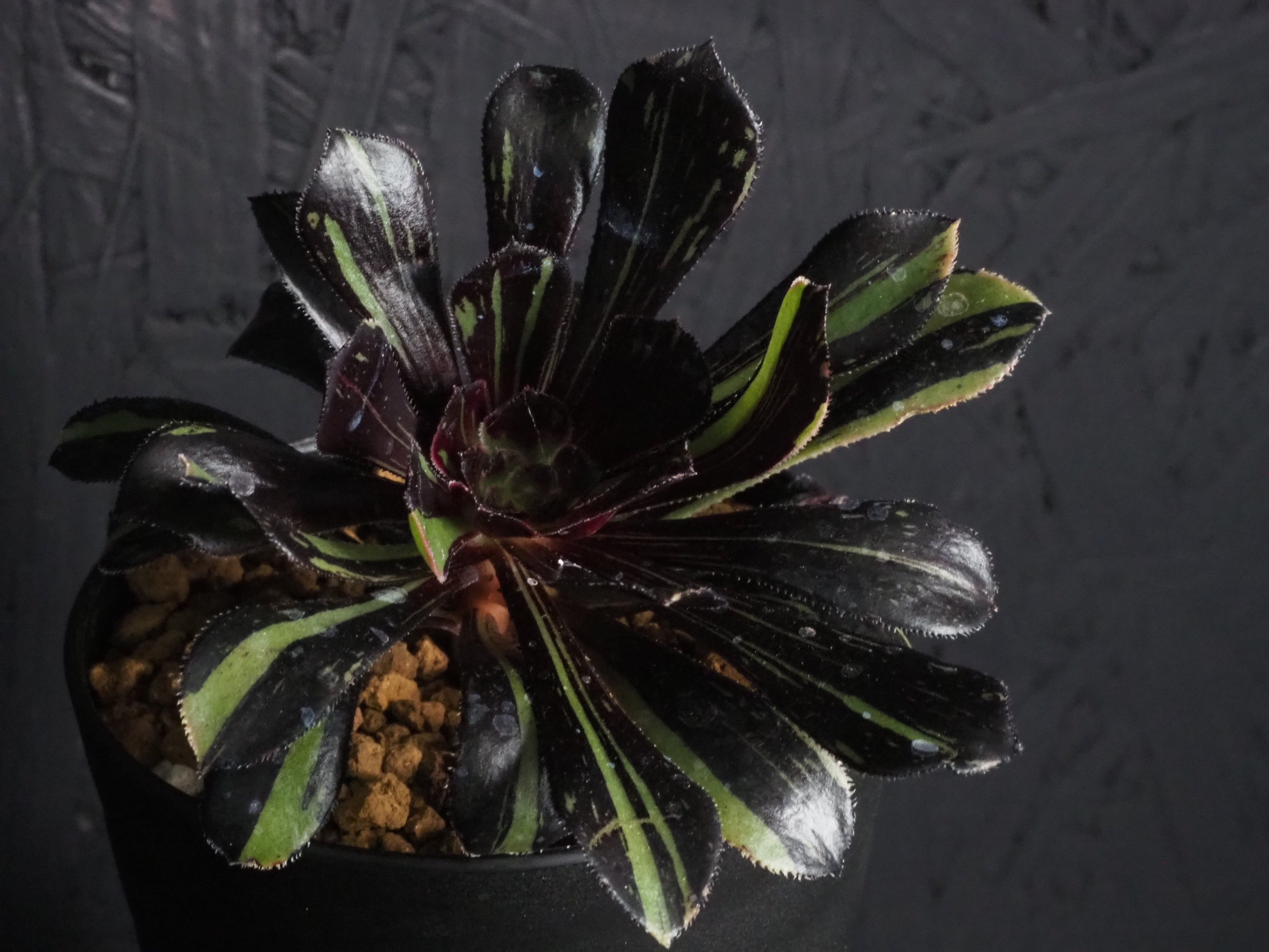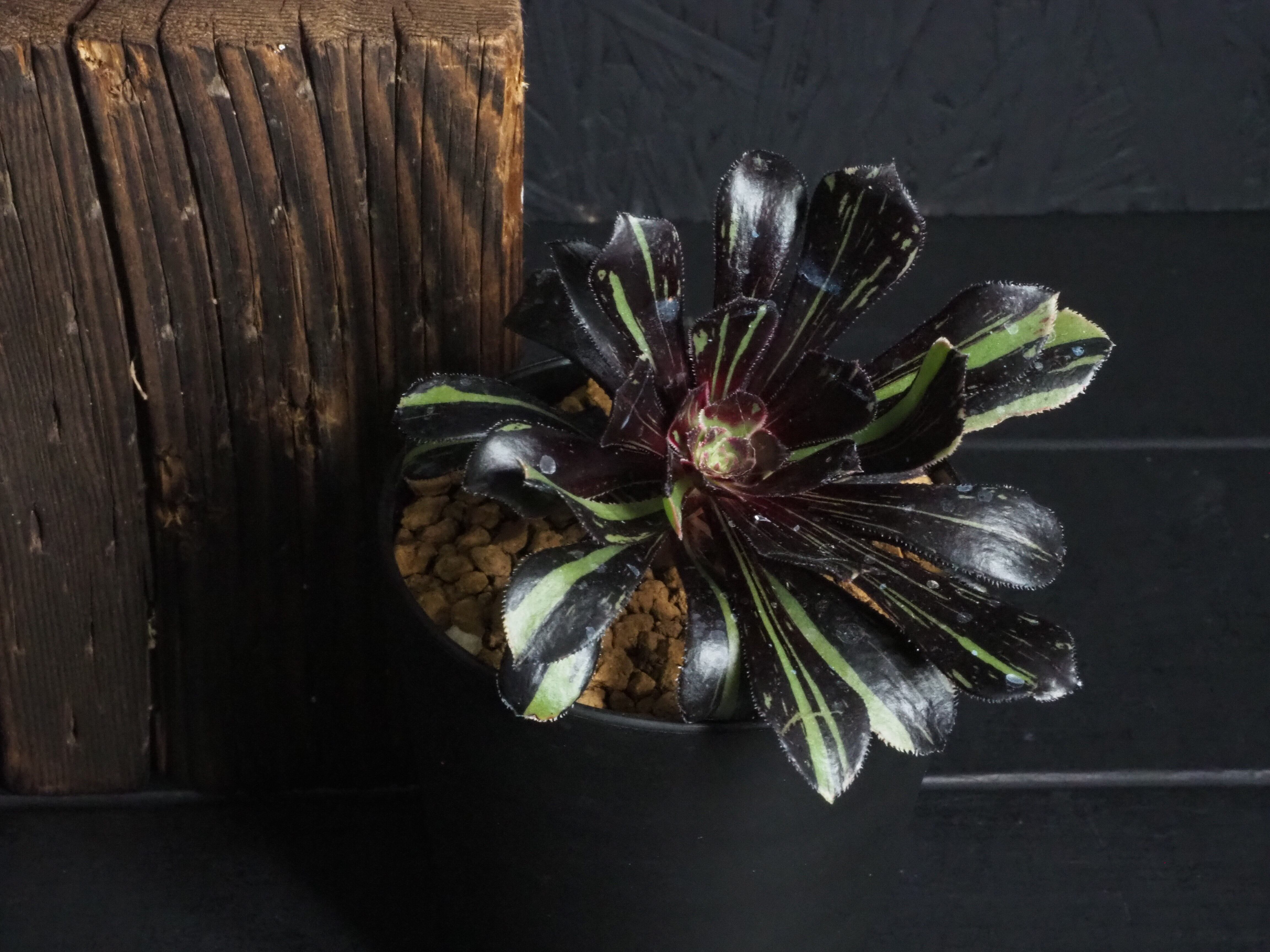 冬型植物のアオエニウム「ビックバン」、細い縞斑が入るタイプです。