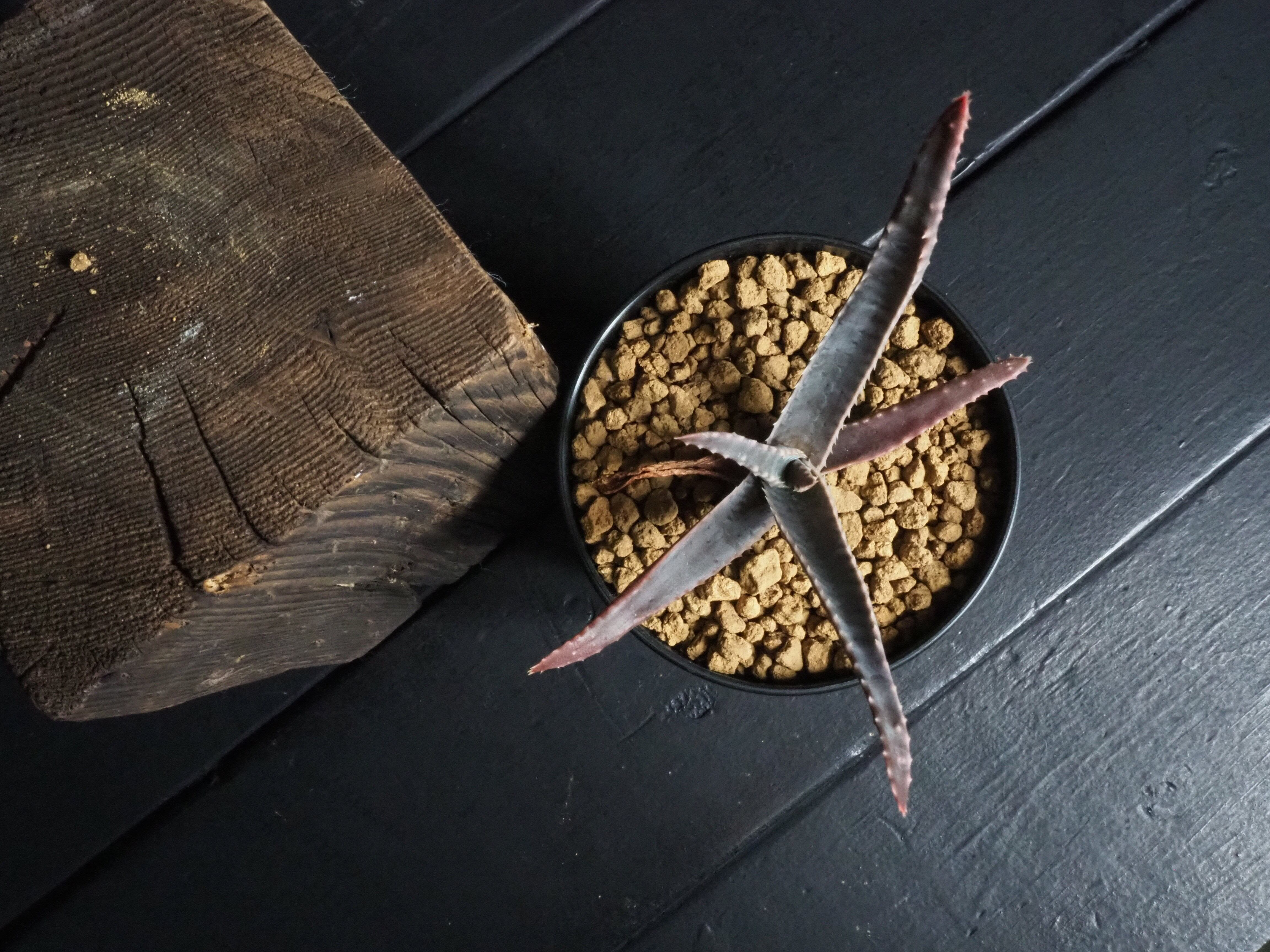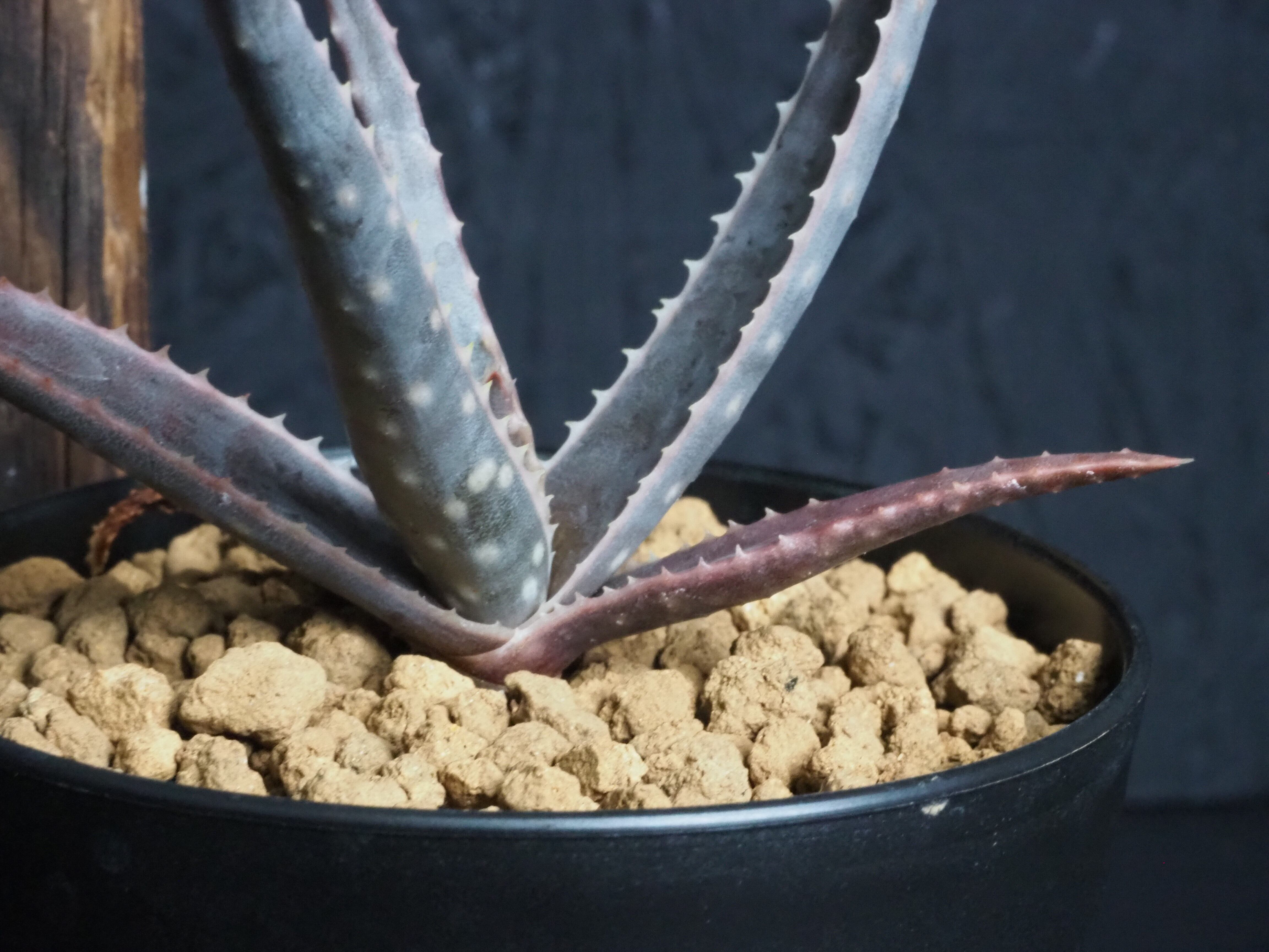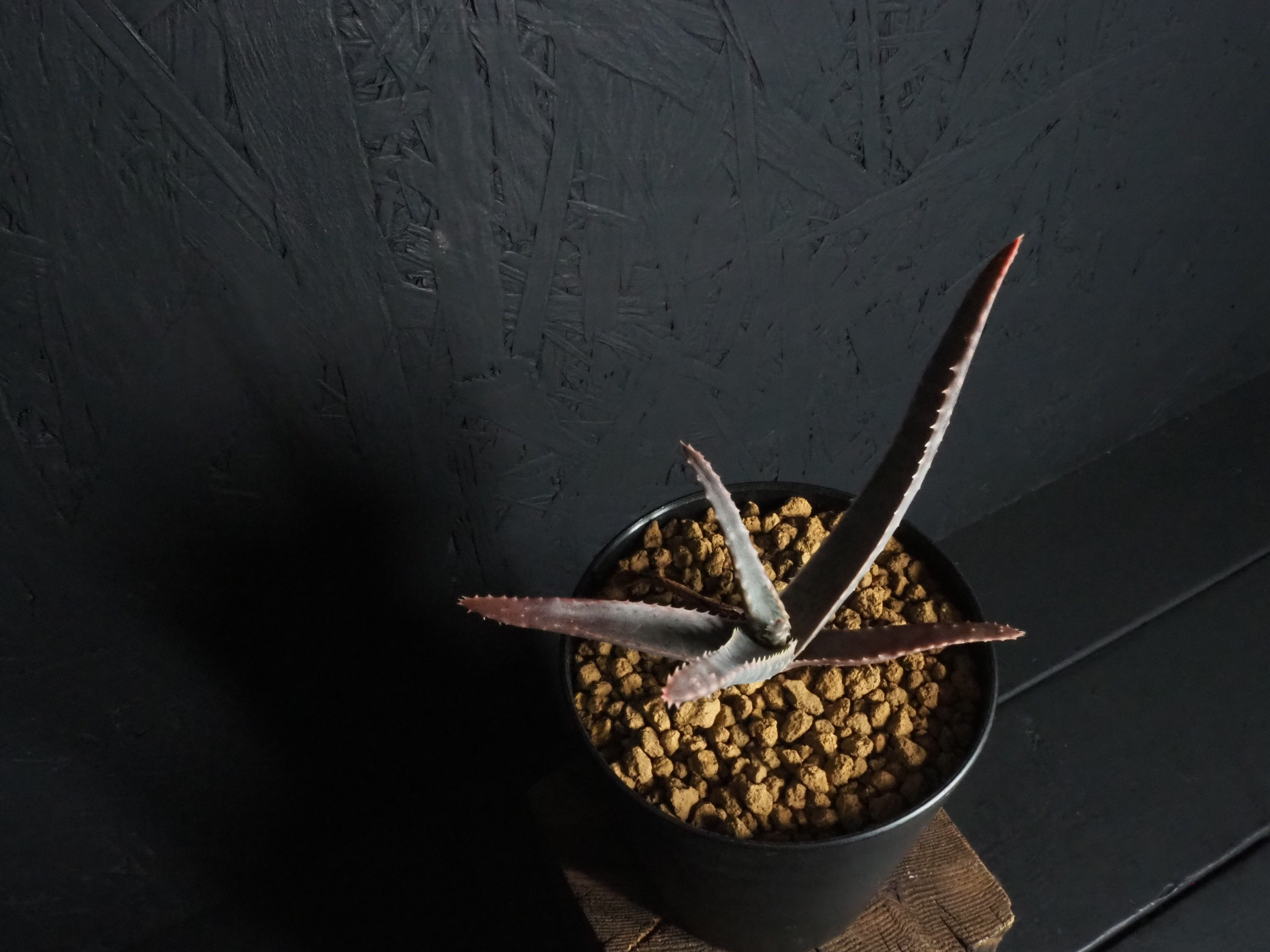 苦笑赤銅色や赤褐色と形容すれば良いのか、ハイブリッドな赤みを帯びた茶系・オレンジ色がの葉が魅力的なアロエ・レアンドリー、基本グリーンアロエなので環境によって色味の濃淡は変化します。店主は見たことがありませんが、花色はピンクから黄色のバイカラーが咲くそうです。