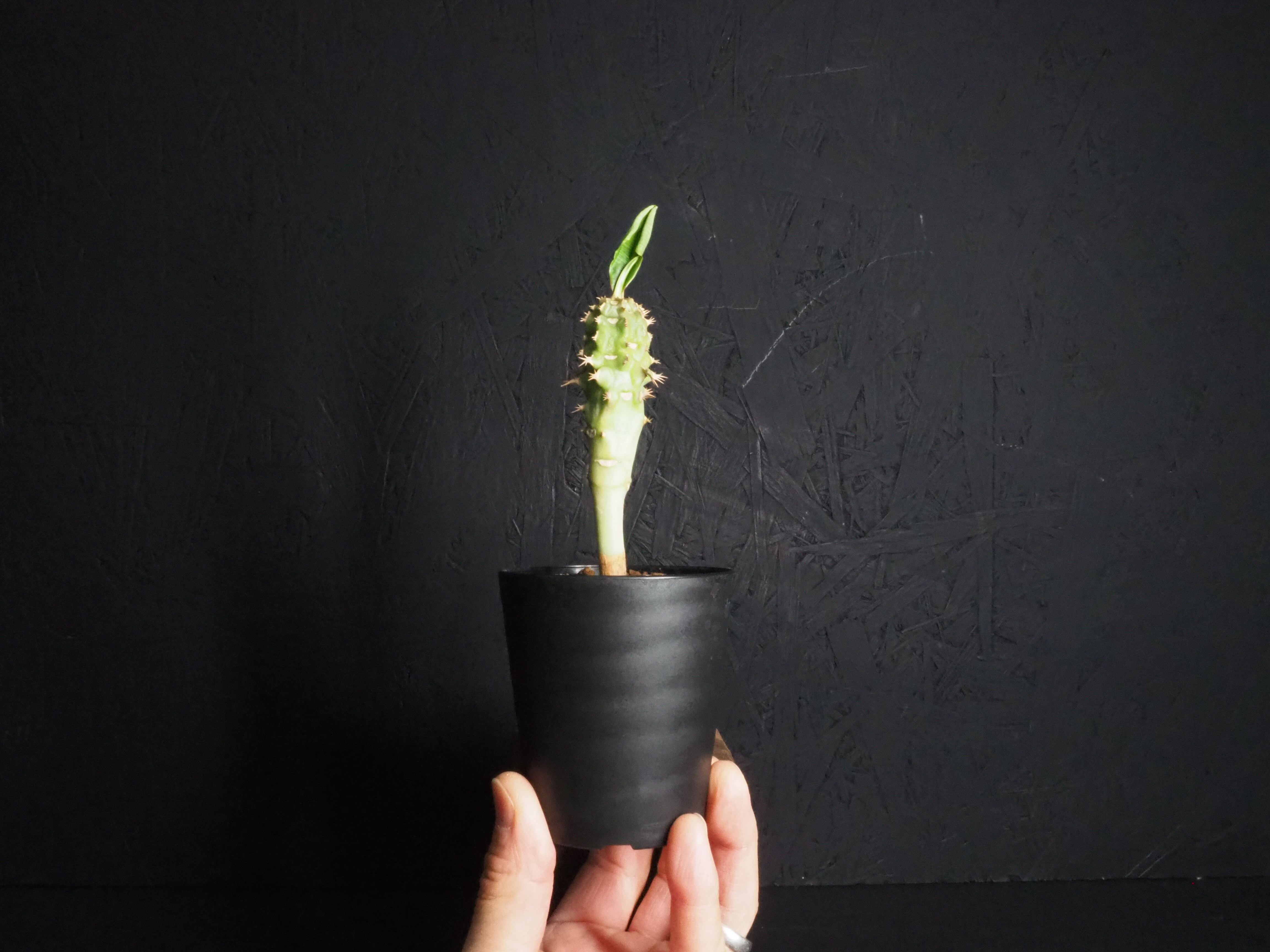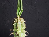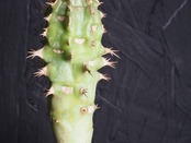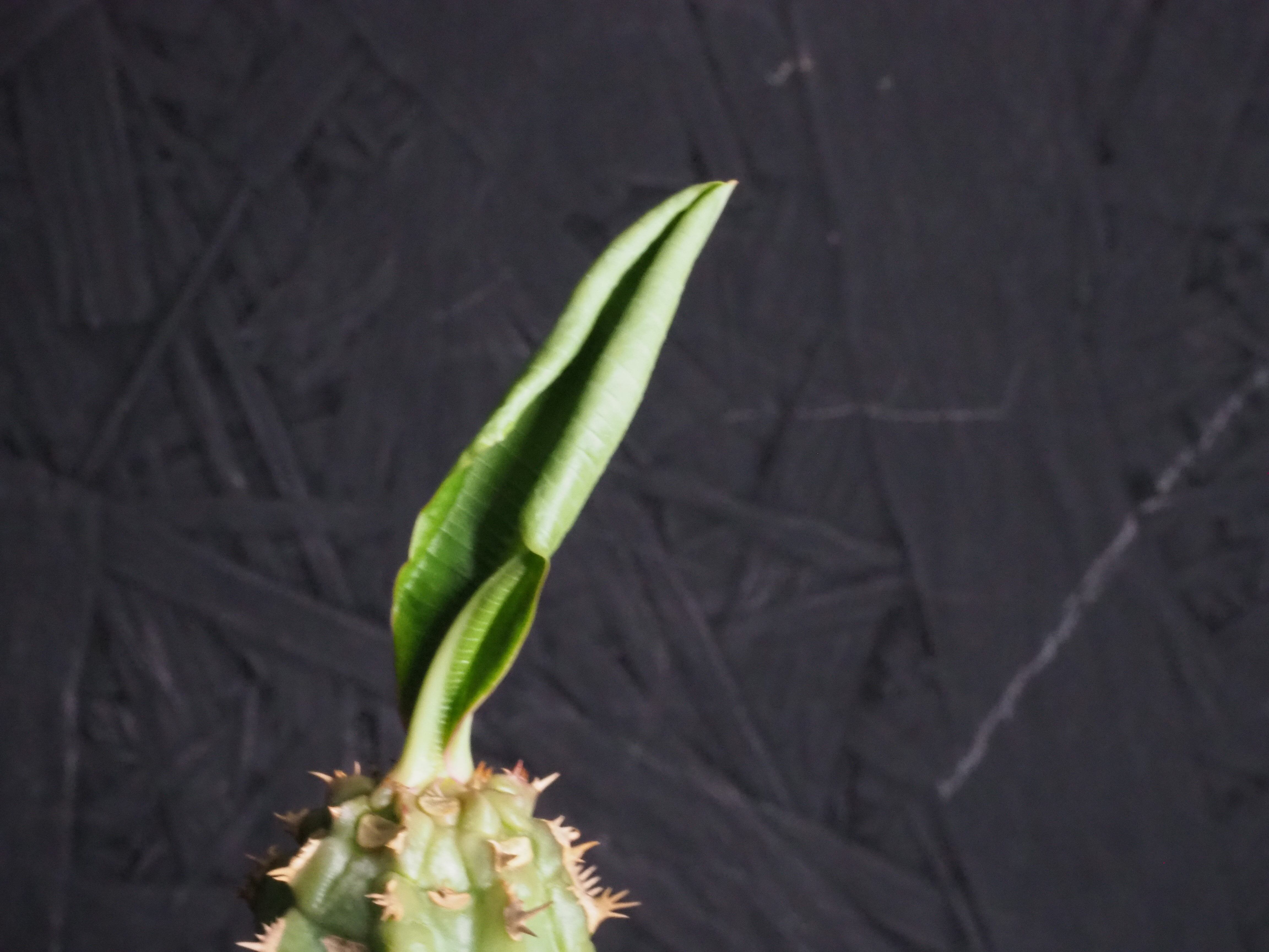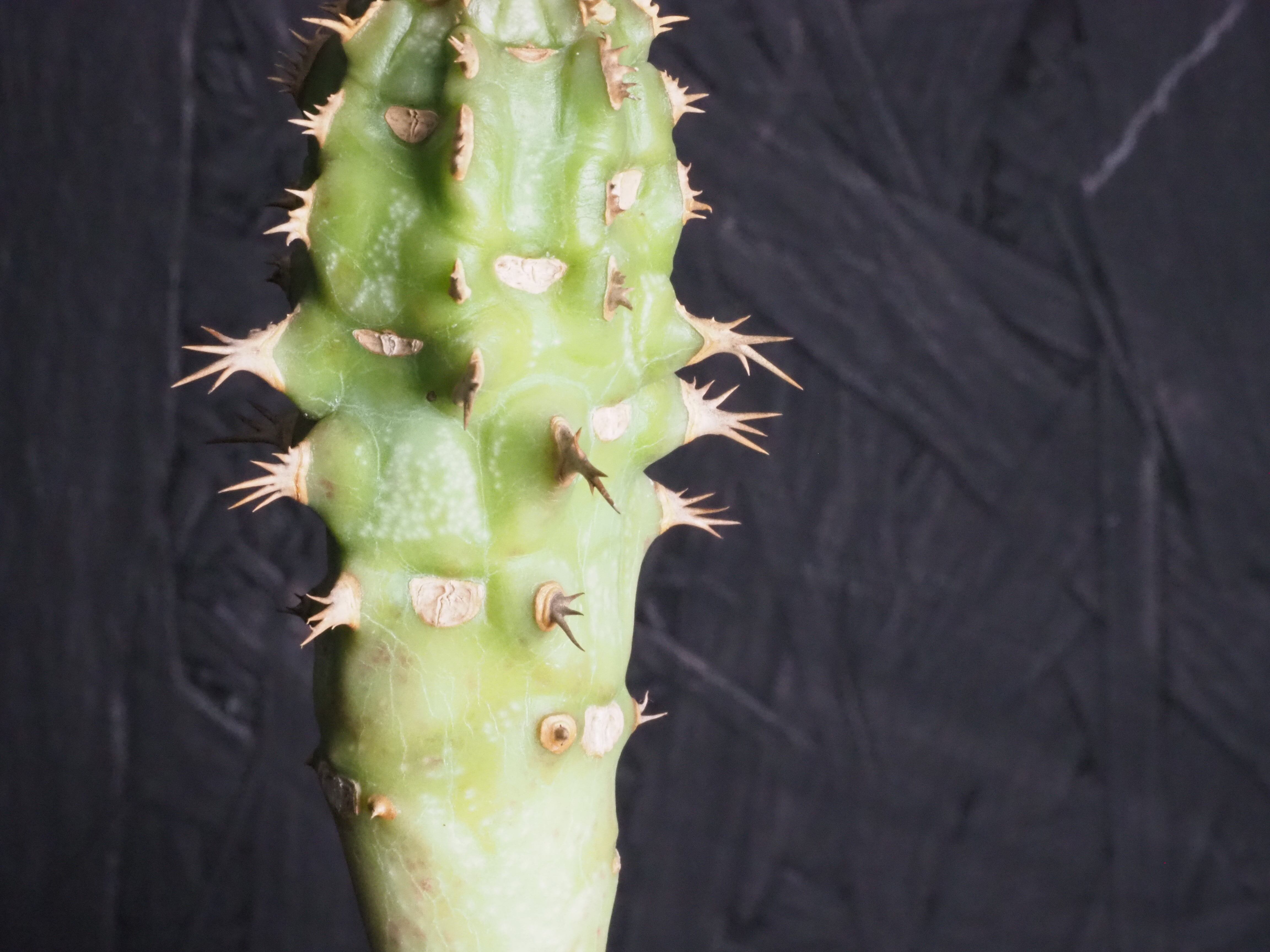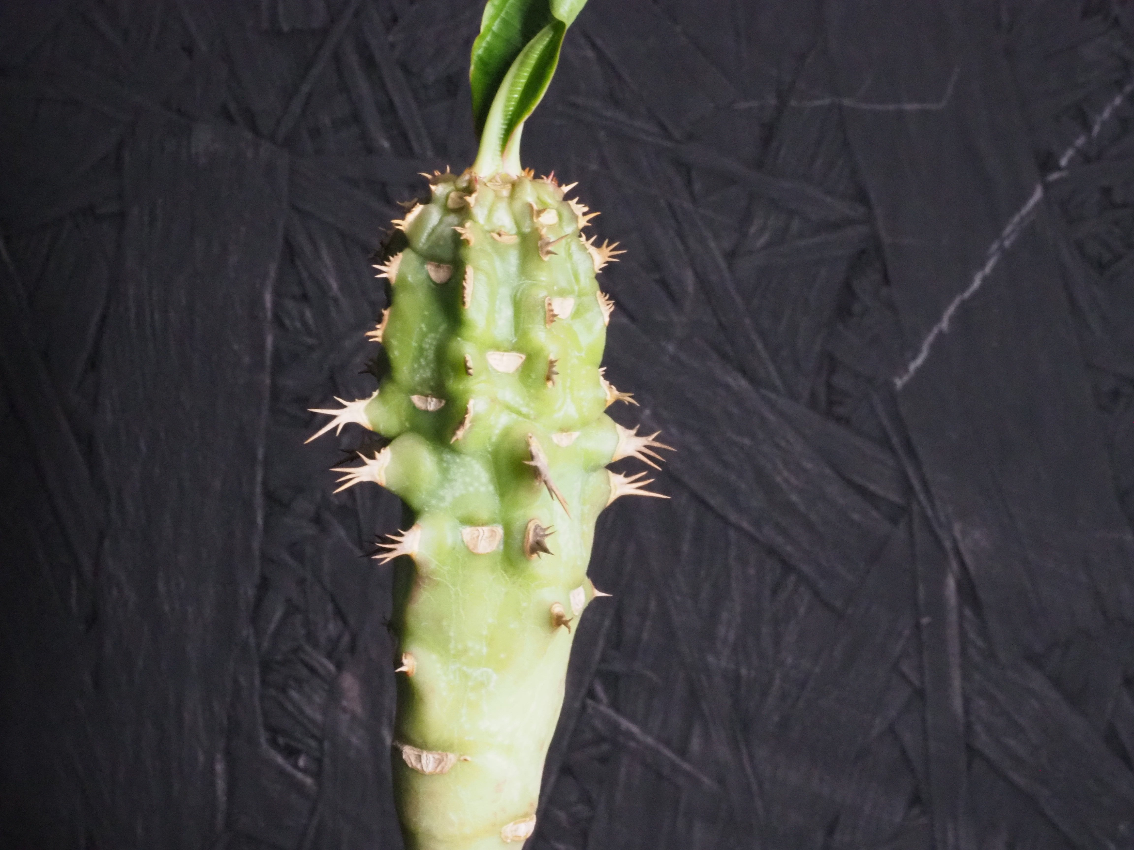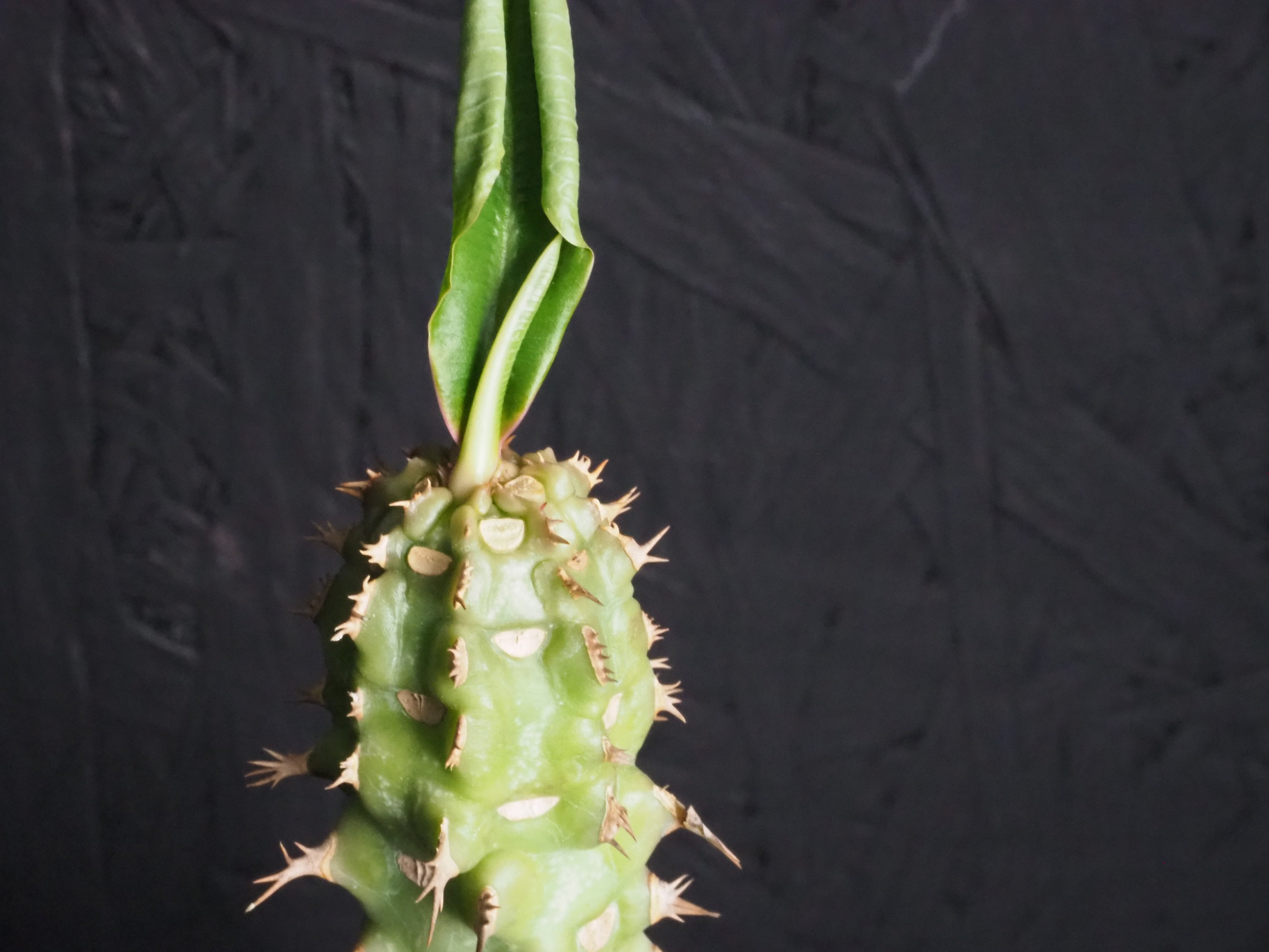 強そうな名前「噴火竜」、ゴツゴツ幹には突起と棘があり、こん棒みたいなボディーをしています。天辺の生長点からパキポのユーフォルビオイデスのように葉を展開します。