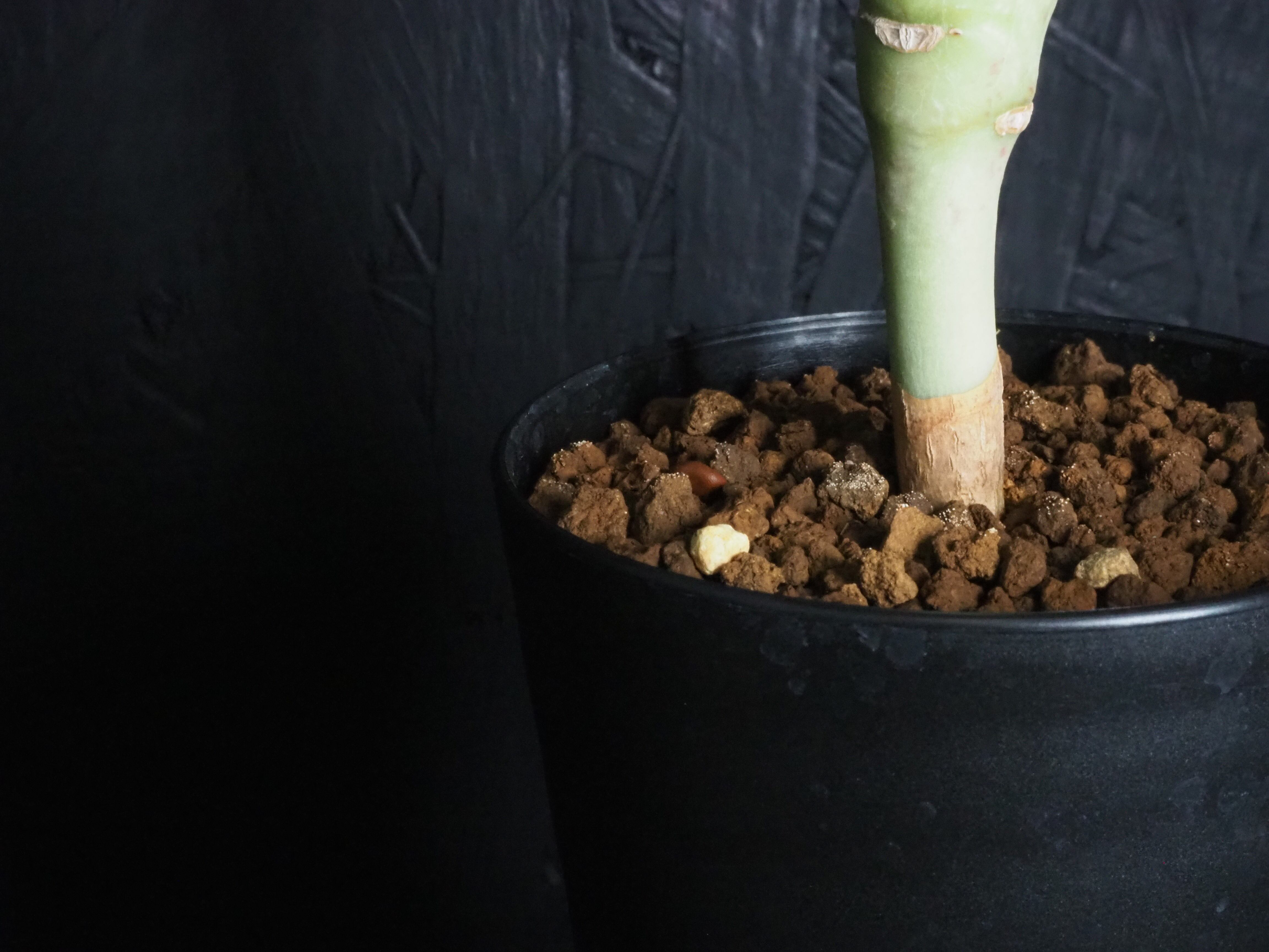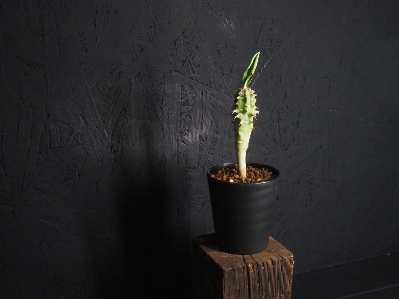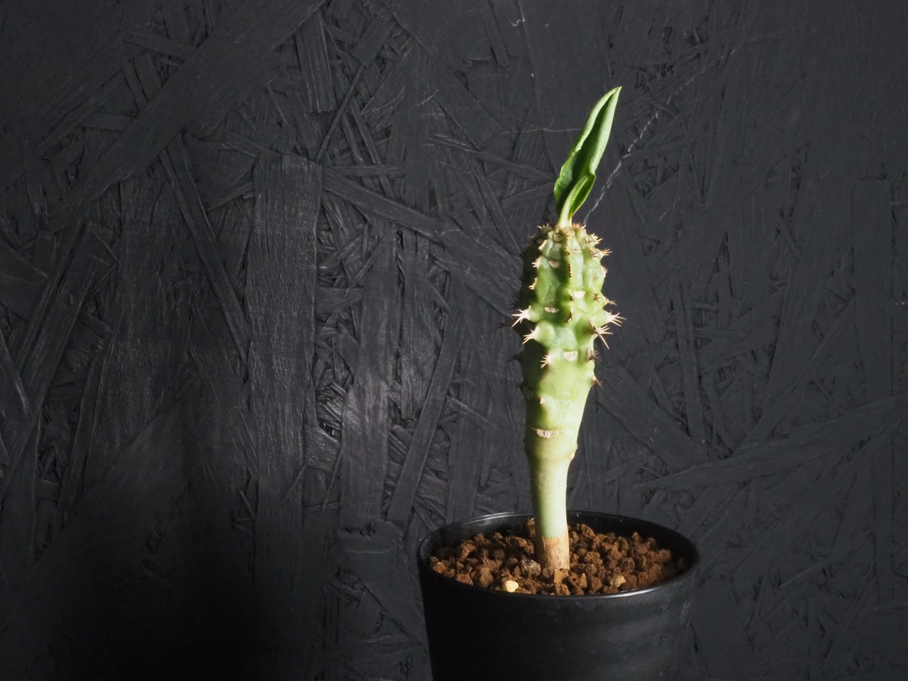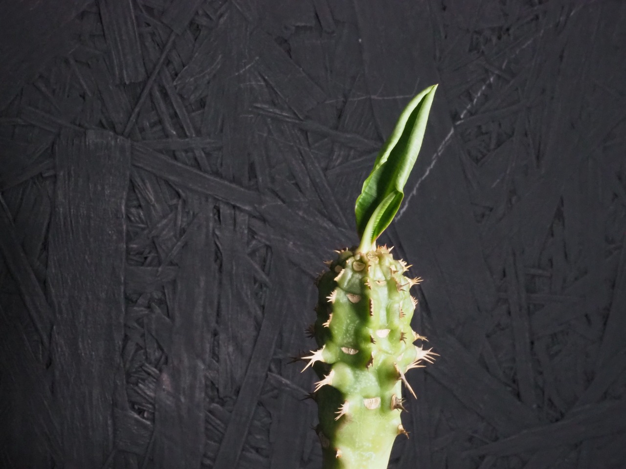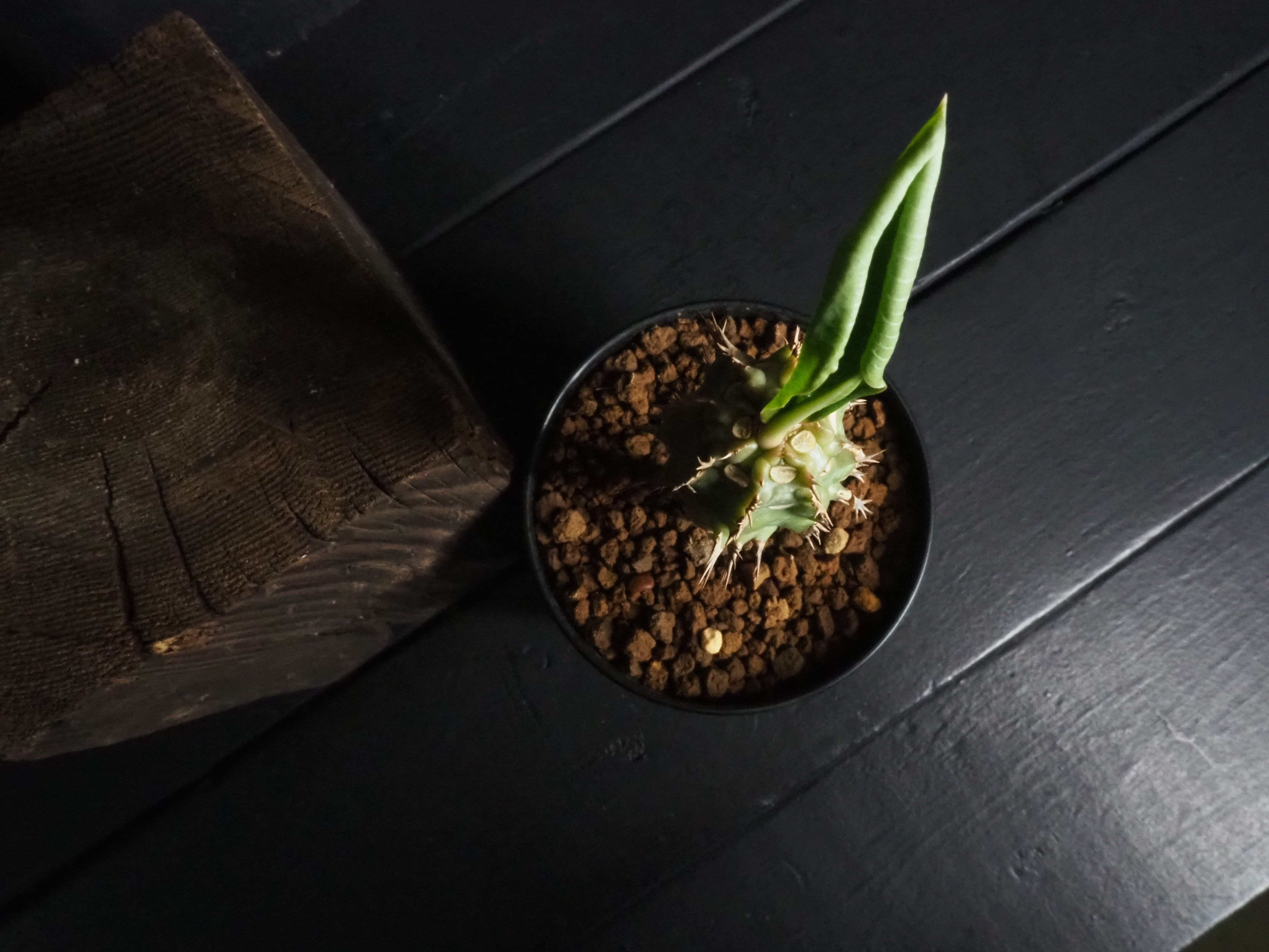強そうな名前「噴火竜」、ゴツゴツ幹には突起と棘があり、こん棒みたいなボディーをしています。天辺の生長点からパキポのユーフォルビオイデスのように葉を展開します。