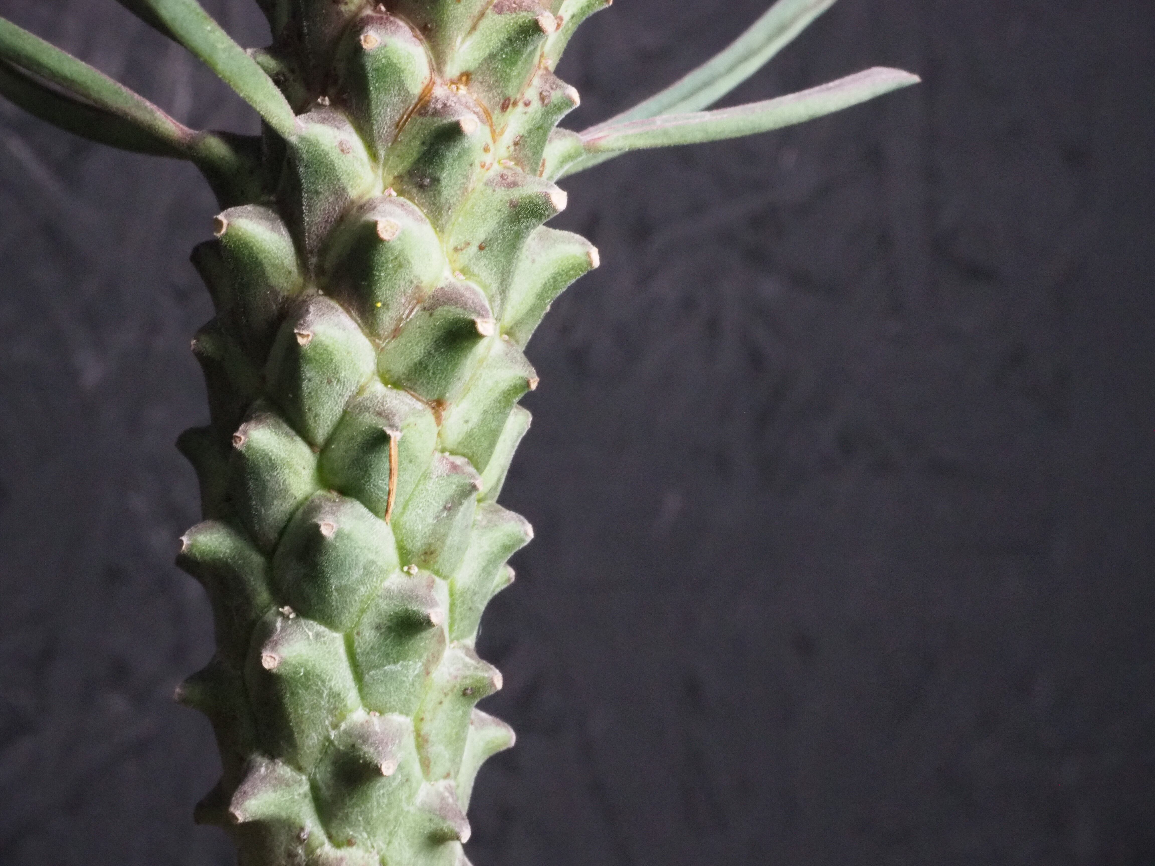 生長して高さが出てくると螺旋を描き、まるで竜の如き容姿に。良く日光に当てると幹は赤みが増し正に『竜』。逆鱗竜の和名は、その容姿と幹のフォルムが竜の鱗が逆立ったように見えるところから付いたのでしょうか。