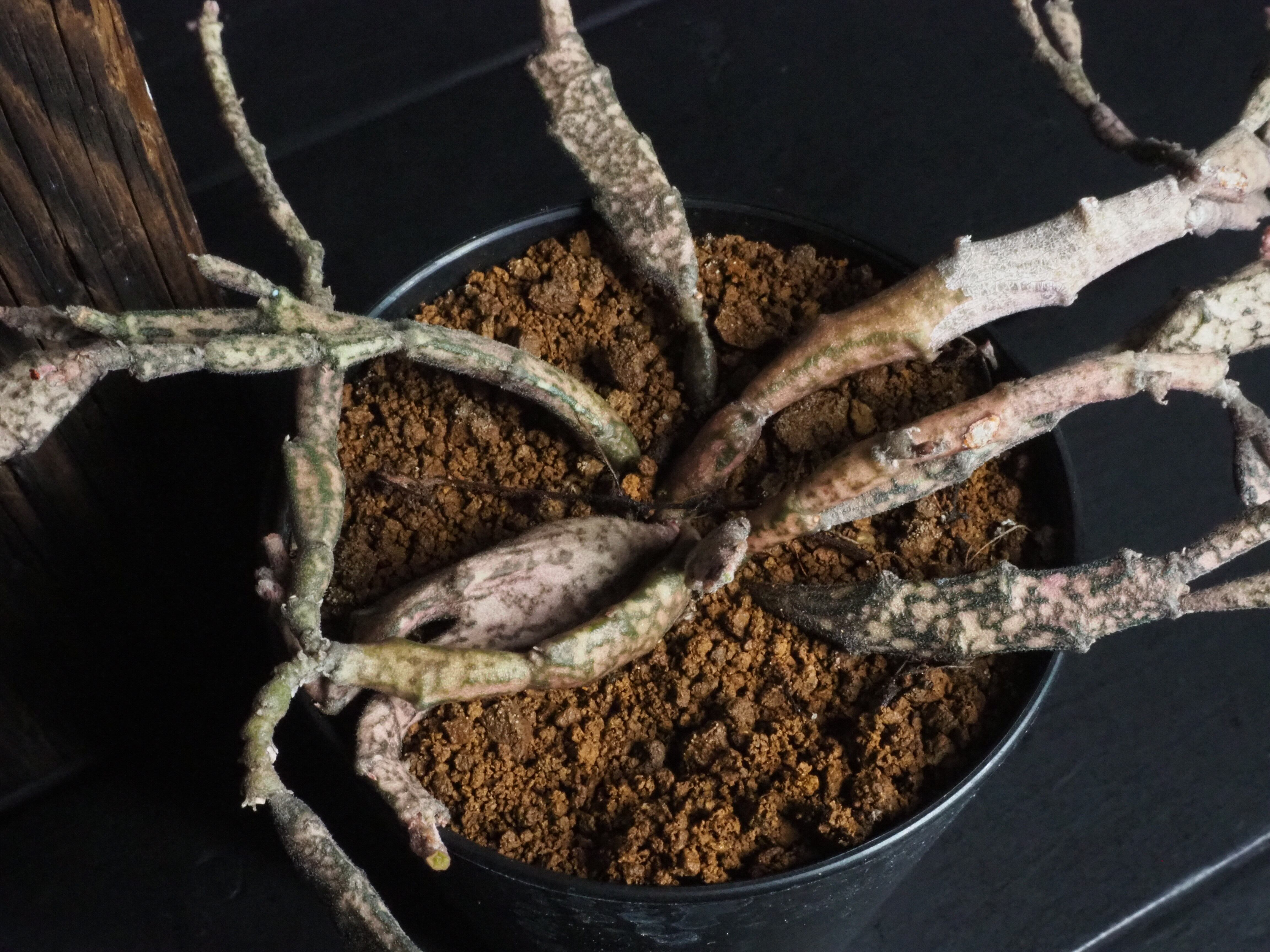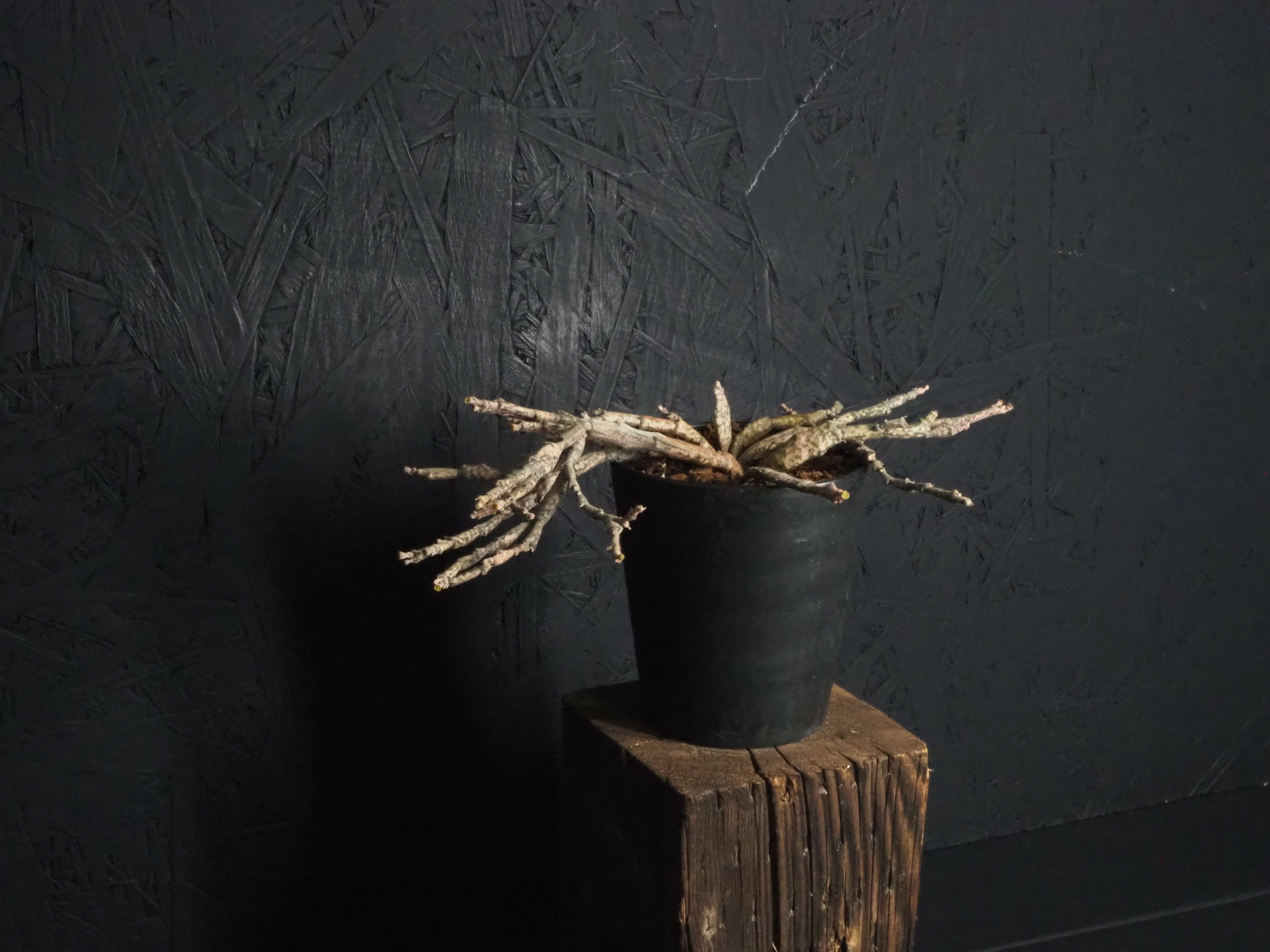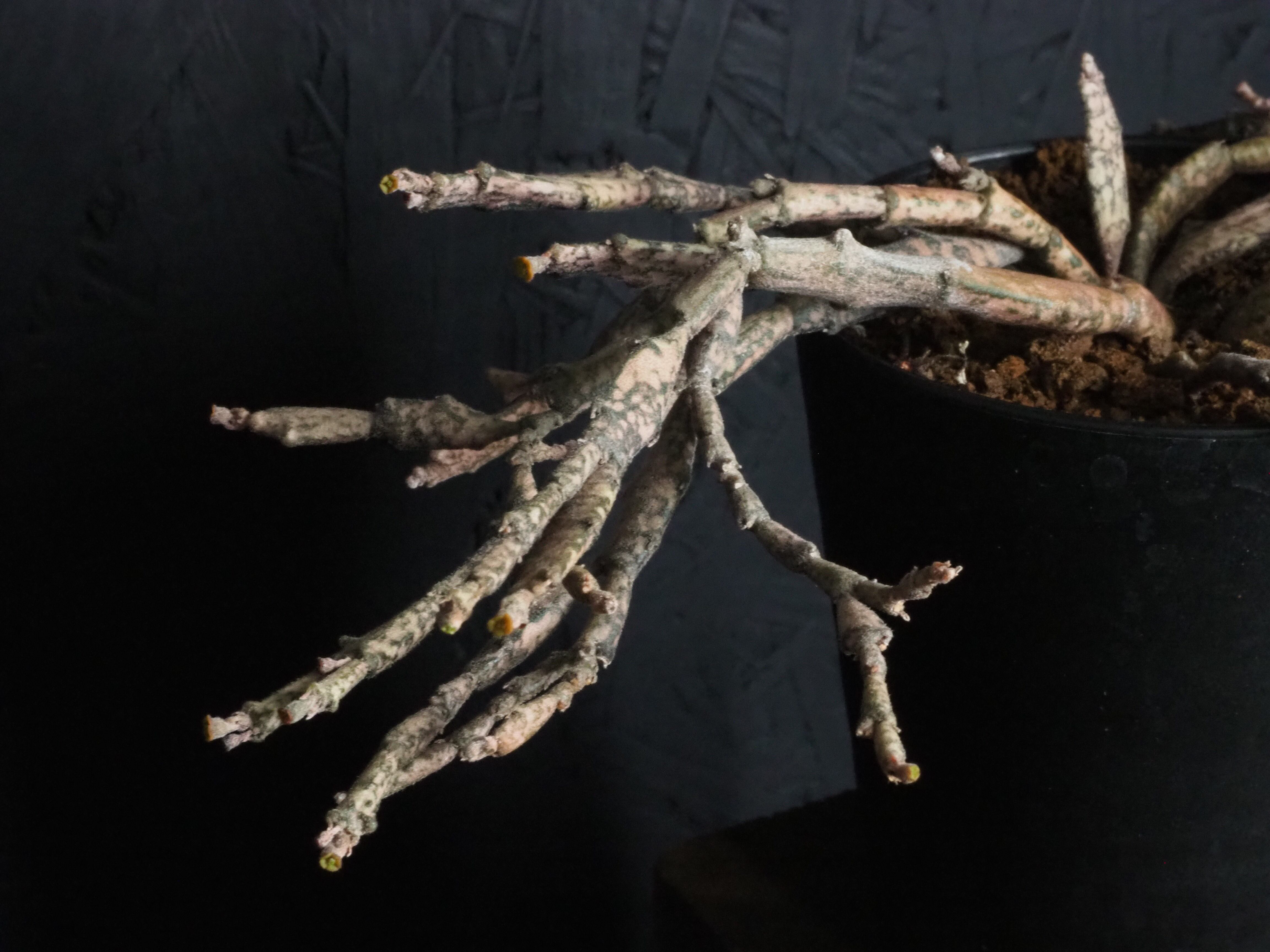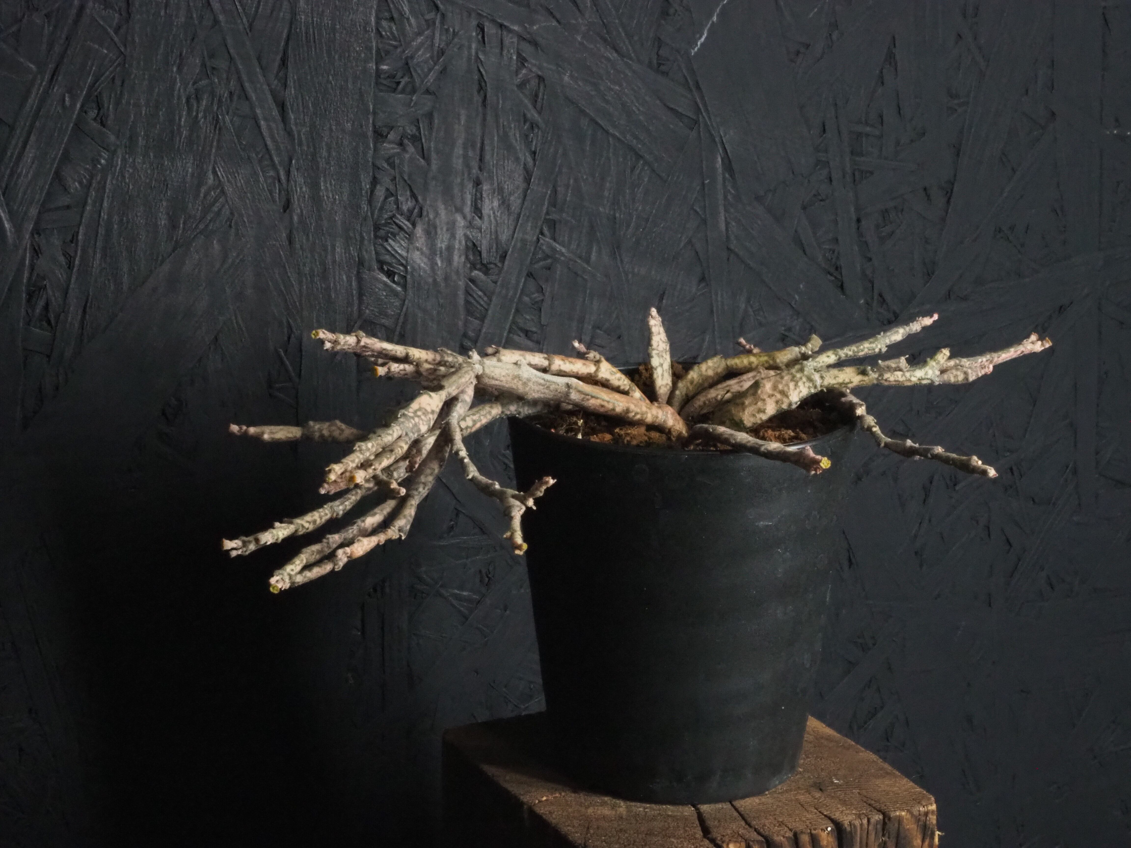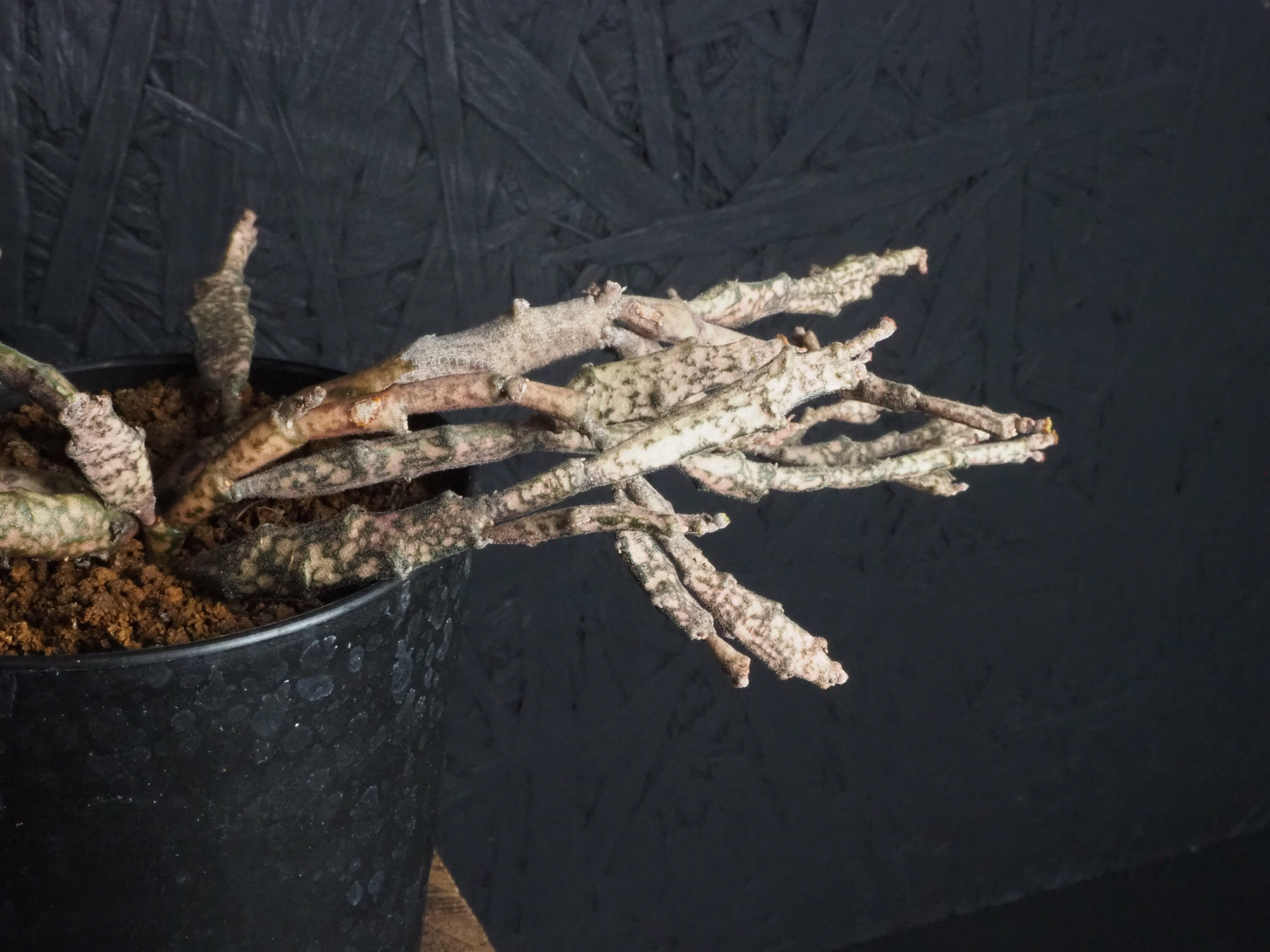 マダガスカル原産で、何とも形容しがたい枝垂れたような折れ曲がったような枝を無数に生やします。多種多様なユーフォルビアの中でも奇妙さでは上位ランキングされる容姿です。茶色いような薄ピンクのような、それでいてちょっぴり緑な部分もある色合いが独特な雰囲気を一層際立てております。