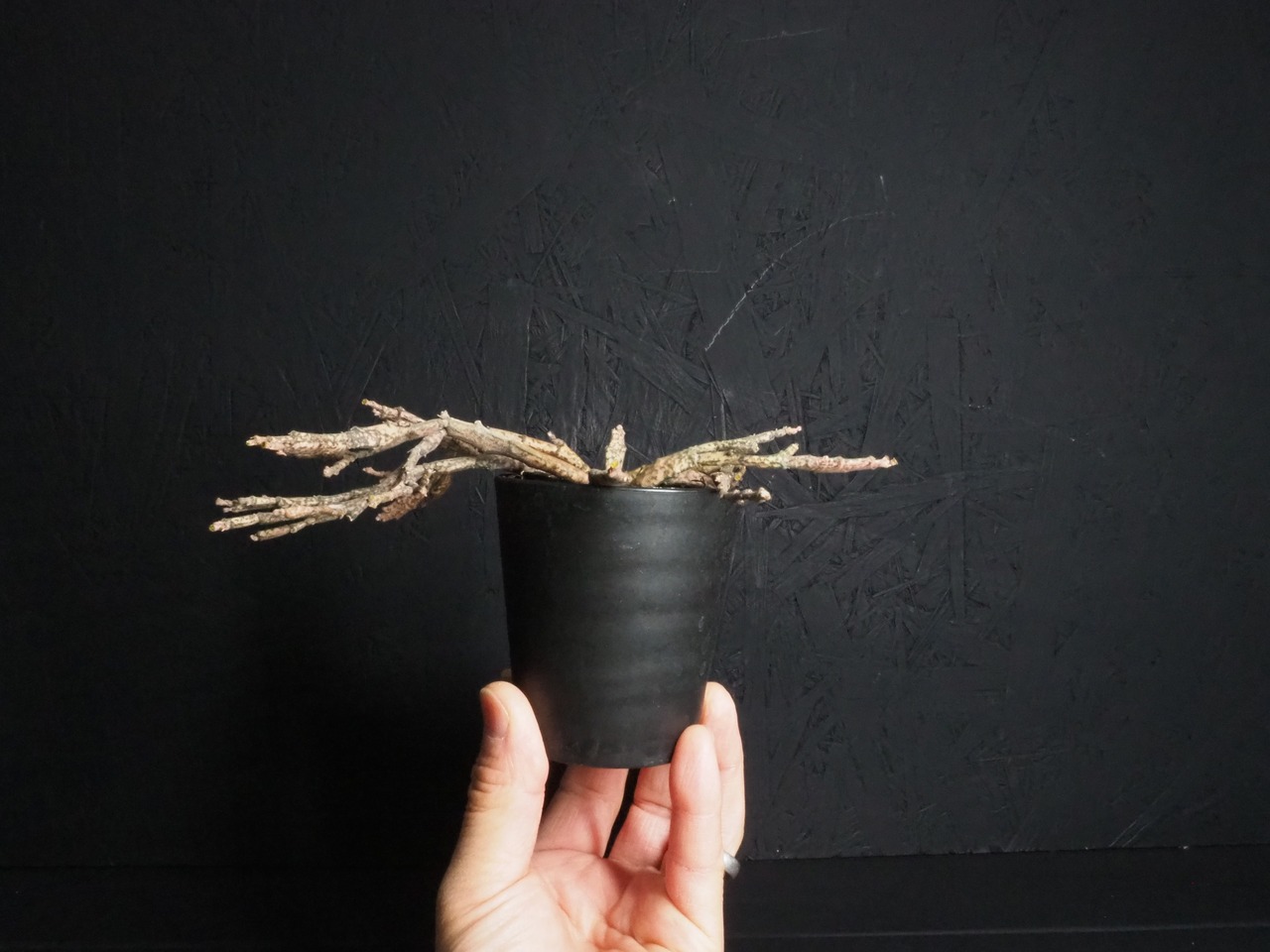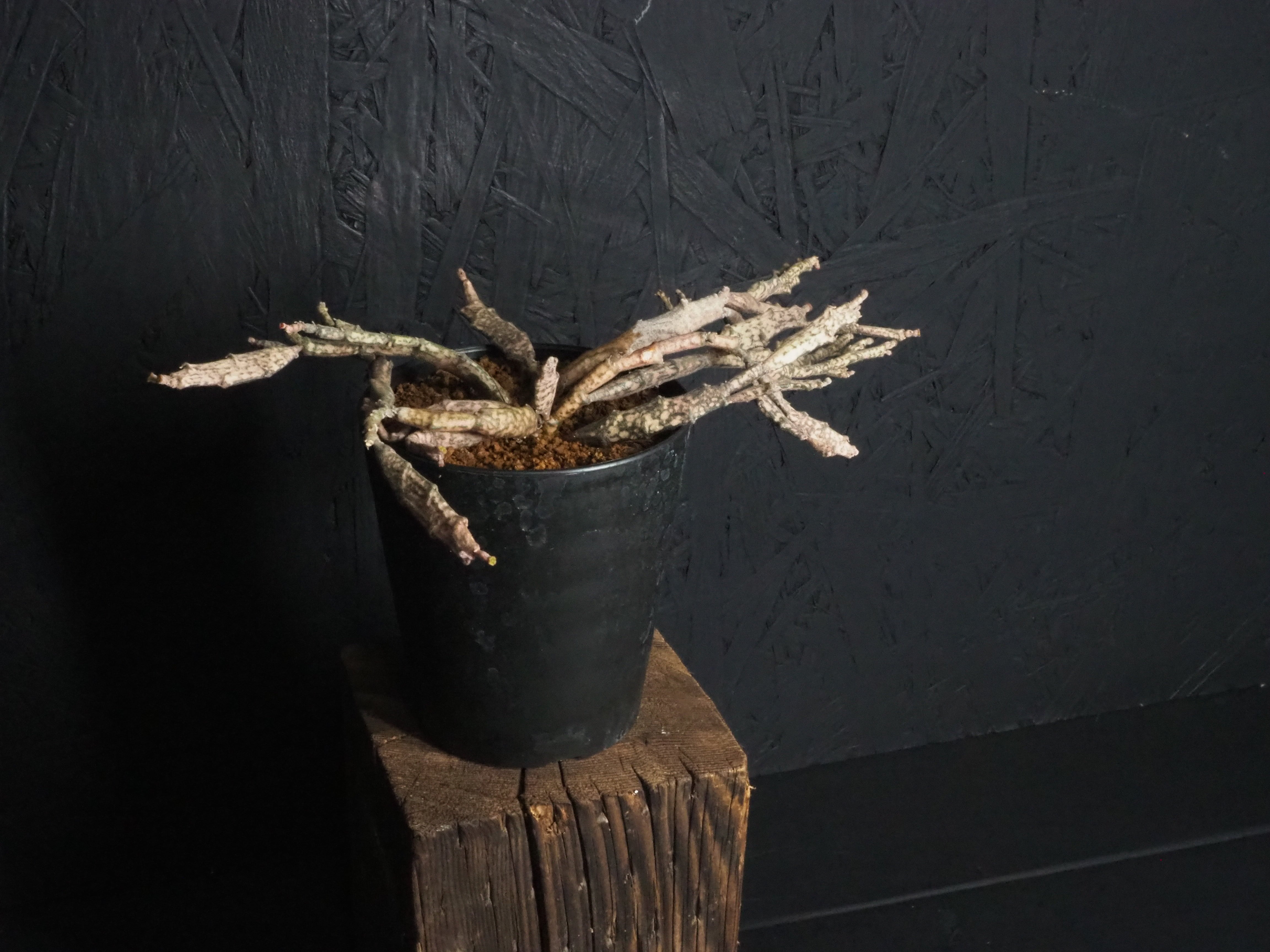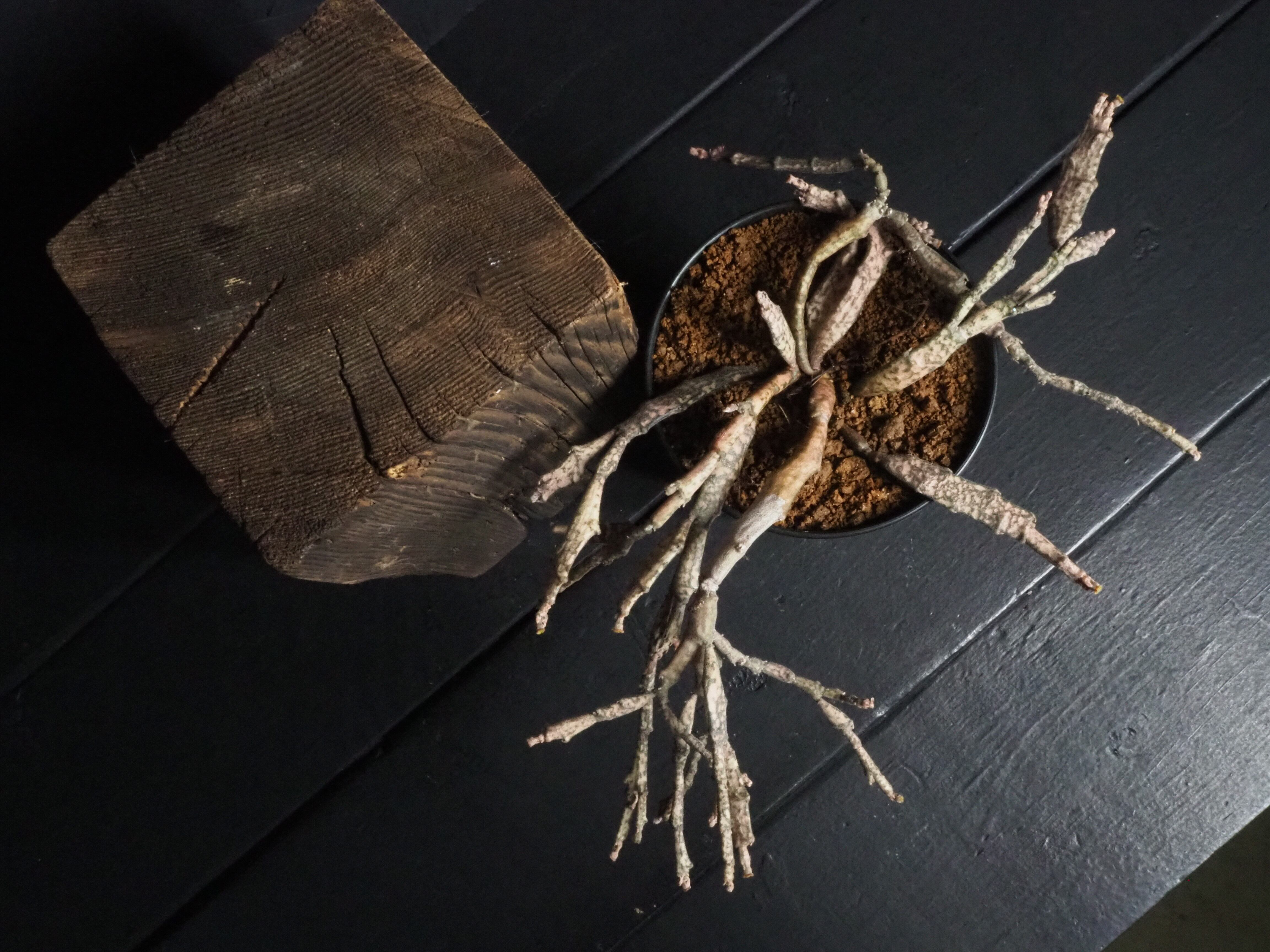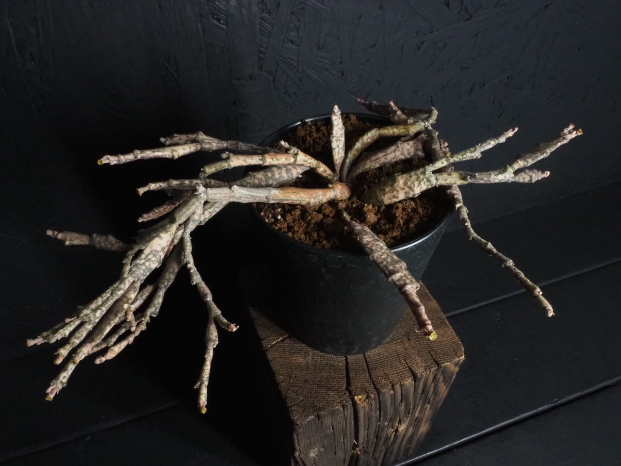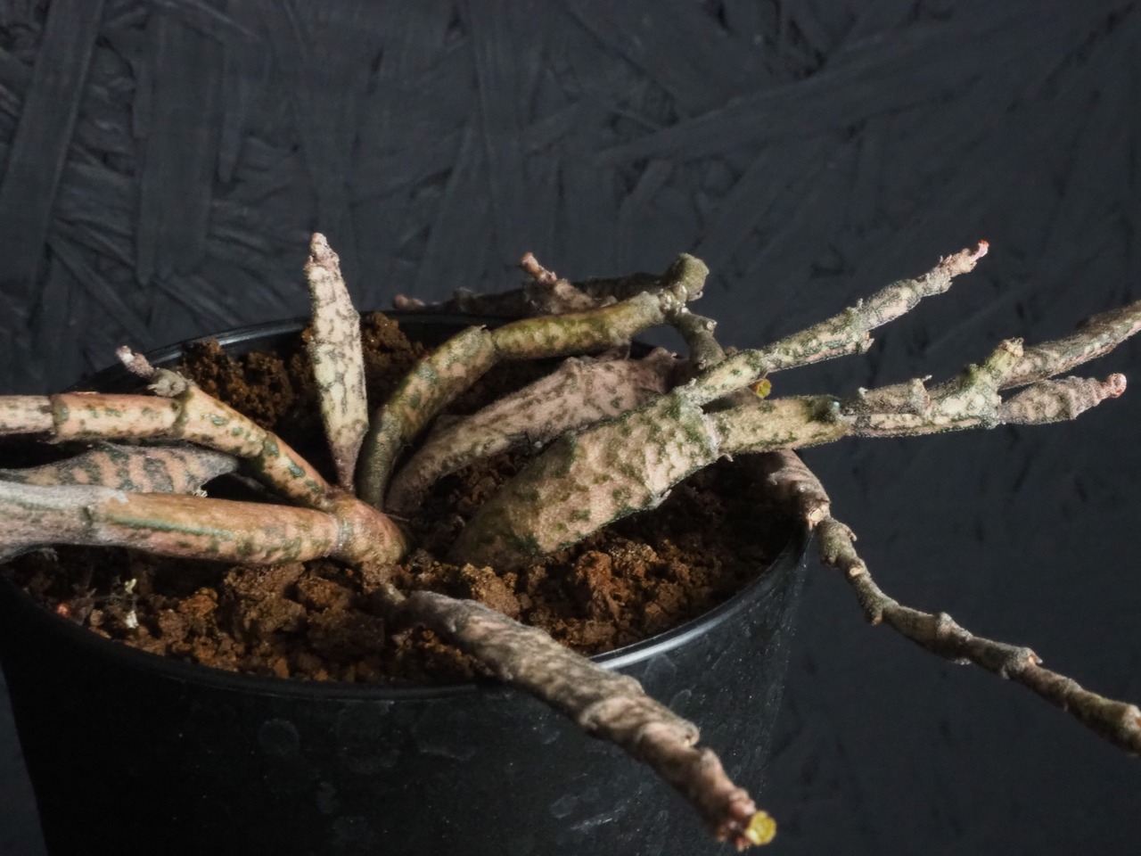 マダガスカル原産で、何とも形容しがたい枝垂れたような折れ曲がったような枝を無数に生やします。多種多様なユーフォルビアの中でも奇妙さでは上位ランキングされる容姿です。茶色いような薄ピンクのような、それでいてちょっぴり緑な部分もある色合いが独特な雰囲気を一層際立てております。
