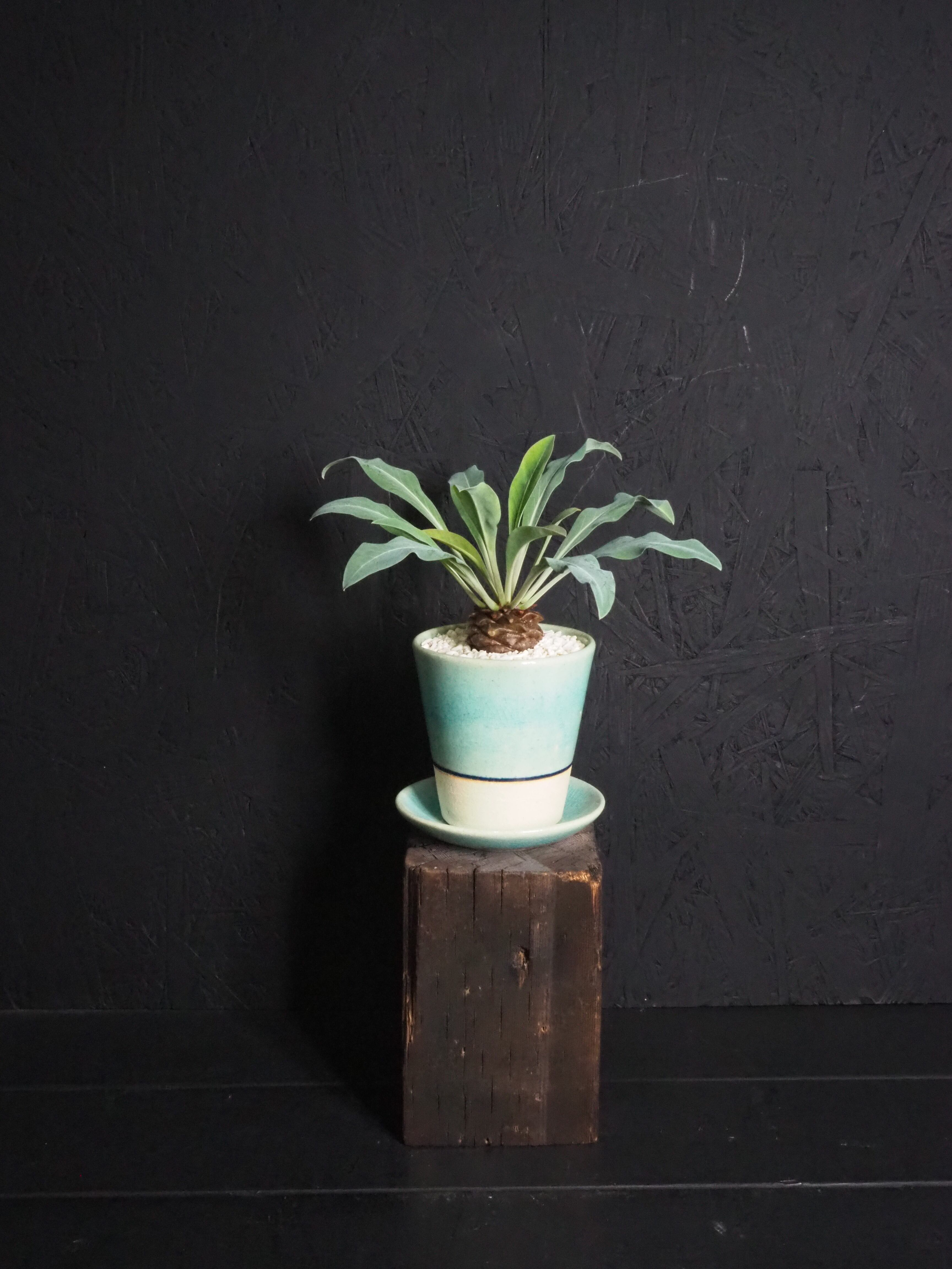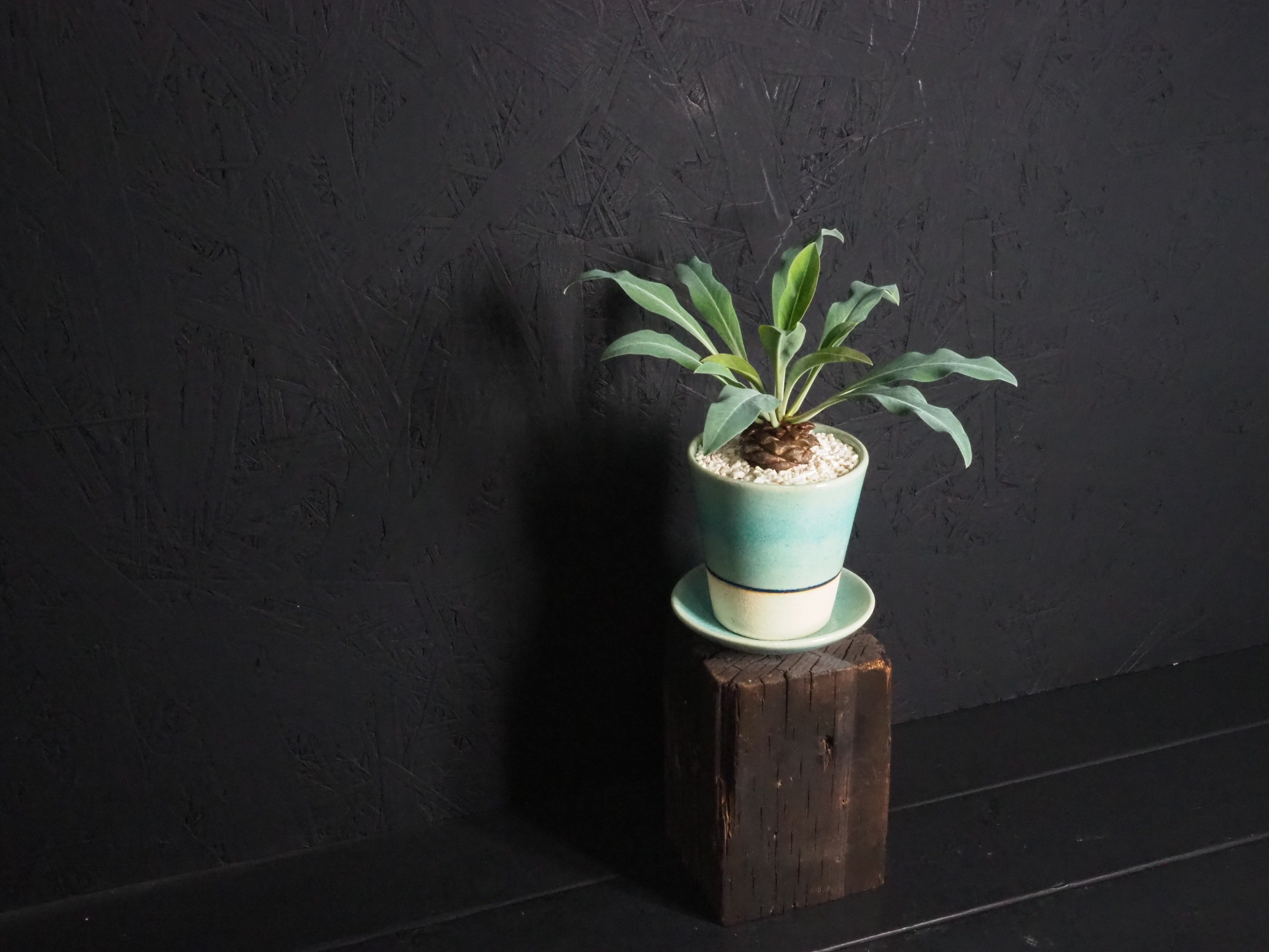 この鉄甲丸は実生二年生の個体で、まだミニサイズですがしっかりした幹を形成して立派な葉を展開しています。Made in japanの信楽薬~Trad blueに仕立て、美しい青味掛かった色の葉と相性抜群すね♪