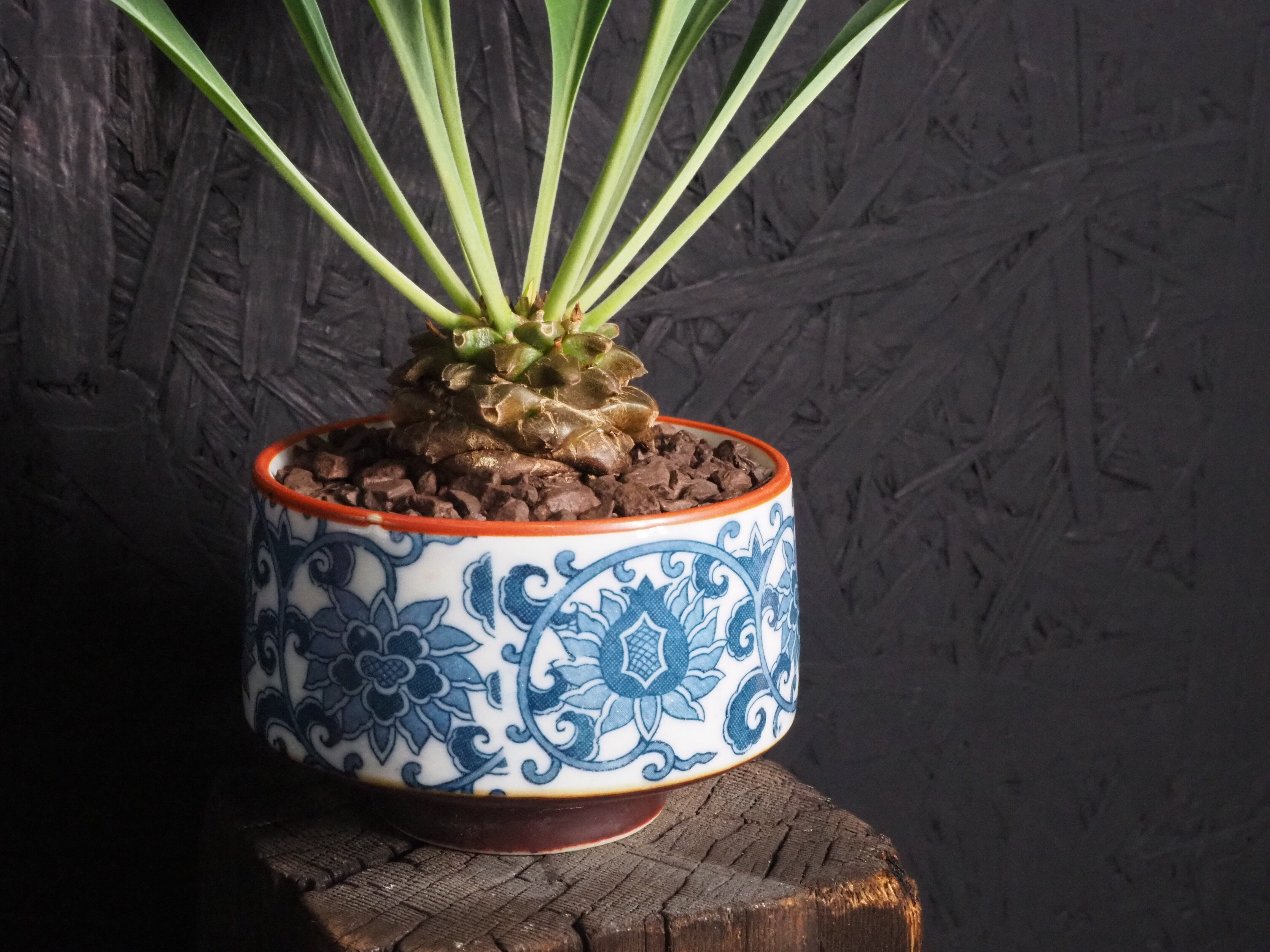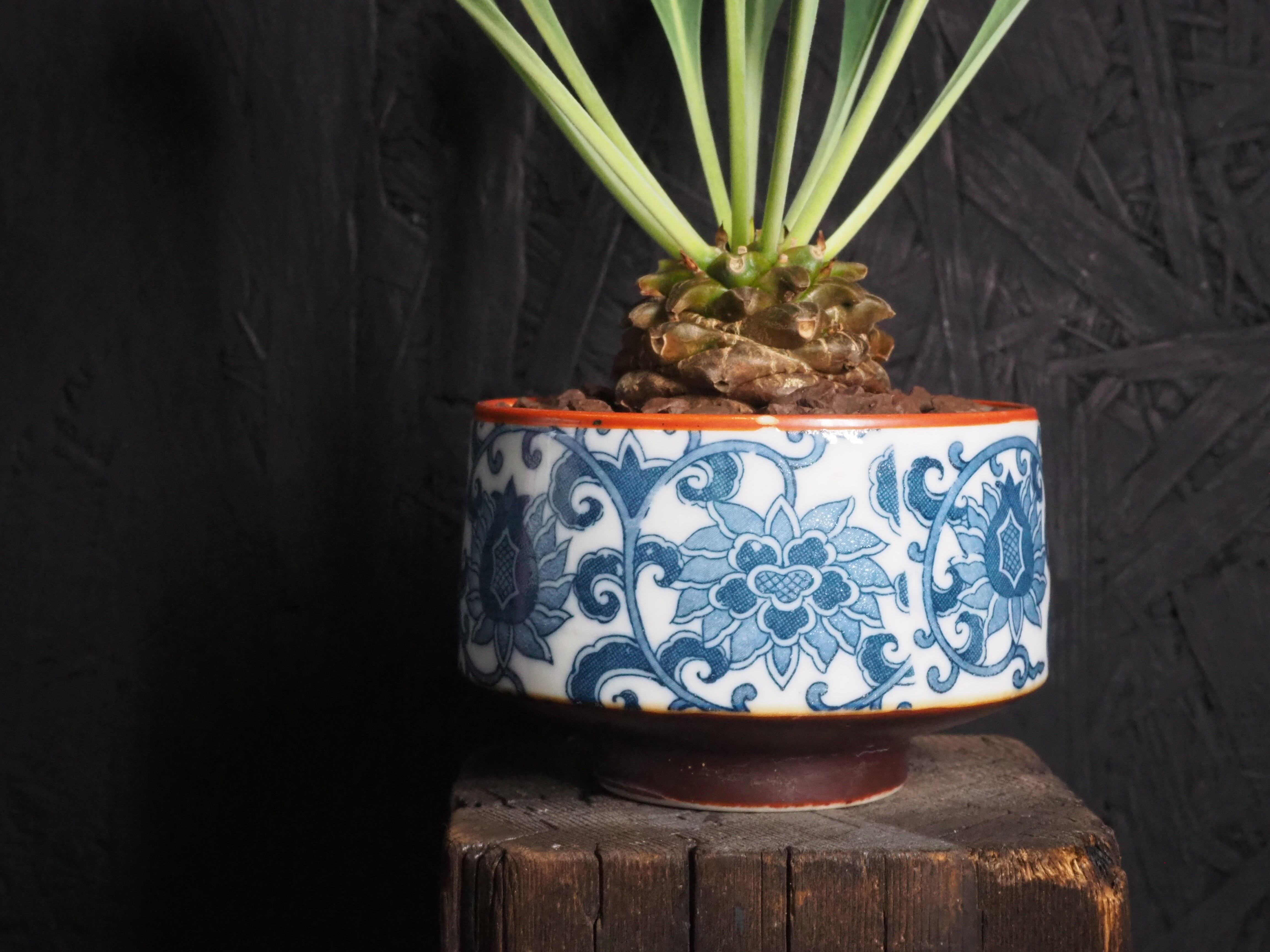 この鉄甲丸は実生二年生の個体で、まだミニサイズですがしっかりした幹を形成して立派な葉を展開しています。昭和の雰囲気漂う湯呑を鉢にお直し、レトロな雰囲気を醸し出しております♪