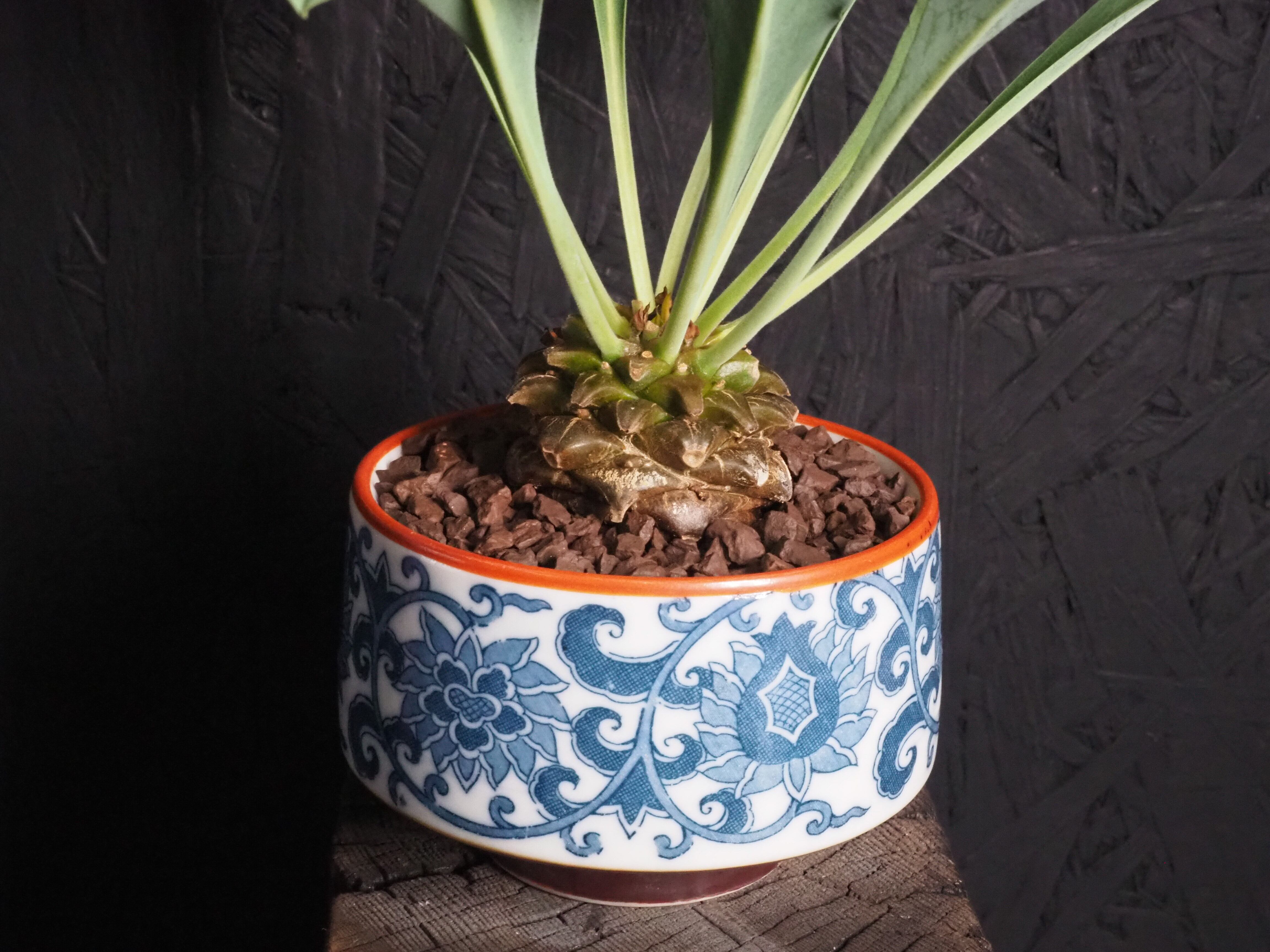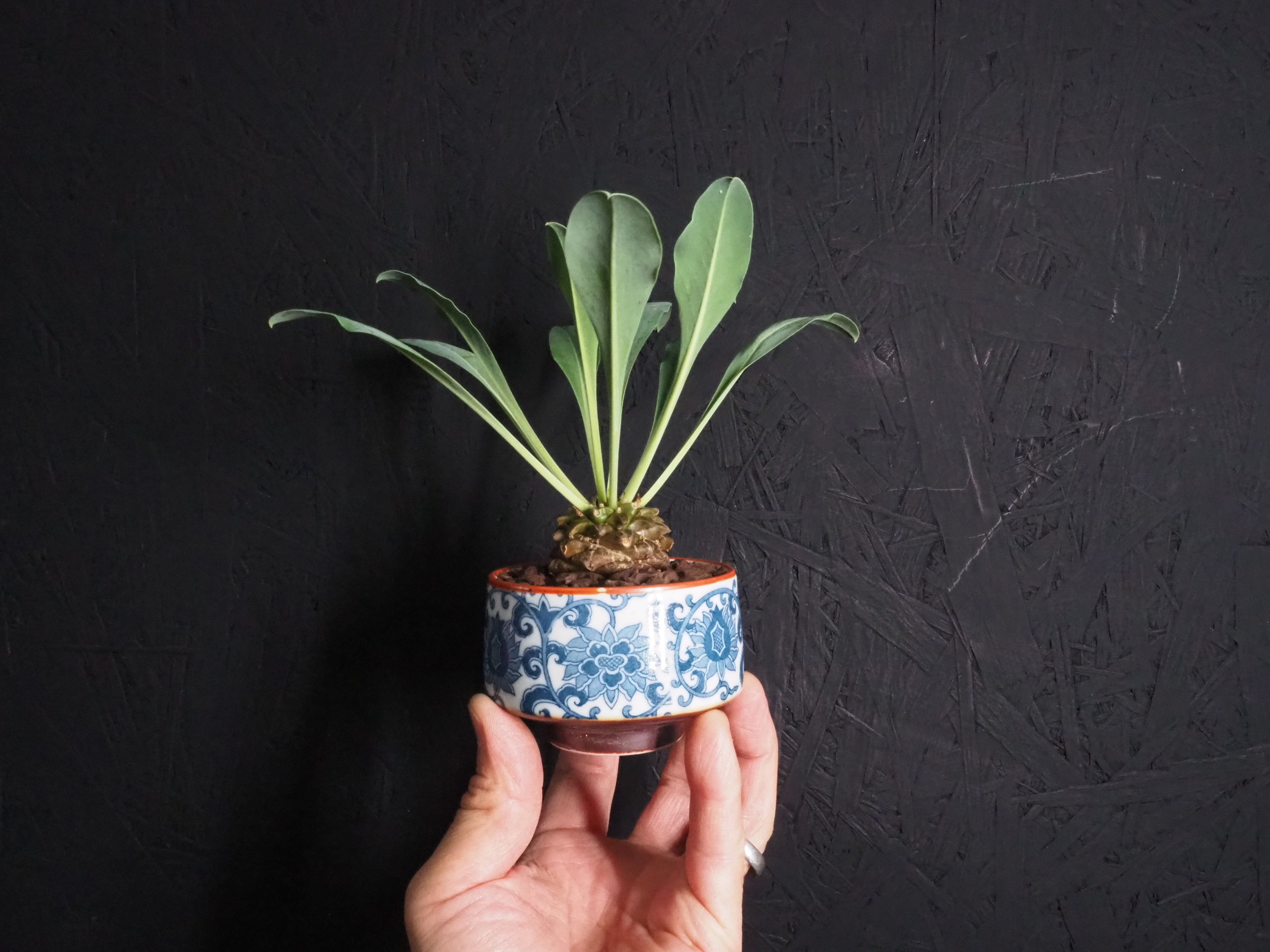 美しい青味掛かった色の葉を放射状に展開し、雌雄異株で花を咲かせます。この鉄甲丸は「雄株」になります。