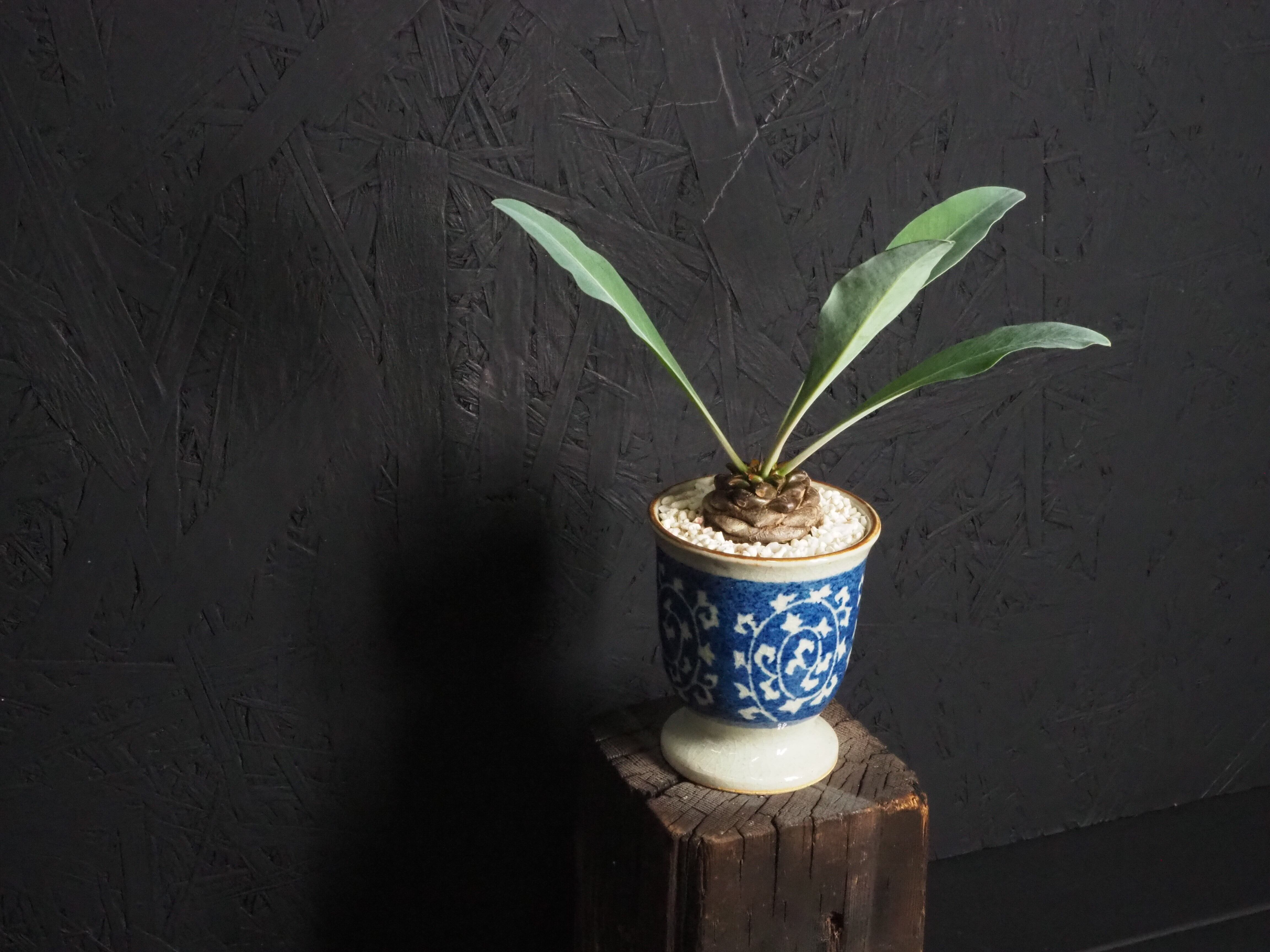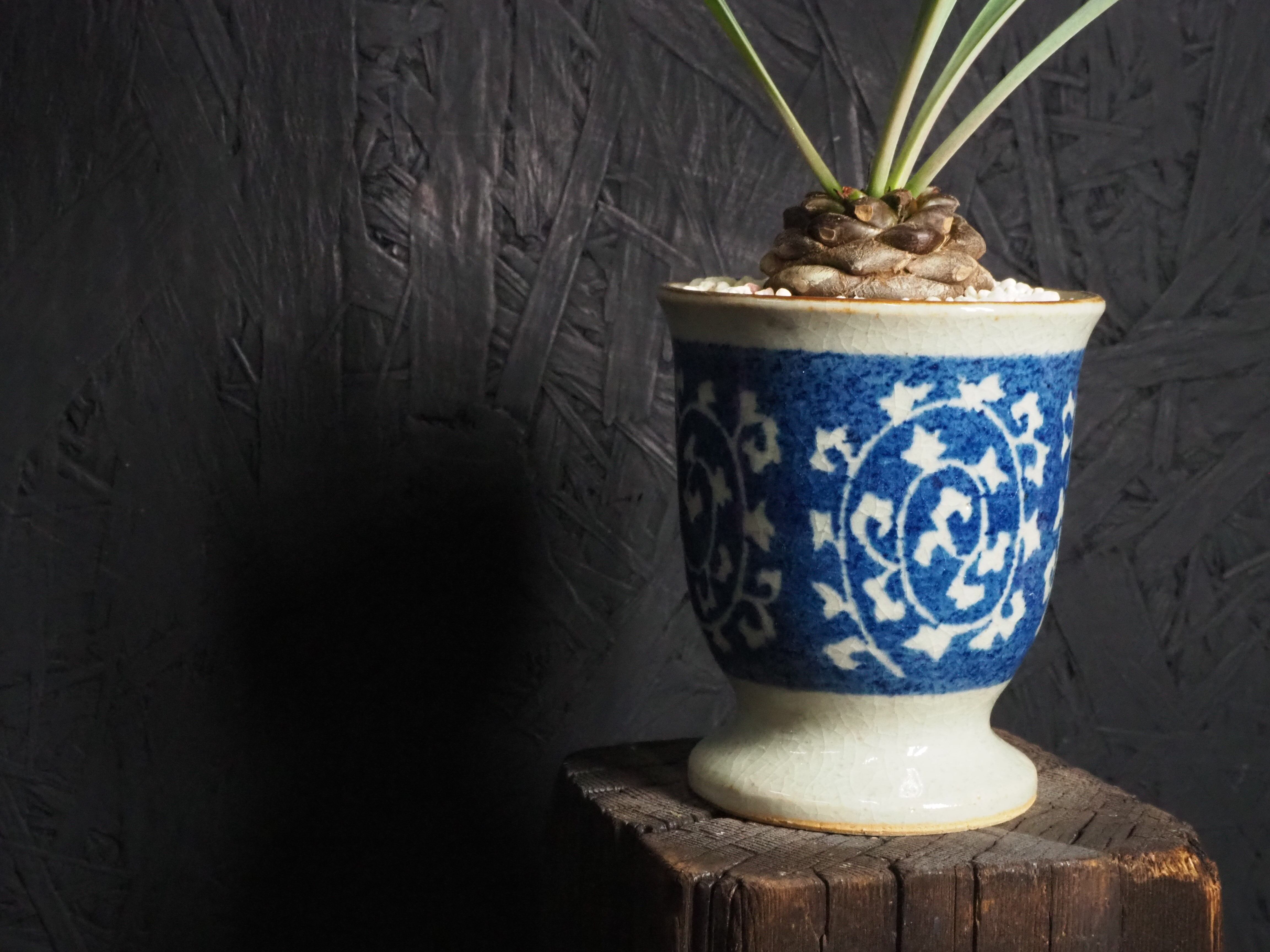 この鉄甲丸は実生二年生の個体で、まだミニサイズですがしっかりした幹を形成して立派な葉を展開しています。唐草柄のカップ形状湯呑みを鉢にお直しして鉄甲丸を合わせました。