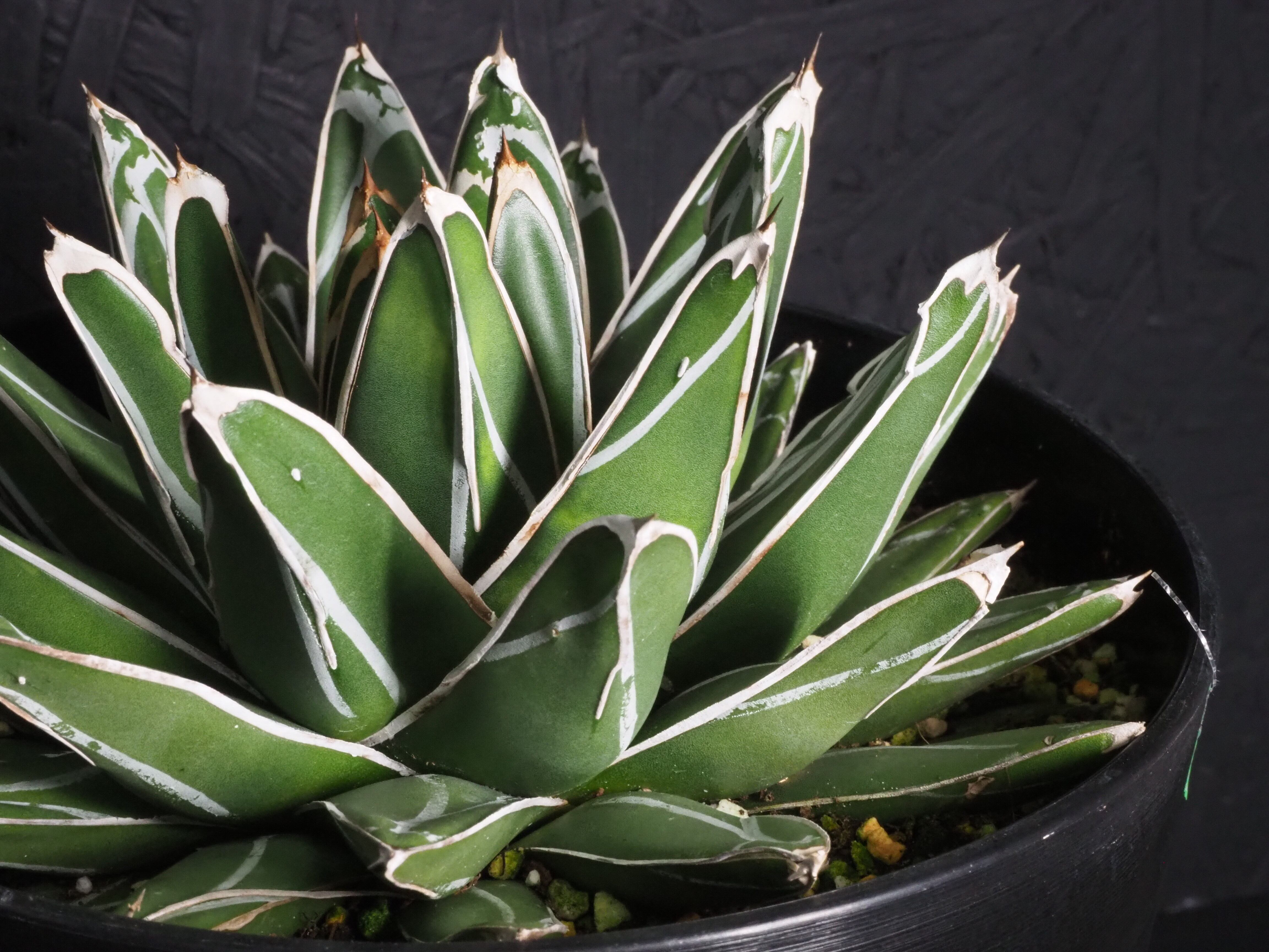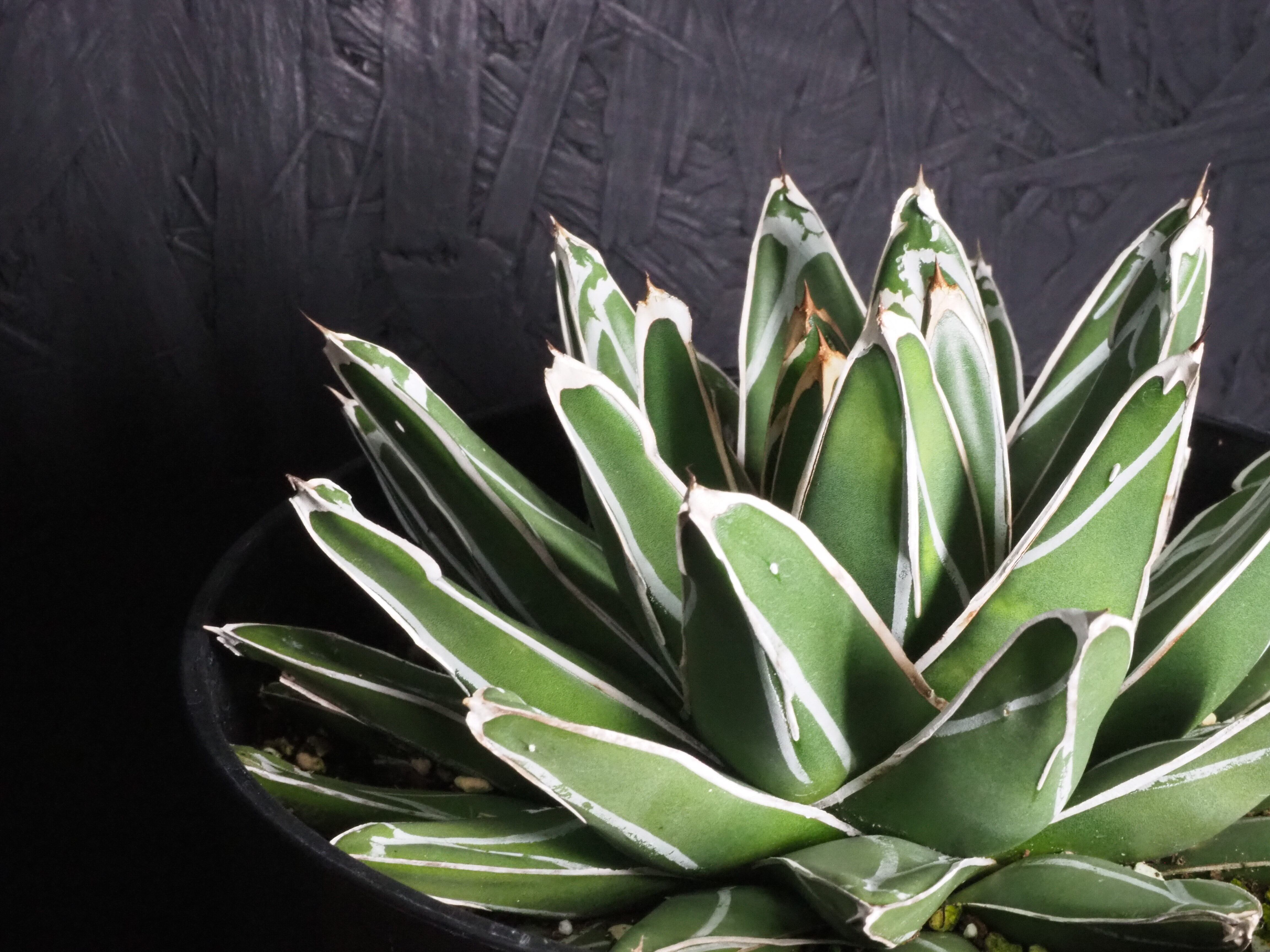 ペンキと呼ばれる白い模様が入る独特な特徴を持つ「笹の雪」。株の直径は最大で30~50cmくらいになるアガベ中型種です。ロゼット状の容姿を形成する美しいアガベです。